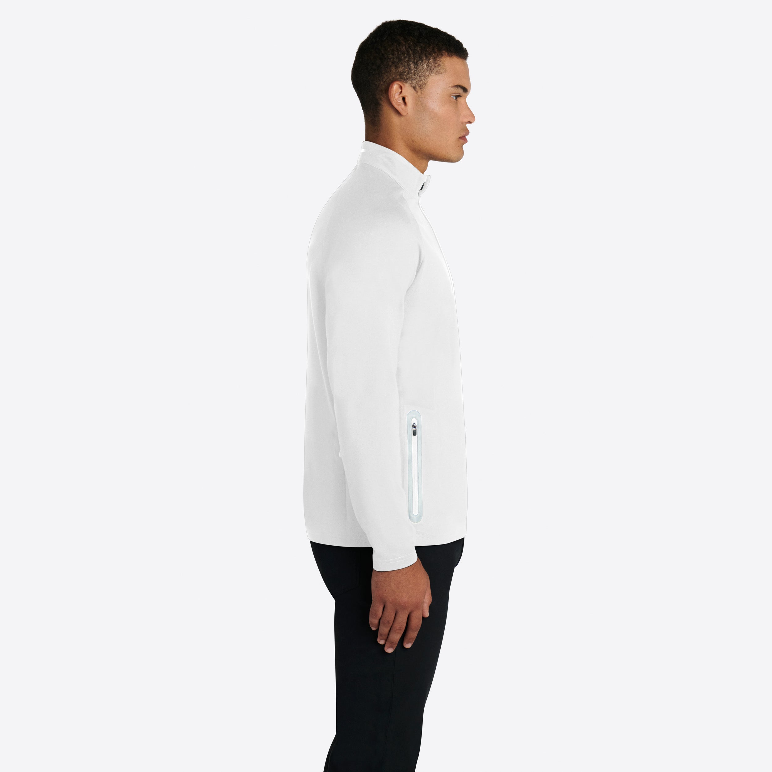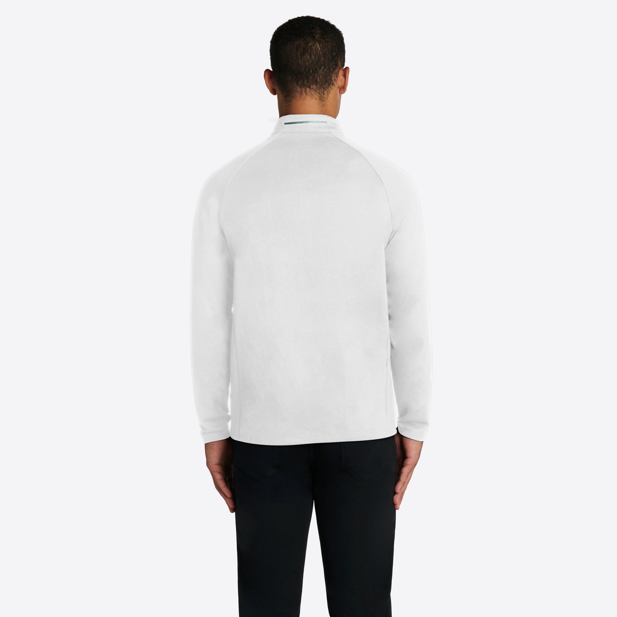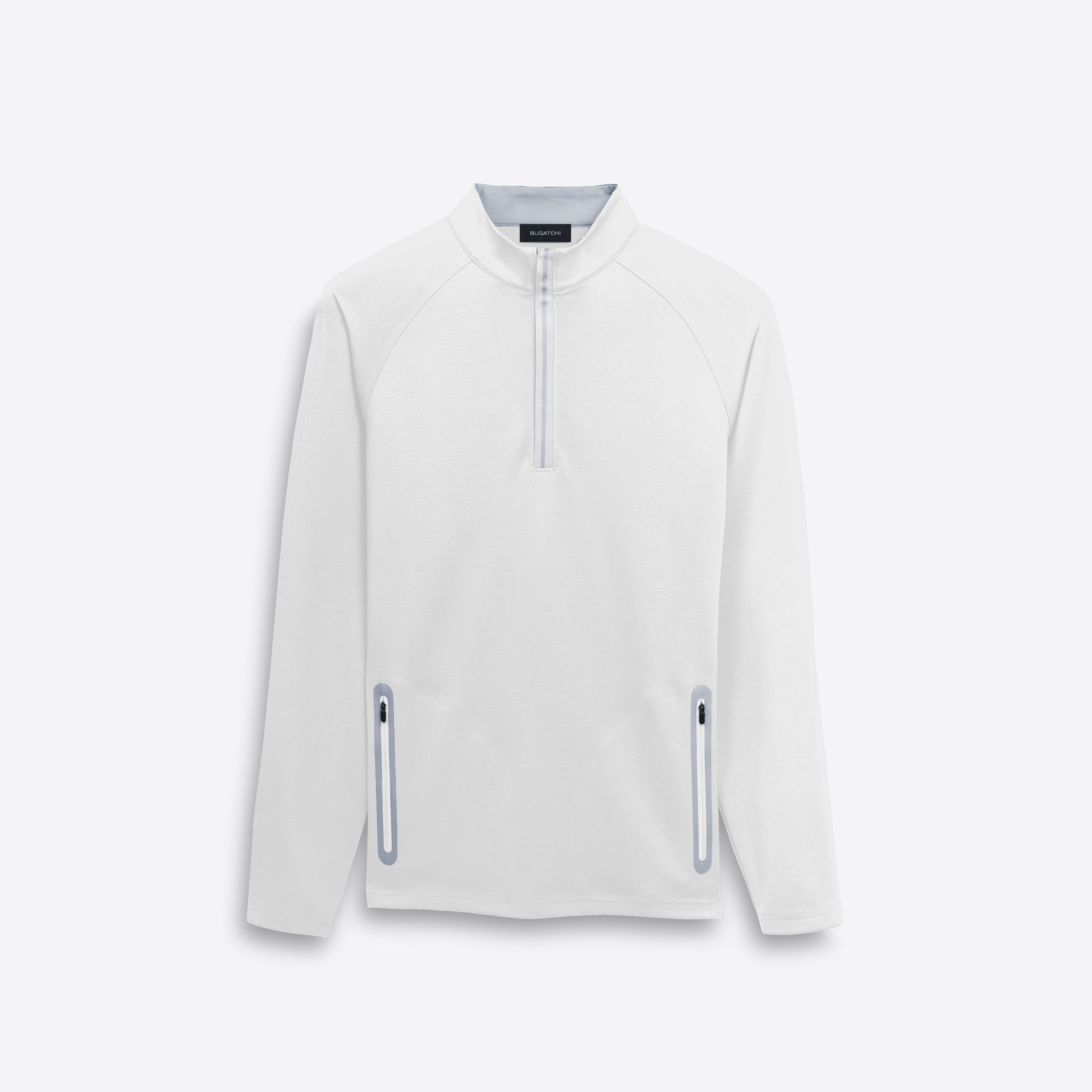 Solid performance quarter zip mock neck pullover with contrast trimmed zipper pockets.