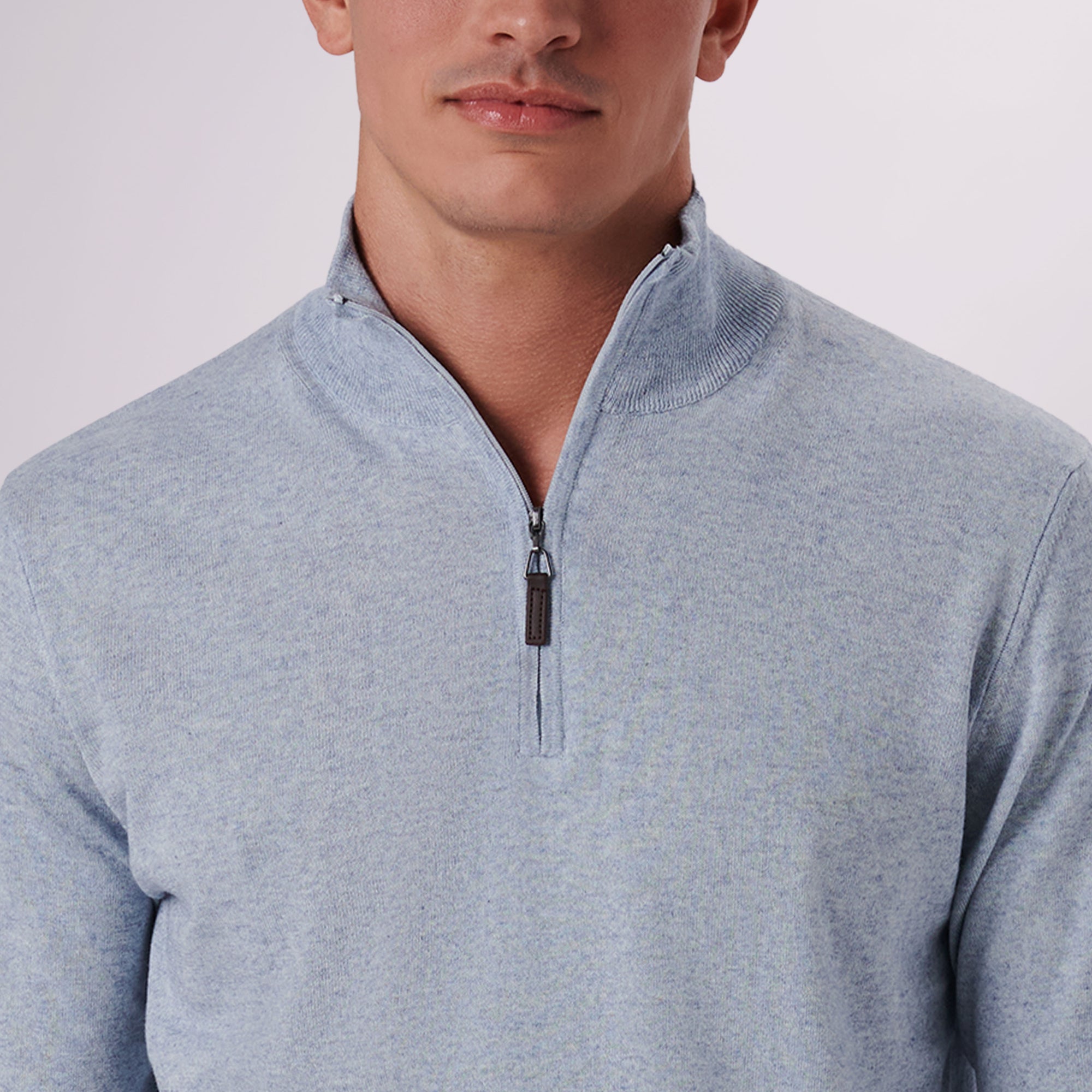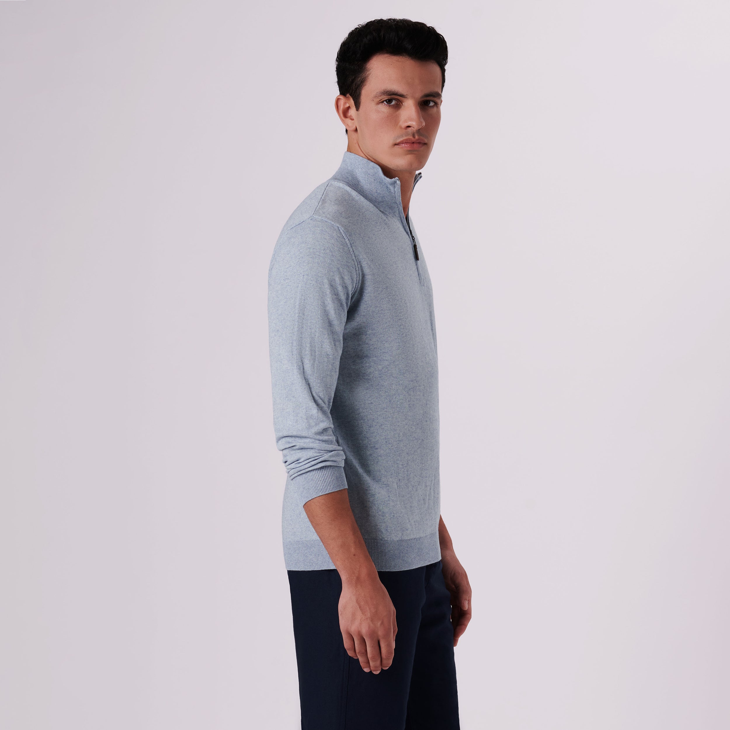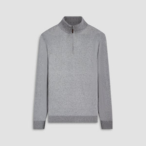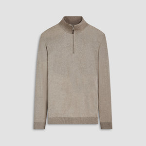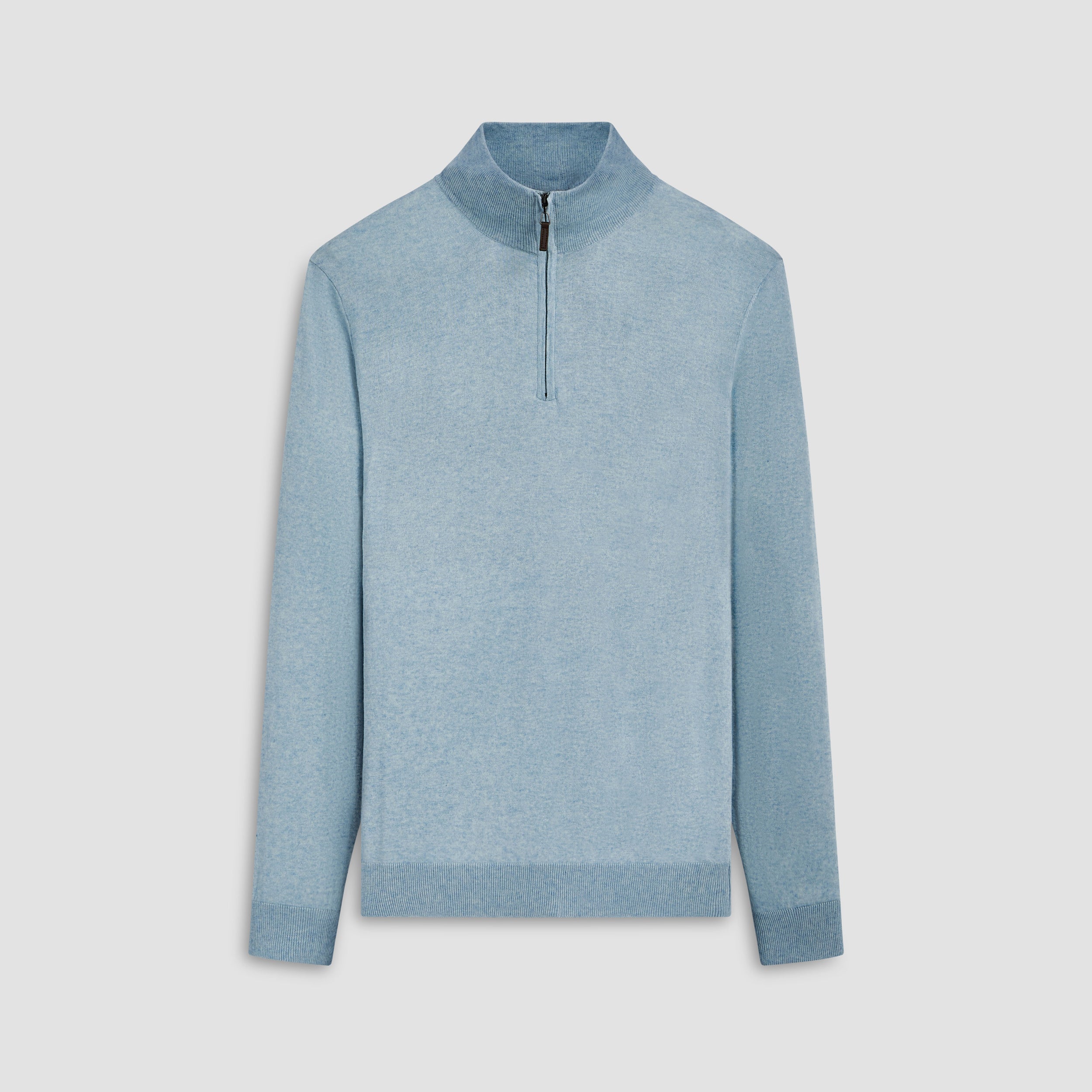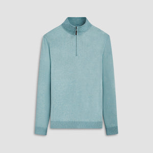 Solid long-sleeved quarter zip mock neck sweater in cotton and cashmere blend with rib knit collar, cuffs and waistband. Made in Italy.