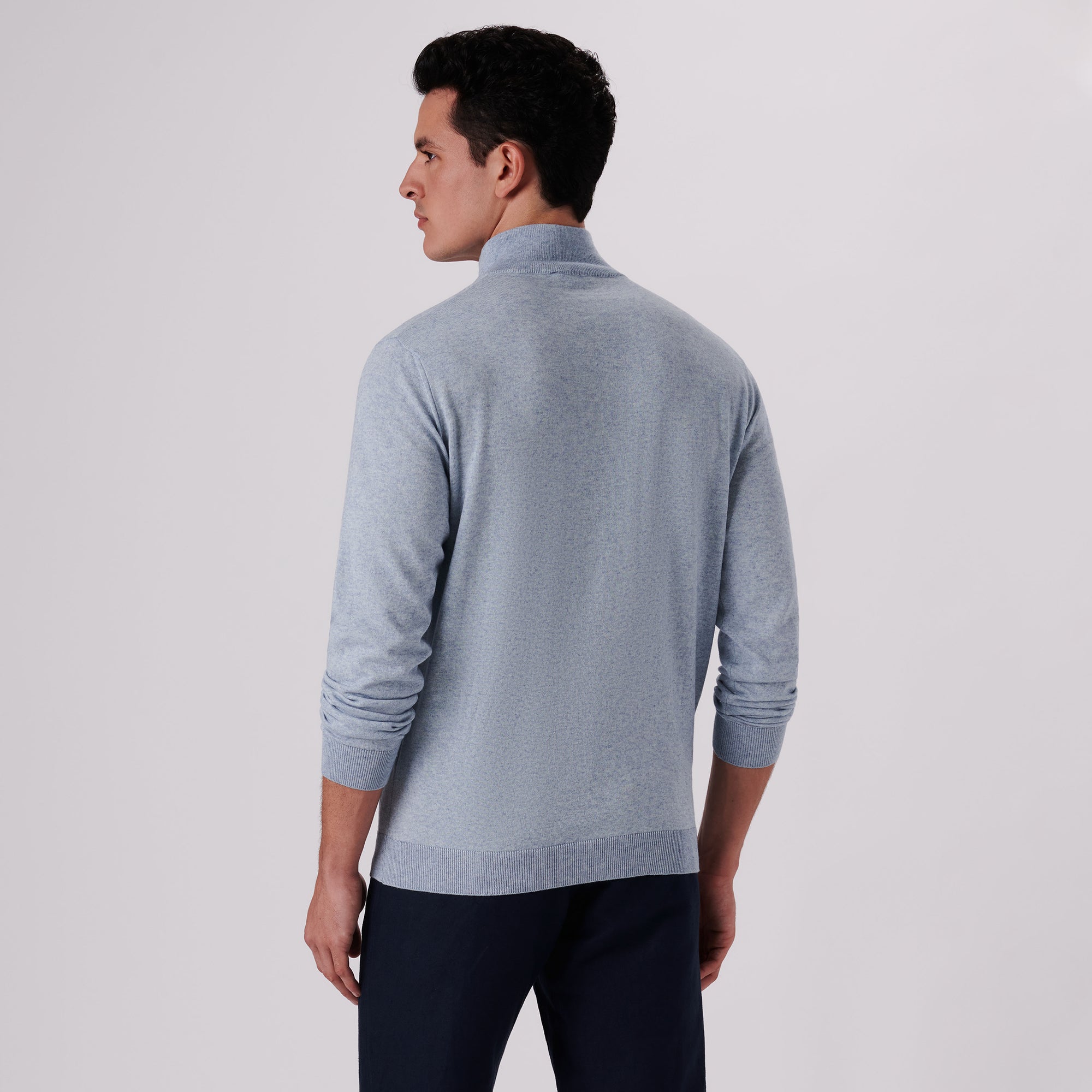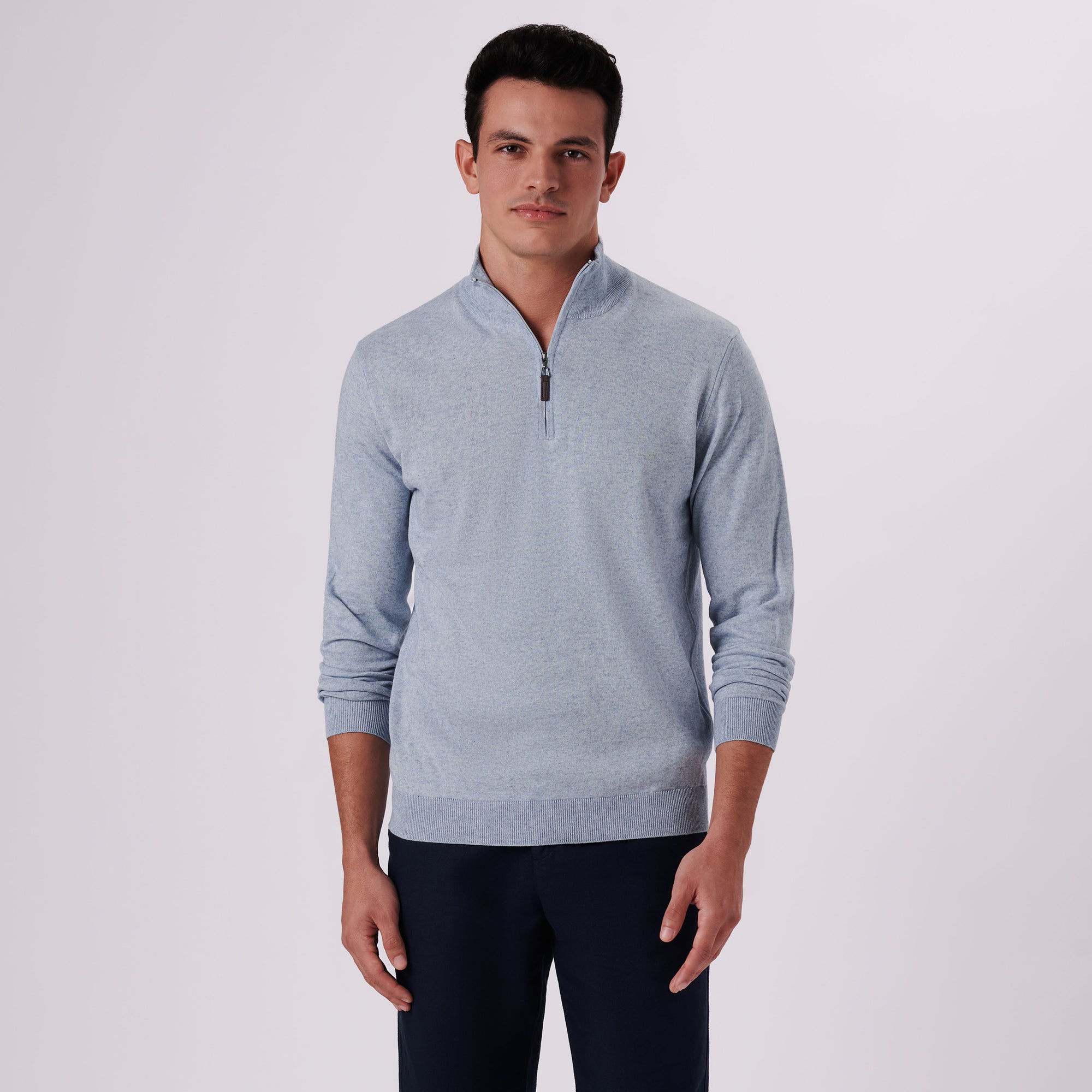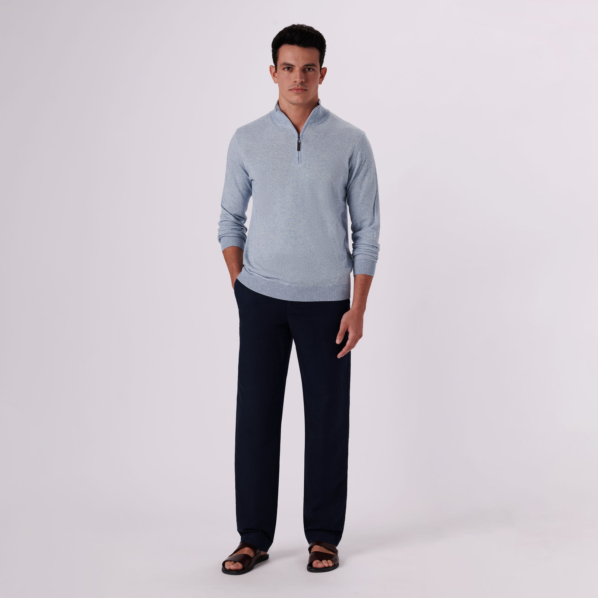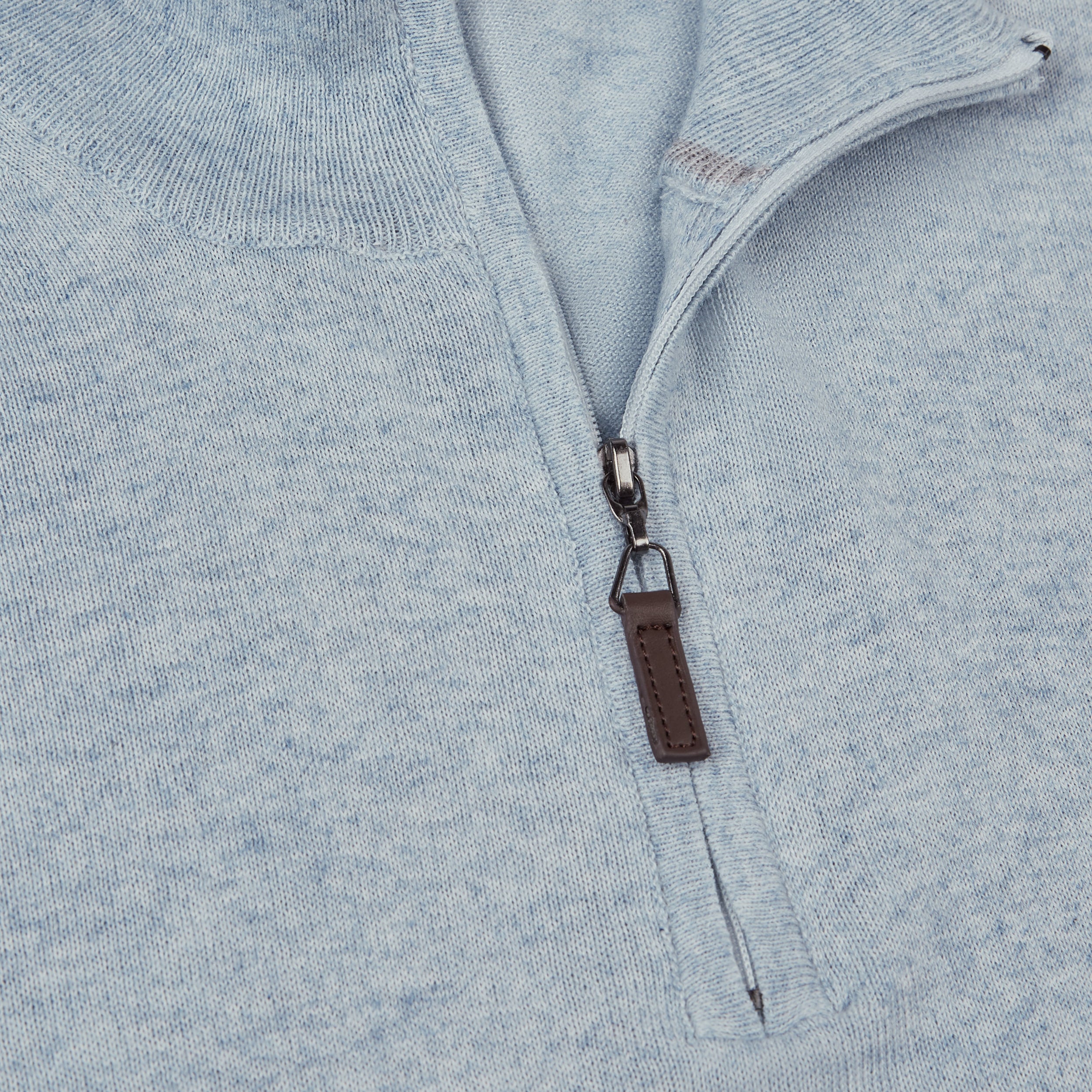 Solid long-sleeved quarter zip mock neck sweater in cotton and cashmere blend with rib knit collar, cuffs and waistband. Made in Italy.