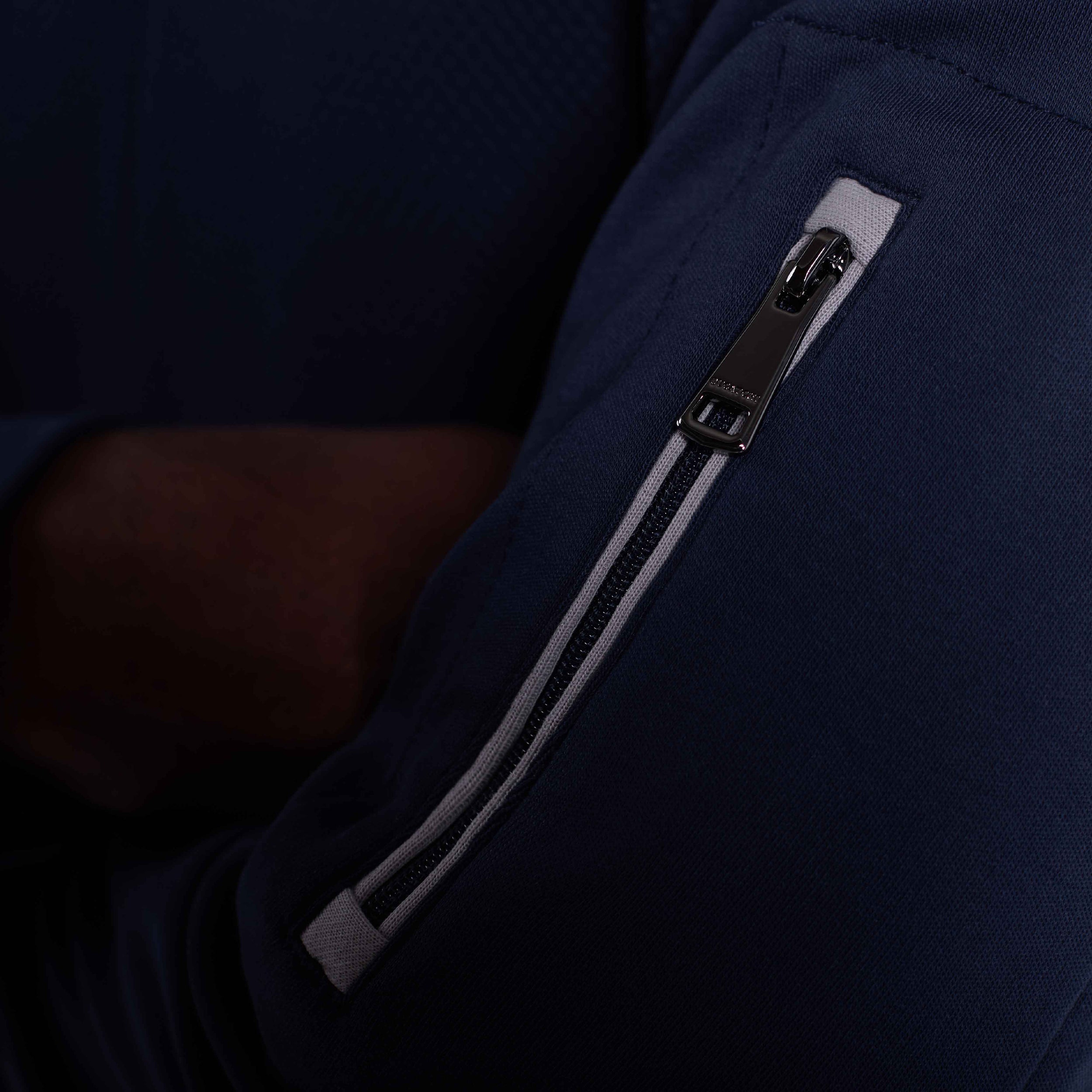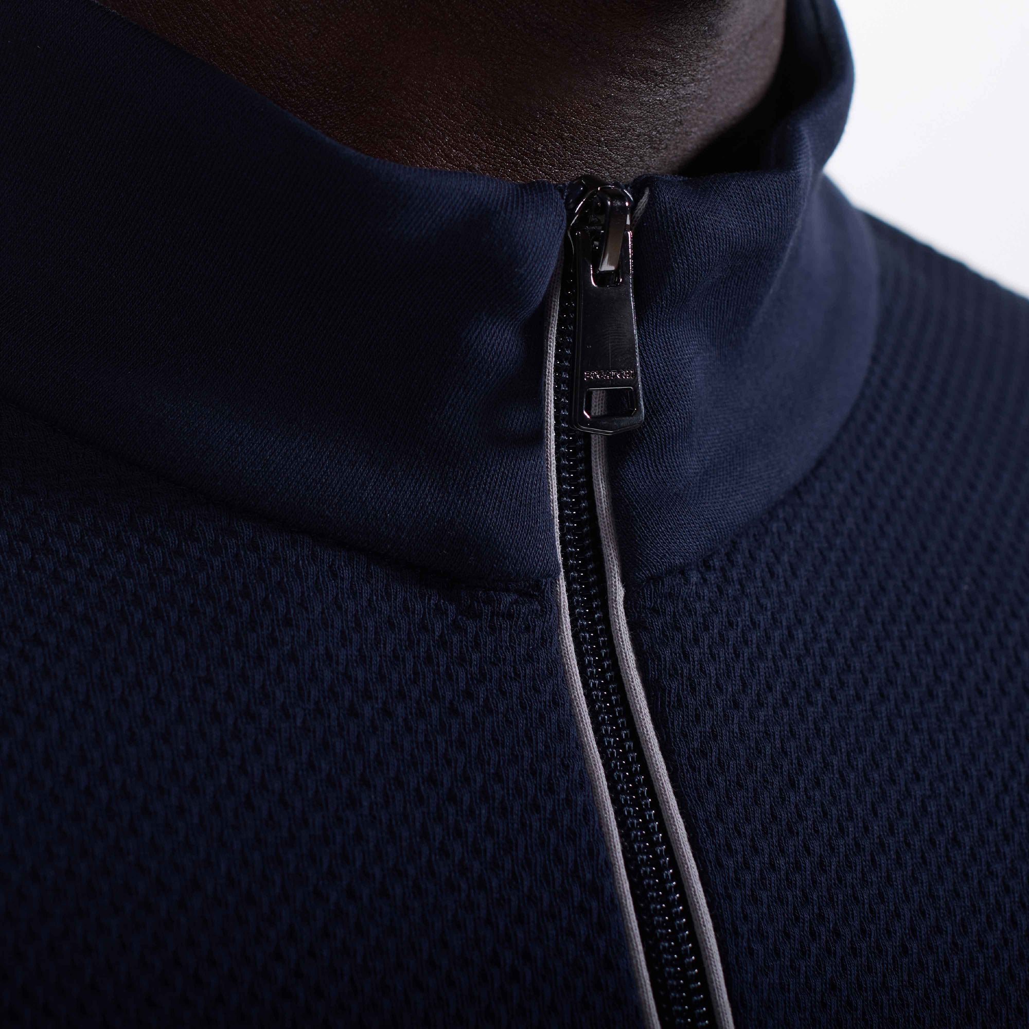 This long-sleeved pullover in 100% cotton features a beehive pattern front, a quarter zipper placket, a mock neck, a zippered sleeve pocket and contrast detail around the zippers. Made from double interlock cotton, it provides the perfect combination of softness, breathability and durability.
