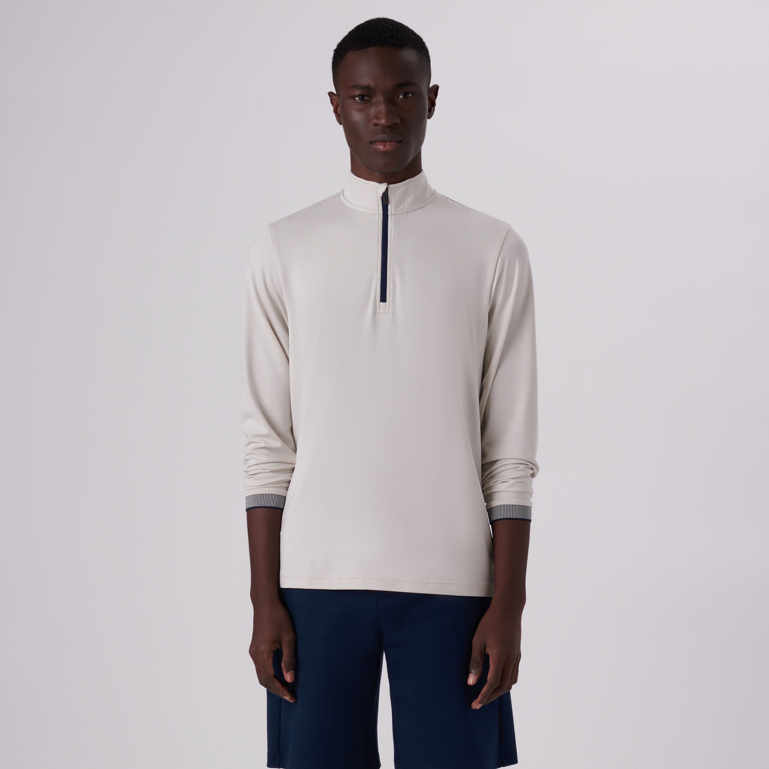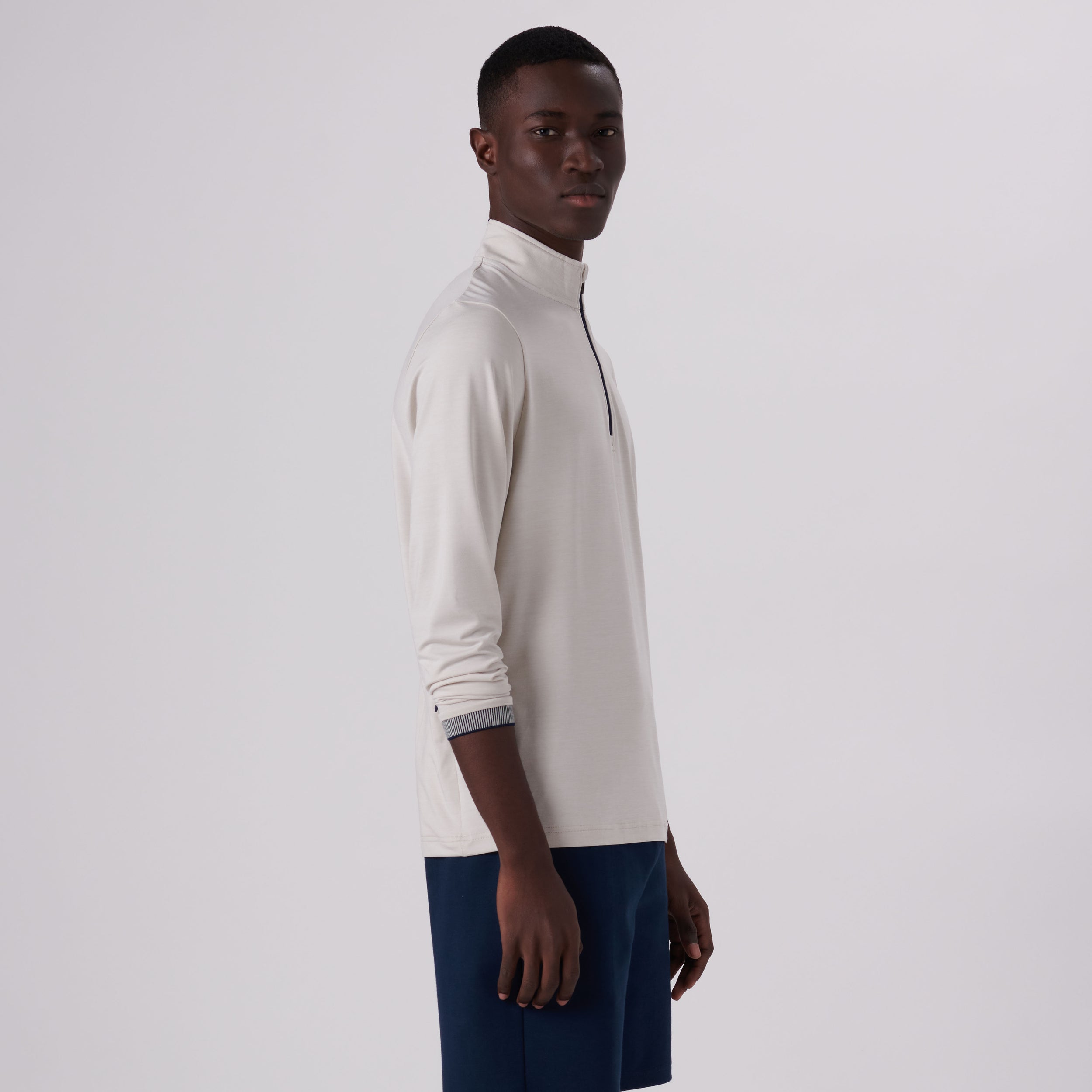 This long-sleeved pullover is crafted from high-performance fabric, offering comfort and style. It features a mock neck, quarter-zip closure, and eye-catching contrast trim detail. A versatile addition to your wardrobe.