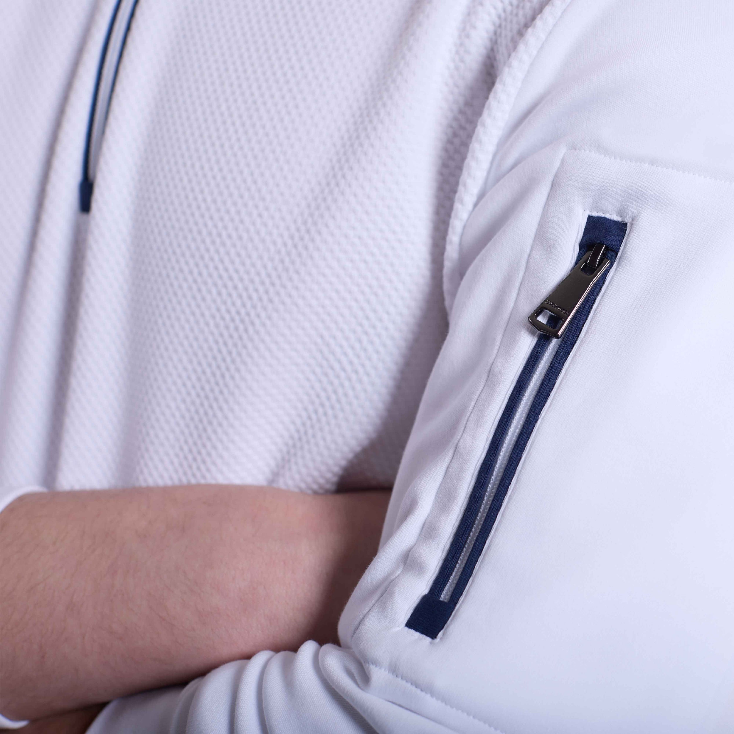 This long-sleeved pullover in 100% cotton features a beehive pattern front, a quarter zipper placket, a mock neck, a zippered sleeve pocket and contrast detail around the zippers. Made from double interlock cotton, it provides the perfect combination of softness, breathability and durability.