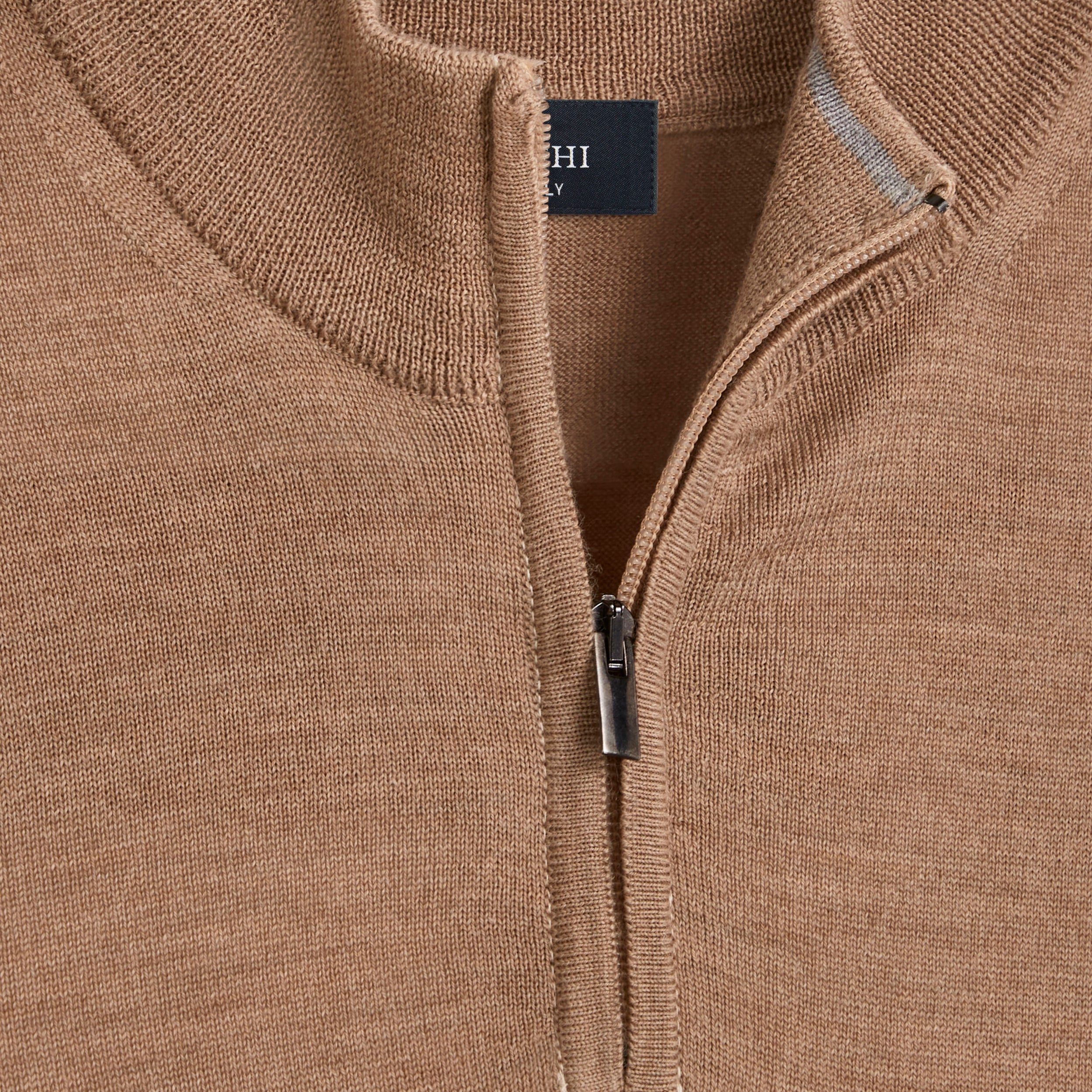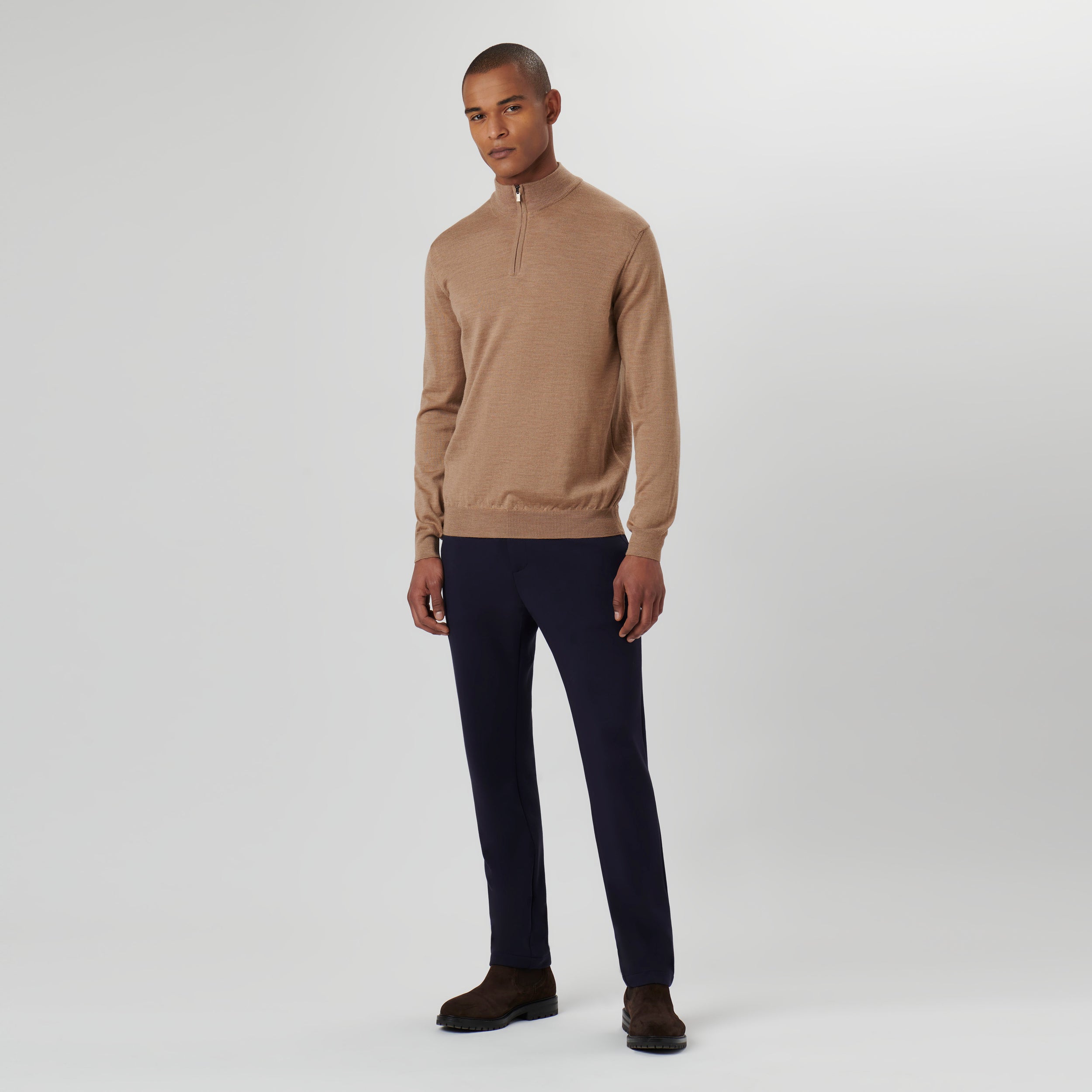 Solid pullover sweater in 100% extra fine merino wool with Harmony 4.0 special finishing, quarter zipper closure and rib knit mock neck, cuffs and waistband. This sweater is made with a high twist yarn that is breathable, hygroscopic, water repellent, machine washable and crease proof for long lasting performance wash after wash. Made in Italy.