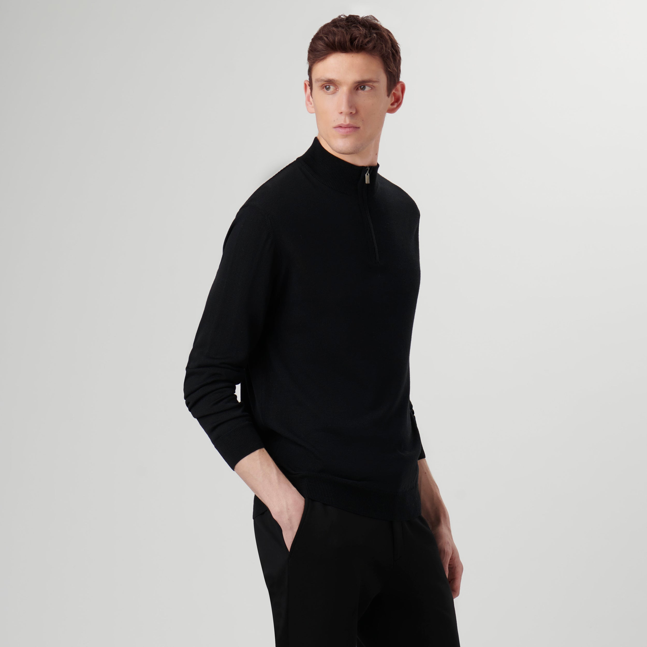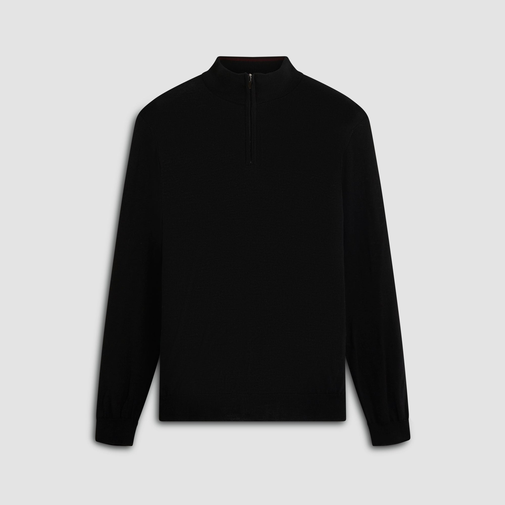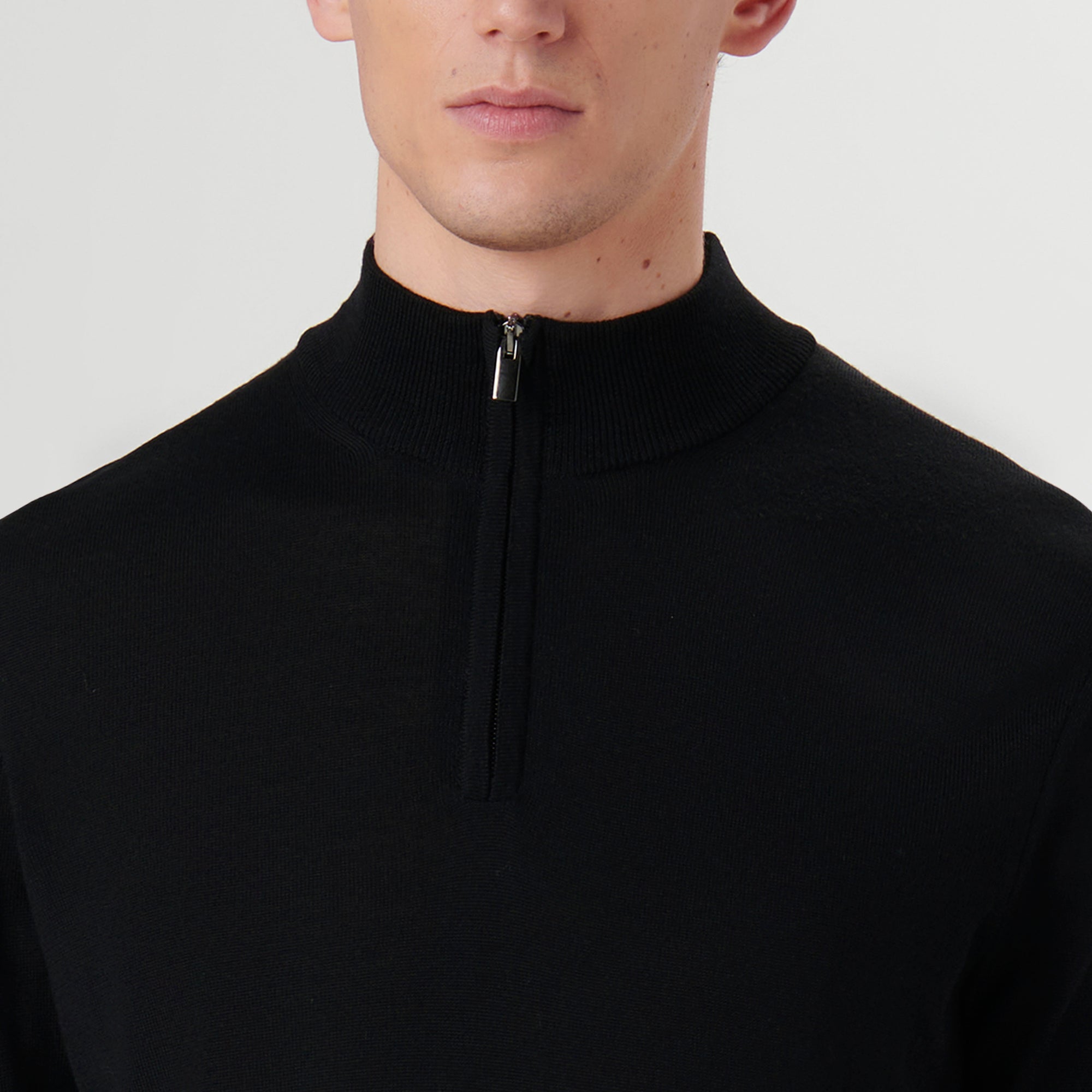 Solid pullover sweater in 100% extra fine merino wool with Harmony 4.0 special finishing, quarter zipper closure and rib knit mock neck, cuffs and waistband. This sweater is made with a high twist yarn that is breathable, hygroscopic, water repellent, machine washable and crease proof for long lasting performance wash after wash. Made in Italy.