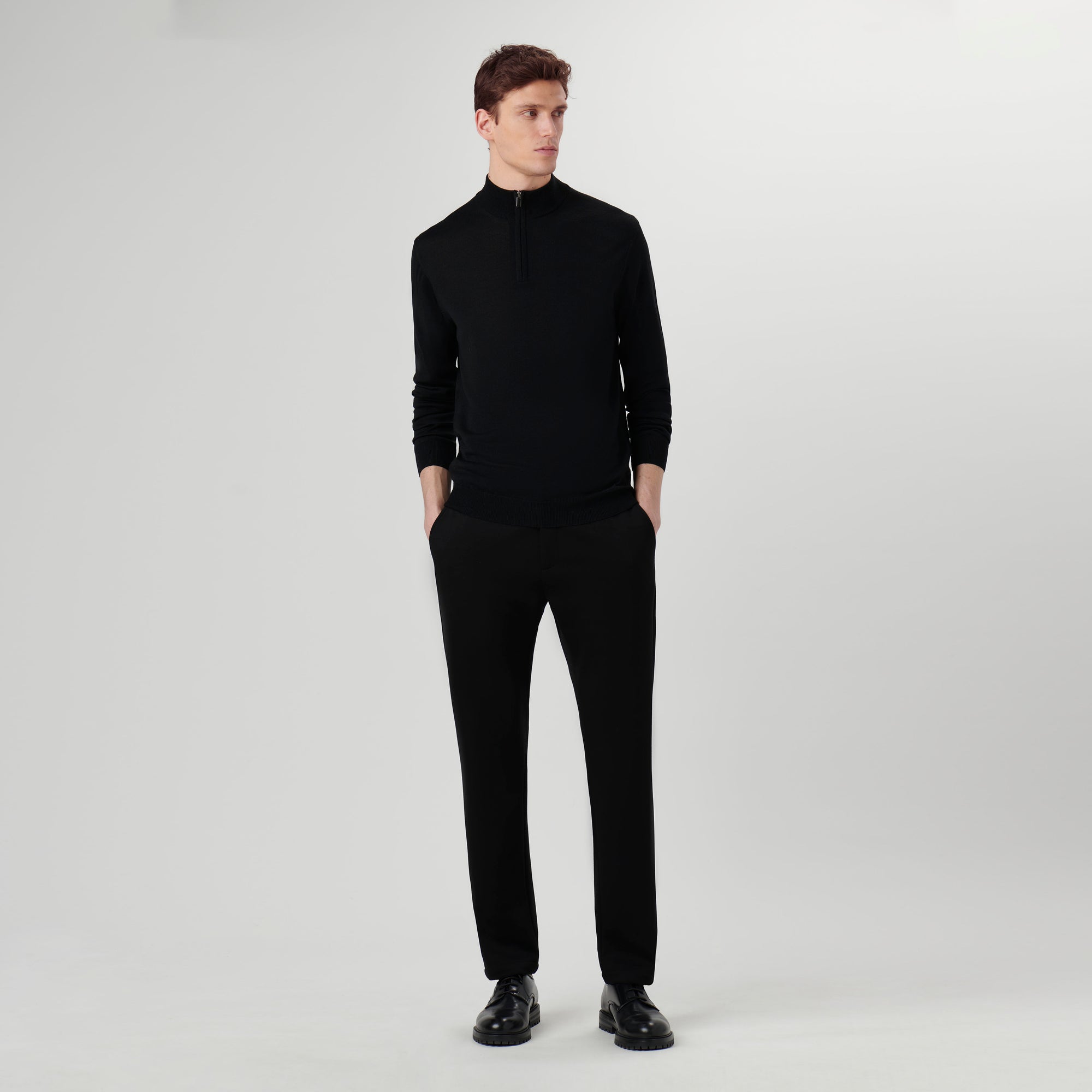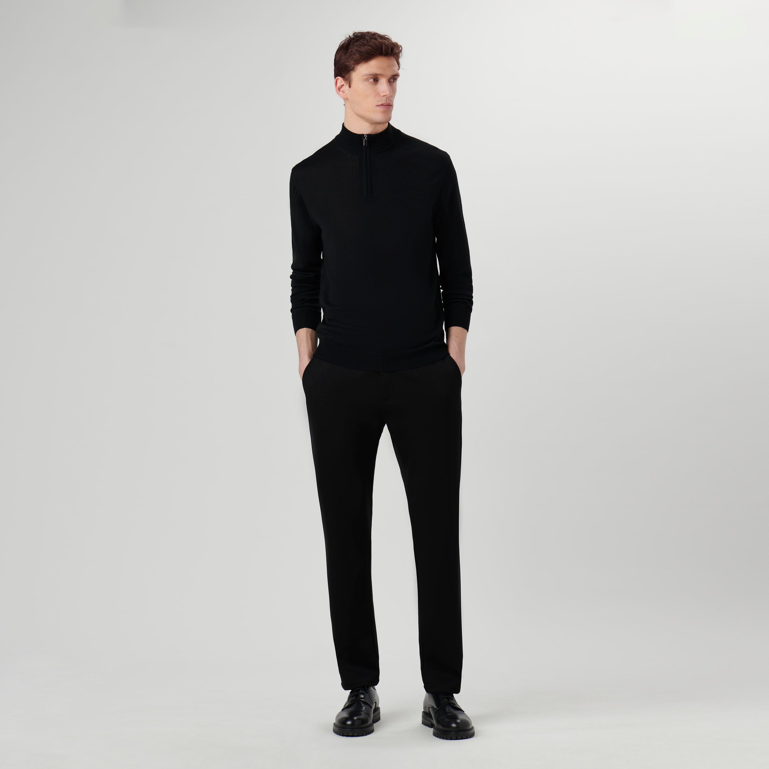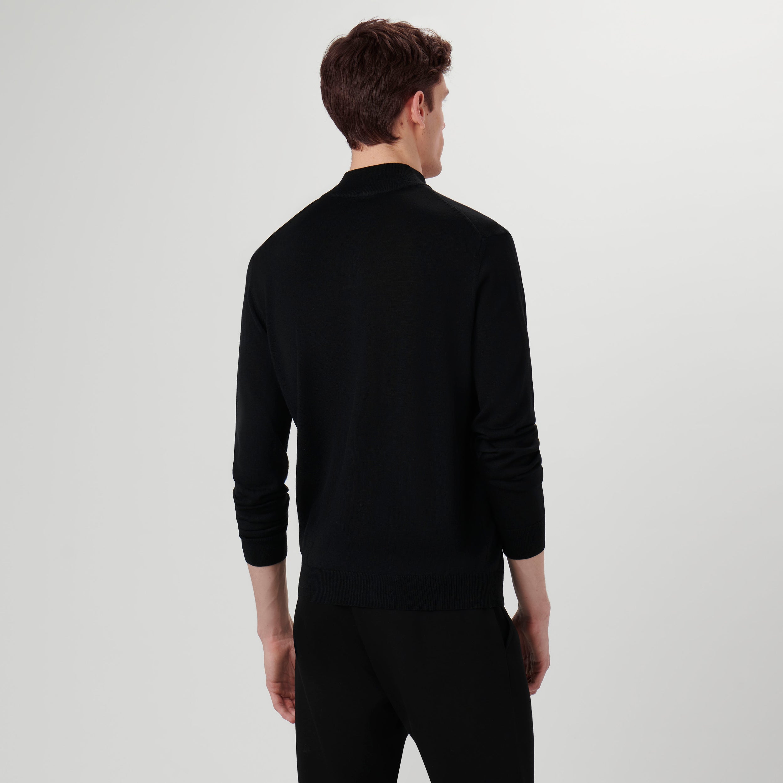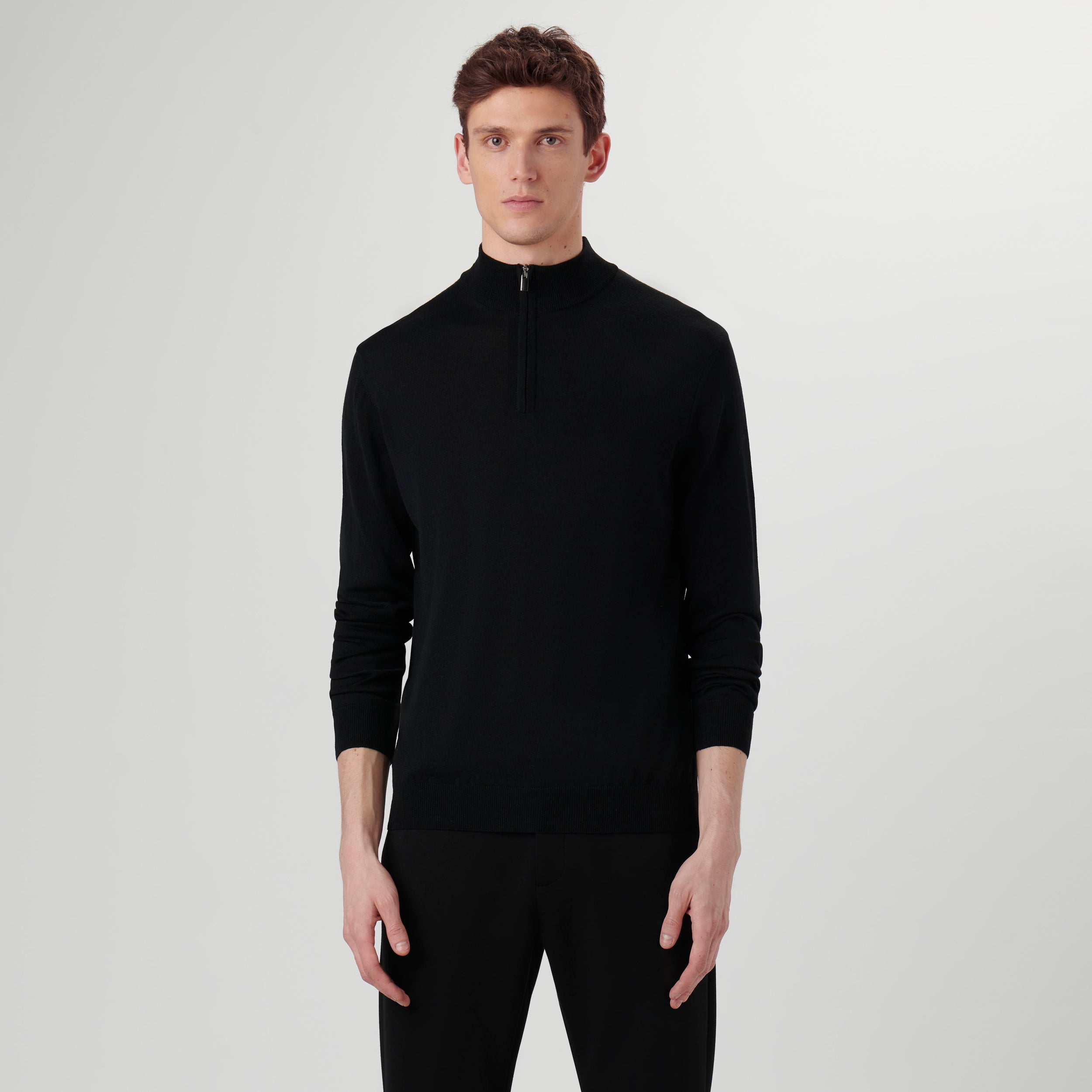 Solid pullover sweater in 100% extra fine merino wool with Harmony 4.0 special finishing, quarter zipper closure and rib knit mock neck, cuffs and waistband. This sweater is made with a high twist yarn that is breathable, hygroscopic, water repellent, machine washable and crease proof for long lasting performance wash after wash. Made in Italy.