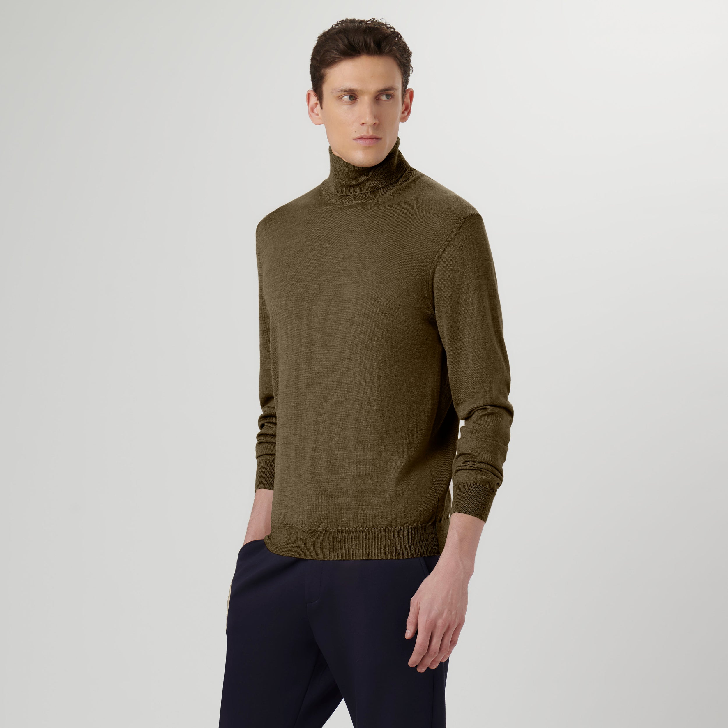 Solid pullover sweater in 100% extra fine merino wool with Harmony 4.0 special finishing and rib knit turtleneck, cuffs and waistband. This sweater is made with a high twist yarn that is breathable, hygroscopic, water repellent, machine washable and crease proof for long lasting performance wash after wash. Made in Italy.