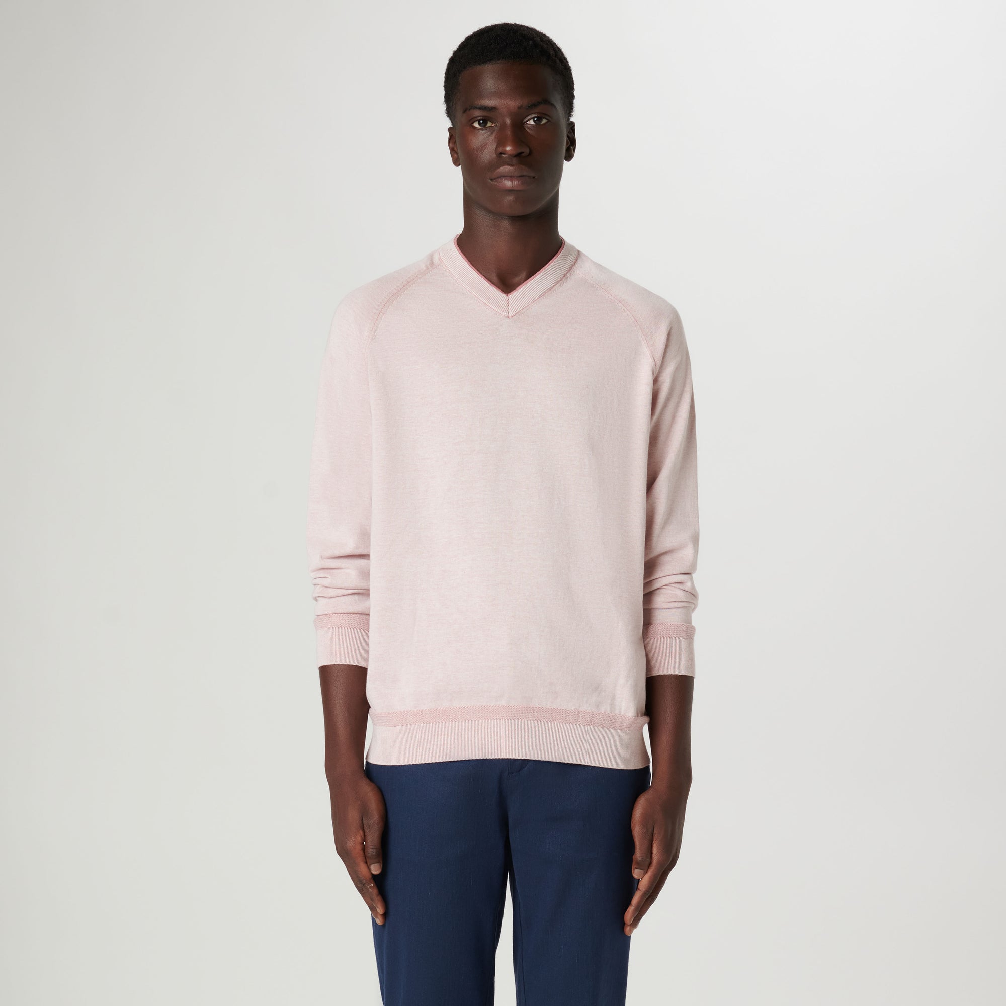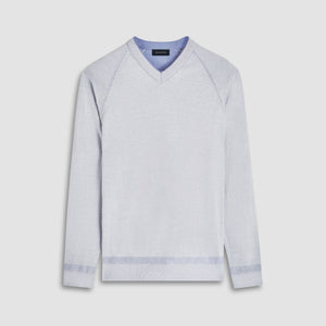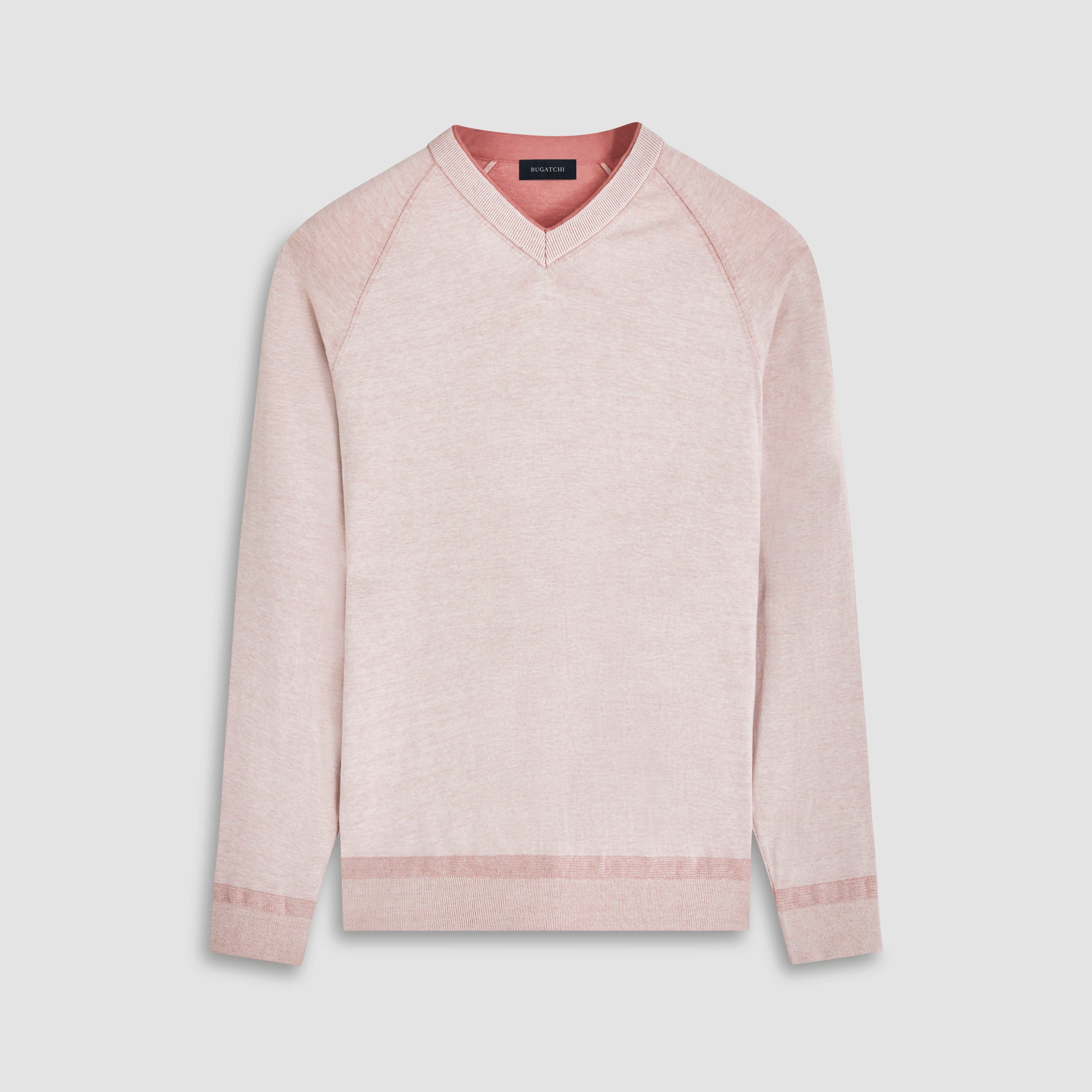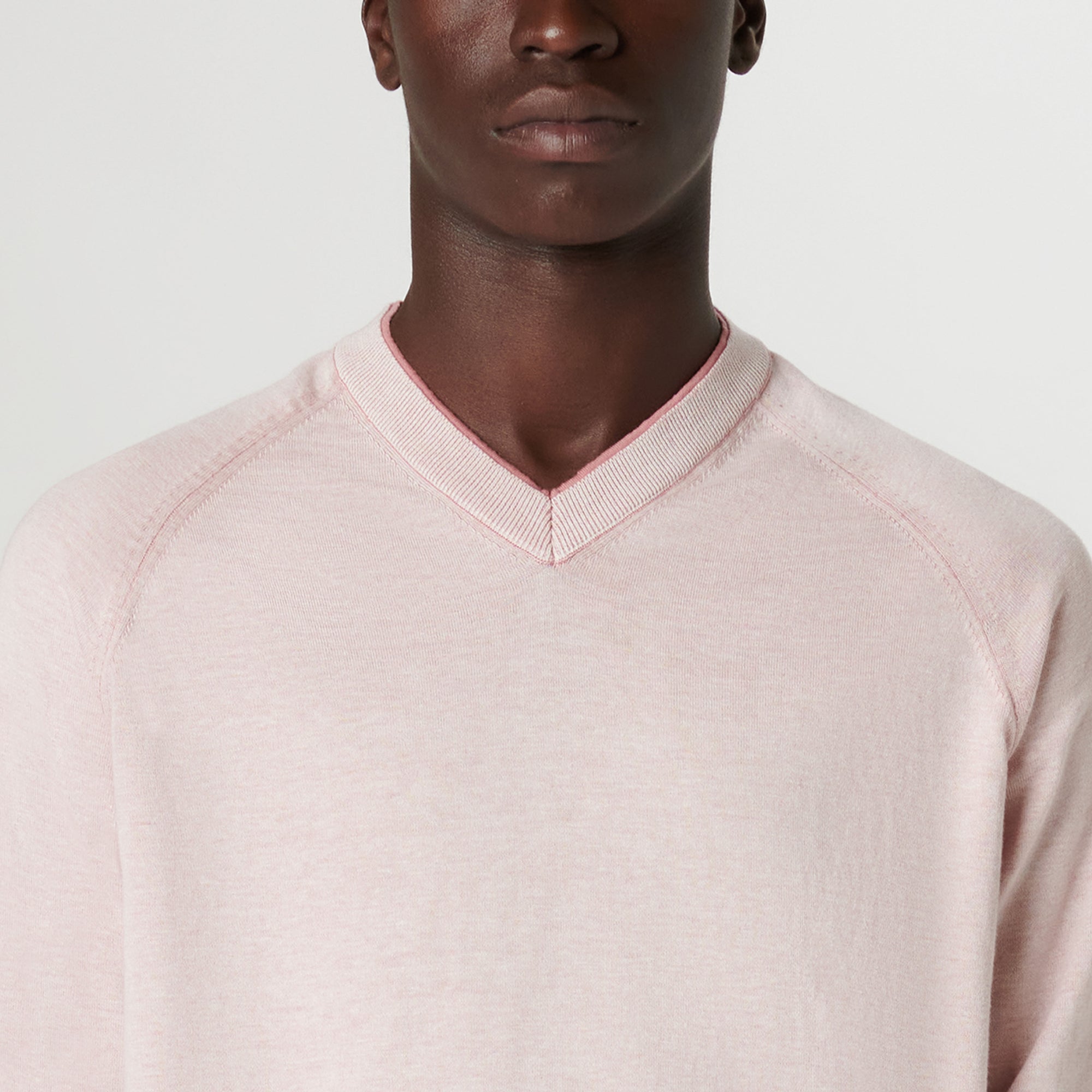 Crafted from a blend of cotton and silk yarns, this solid sweater features a rib V-neck, cuffs, and waistband. Lightweight, soft, and luxurious, this sweater is machine washable, low-pilling, and promises to retain its pristine appearance and refined quality over time.