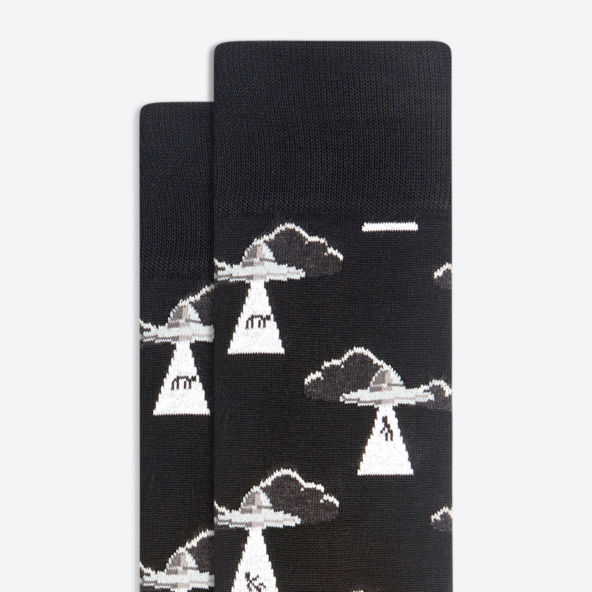 Space ship mid-calf socks in fine gauge mercerized cotton blend with rib knit cuff band, hand linked toe and reinforced heel seams. Made in Italy.