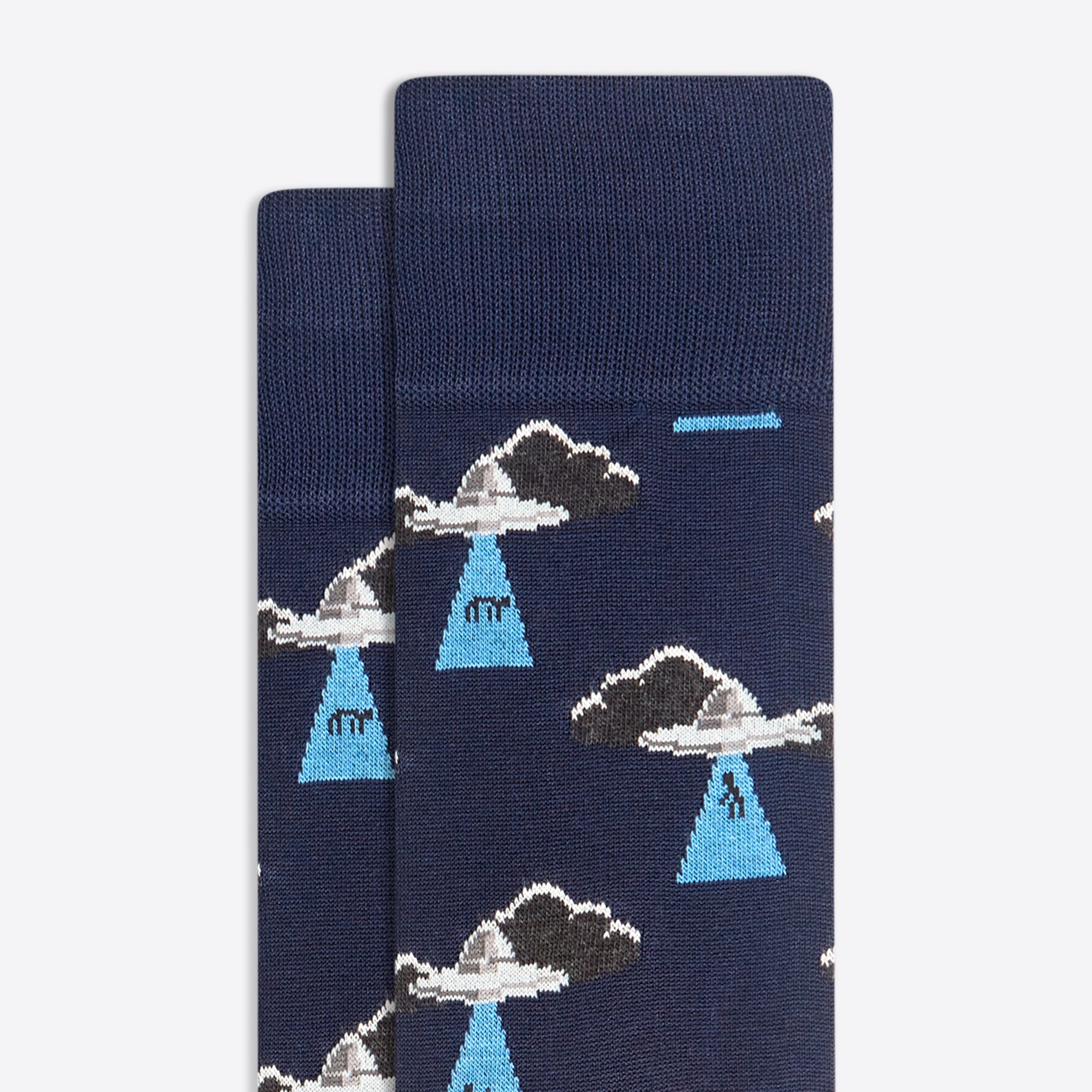 Space ship mid-calf socks in fine gauge mercerized cotton blend with rib knit cuff band, hand linked toe and reinforced heel seams. Made in Italy.