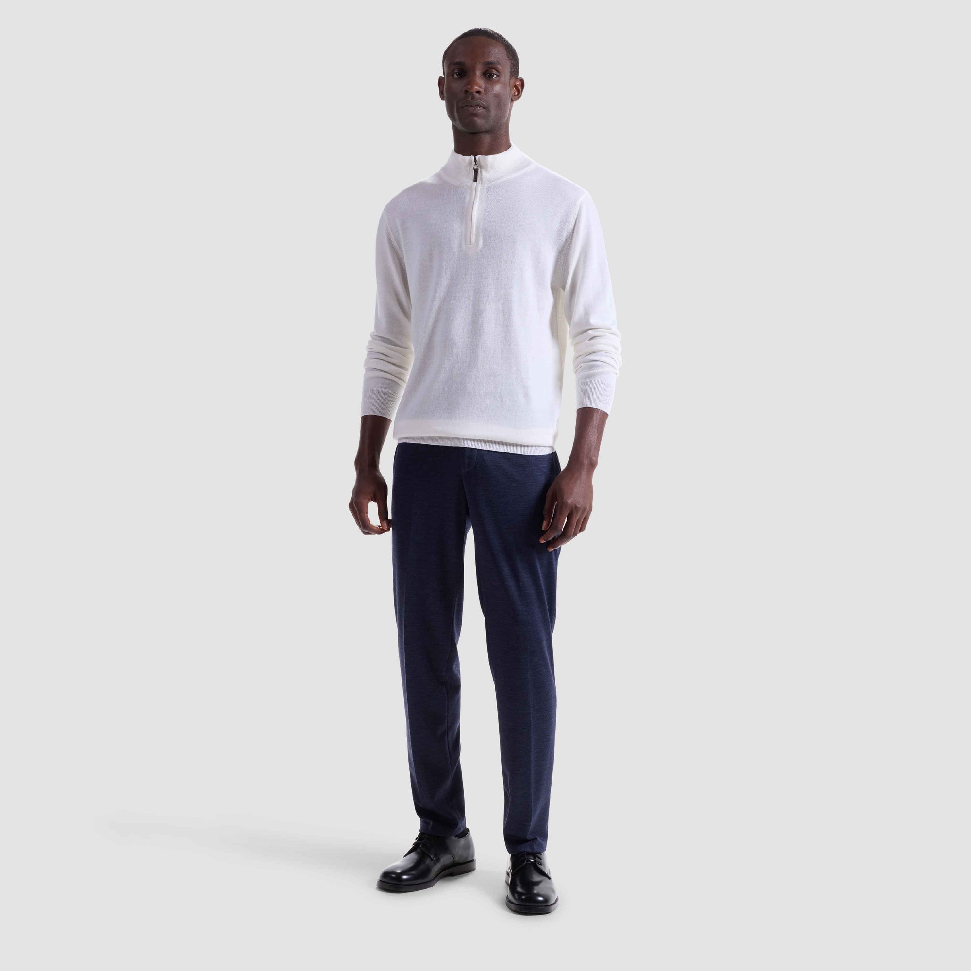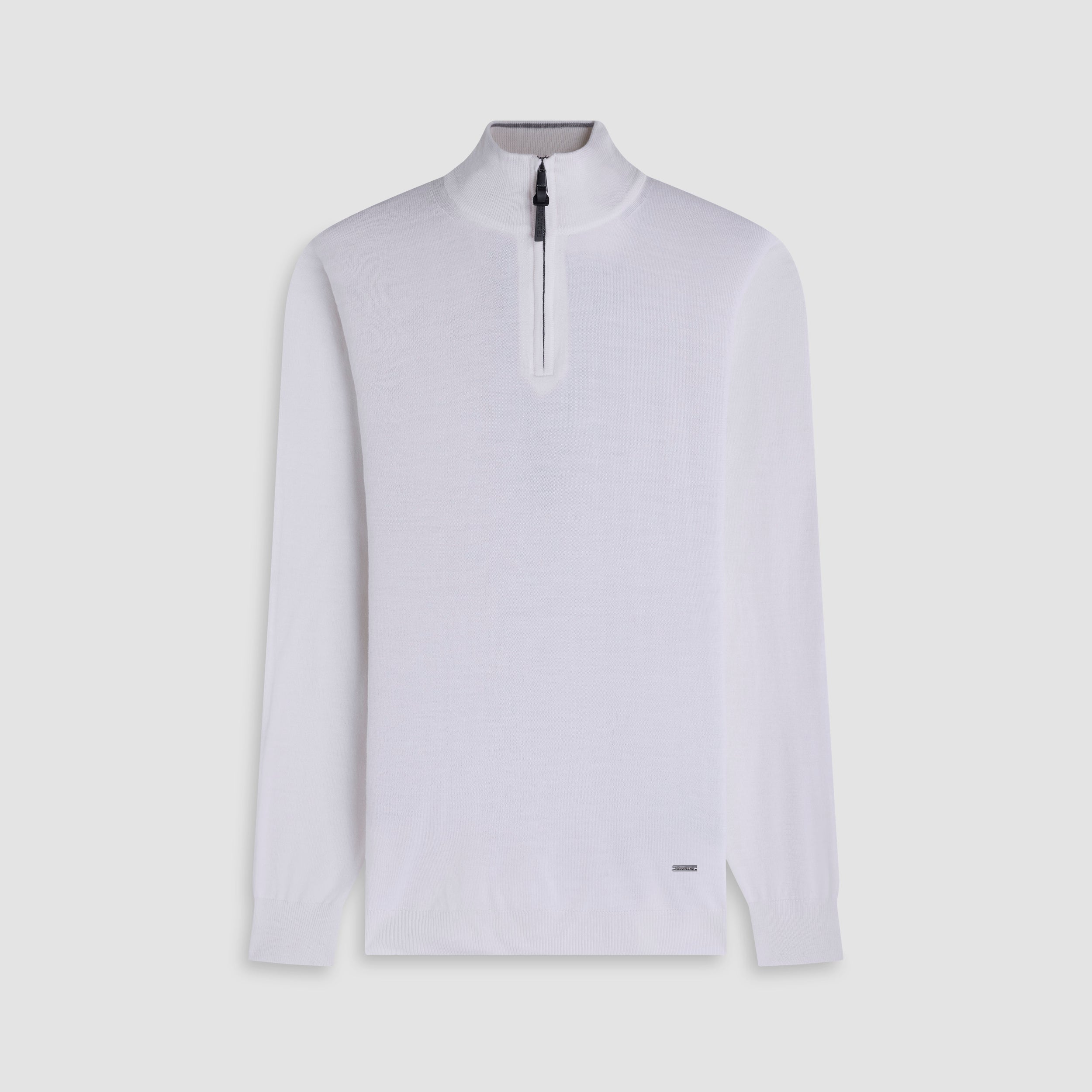 This quarter-zip sweater in 100% Super Merino wool with Harmony 4.0 special finishing is made in Italy and features a ribbed mock neck collar, sleeve cuffs and waistband. Super Merino wool is a high grade, extra fine, exceptionally soft wool that is breathable, moisture-wicking, water repellent, machine-washable, and crease-proof for long lasting performance wash after wash.