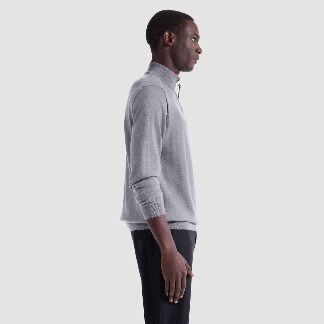 This quarter-zip sweater in 100% Super Merino wool with Harmony 4.0 special finishing is made in Italy and features a ribbed mock neck collar, sleeve cuffs and waistband. Super Merino wool is a high grade, extra fine, exceptionally soft wool that is breathable, moisture-wicking, water repellent, machine-washable, and crease-proof for long lasting performance wash after wash.