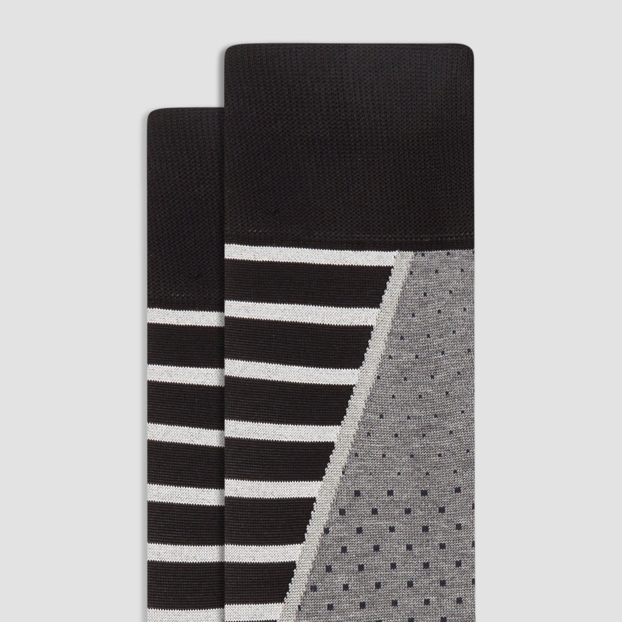 Stripe and dot mid-calf socks in fine gauge mercerized cotton blend with rib knit cuff band, hand linked toe and reinforced heel seams. Made in Italy.