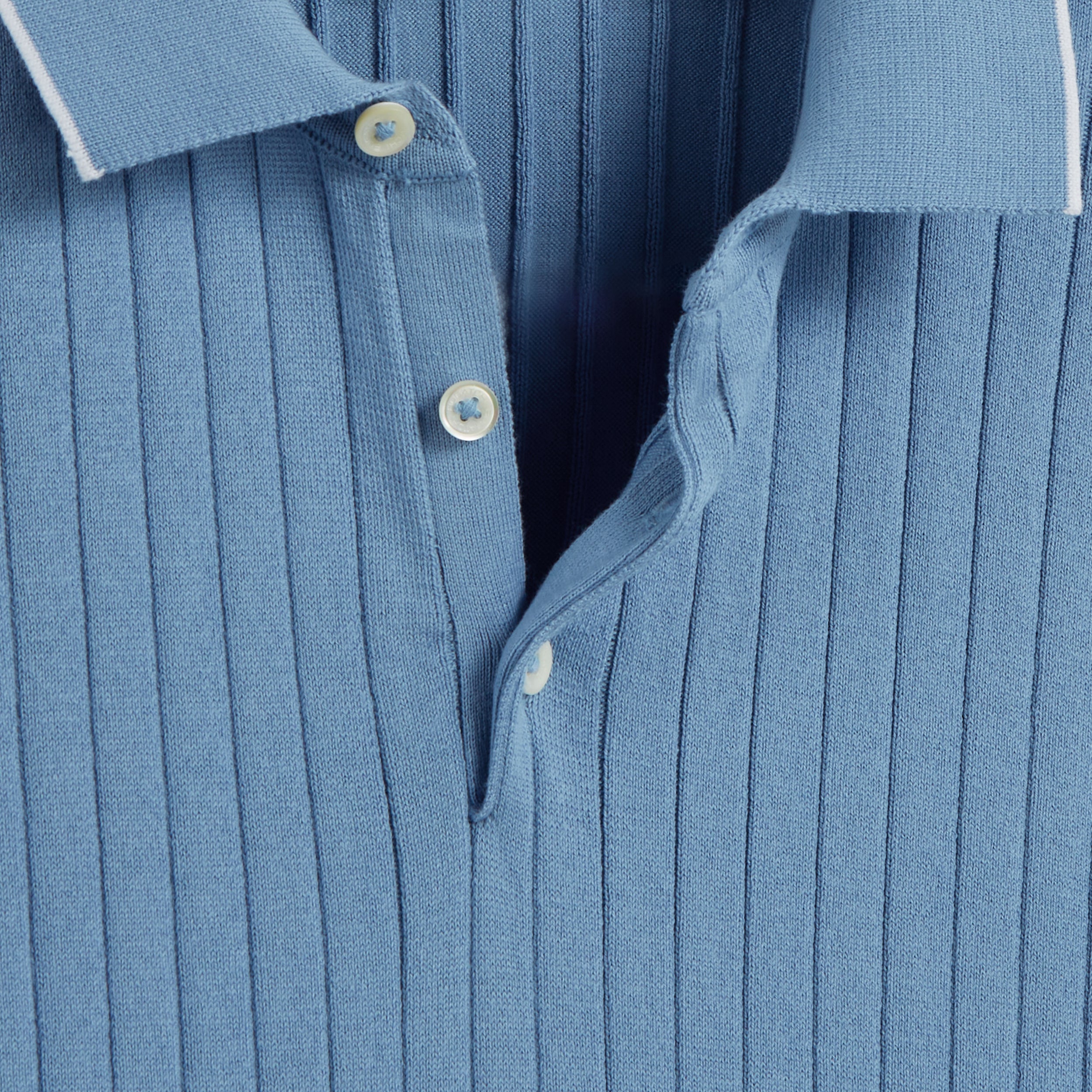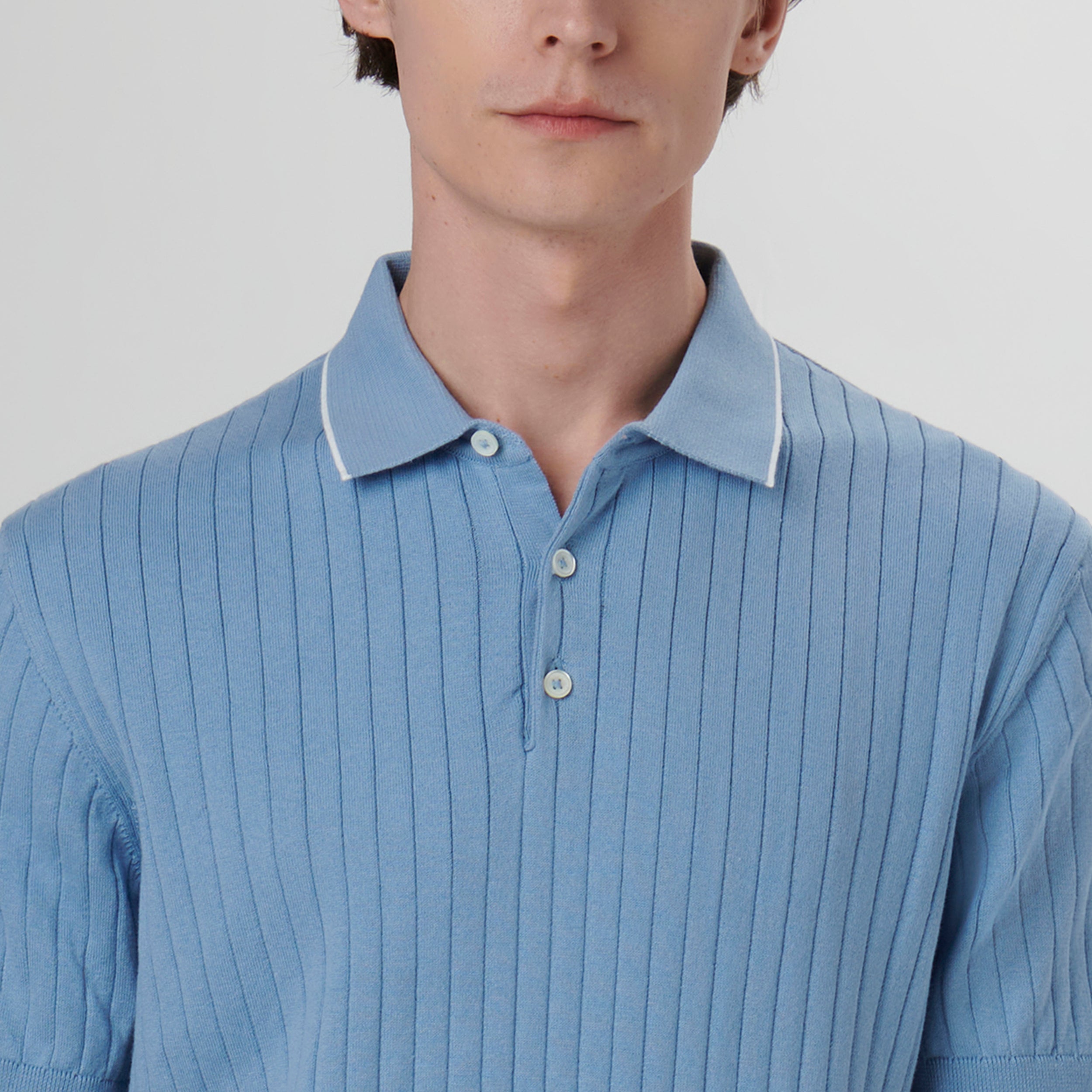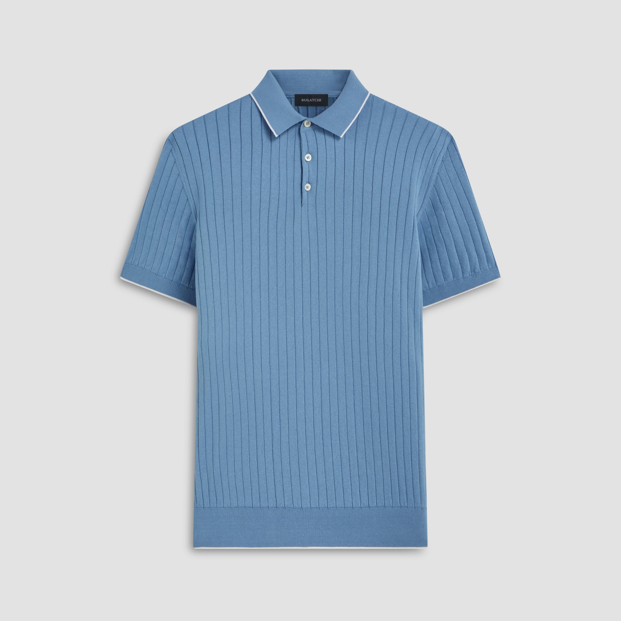 Short-sleeved solid vertical stripe stitch knit polo in cotton blend with three button placket and contrast tipped collar and armbands.