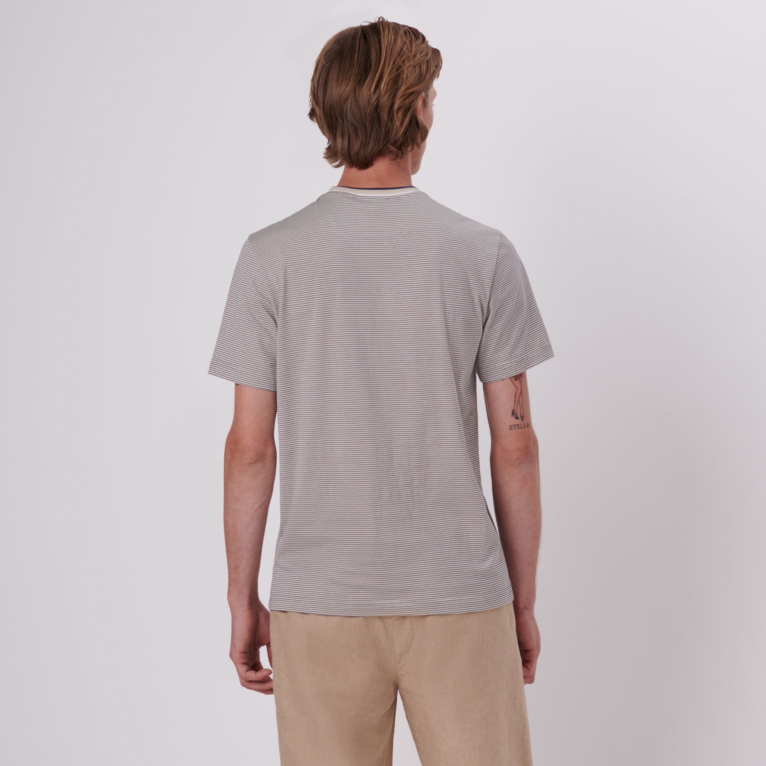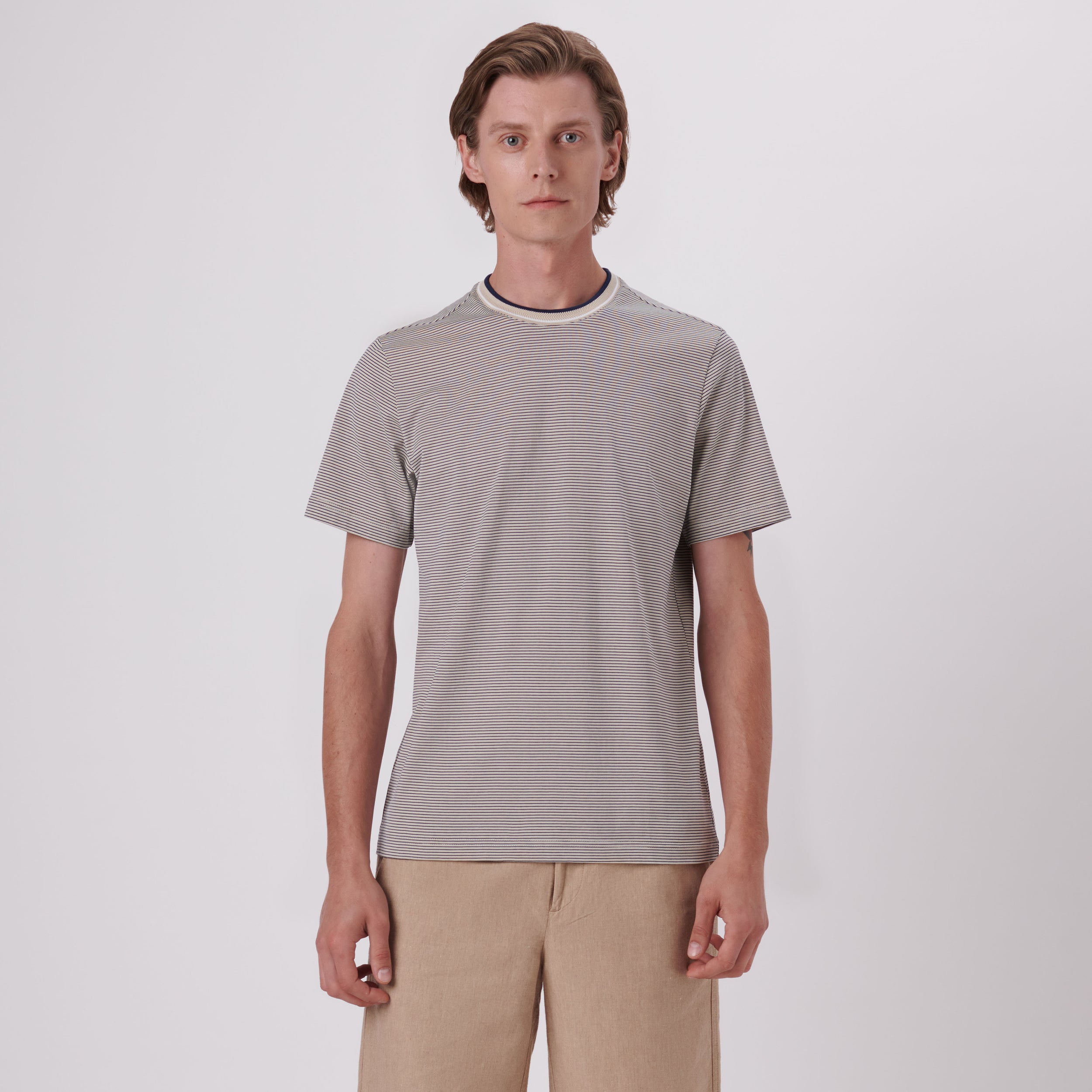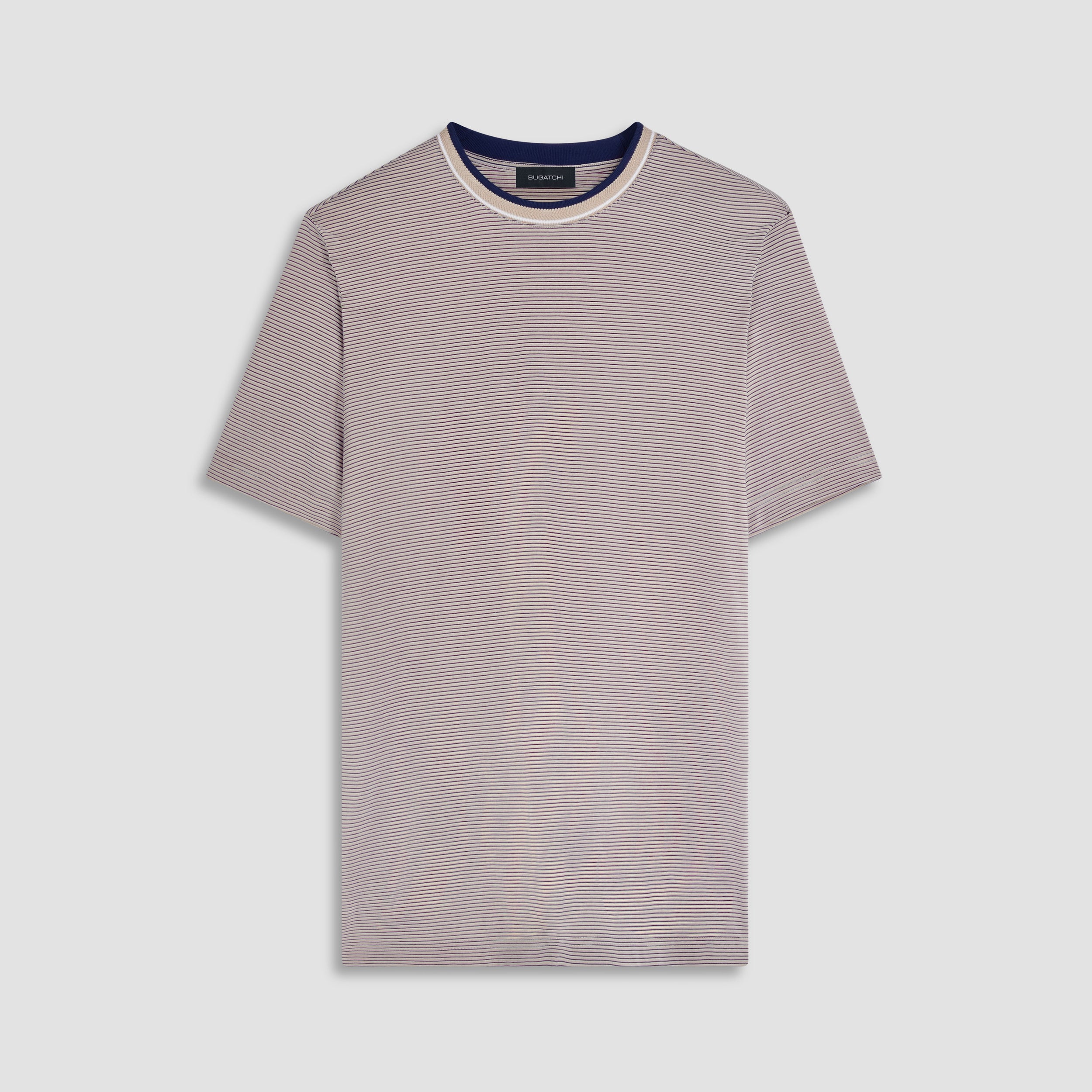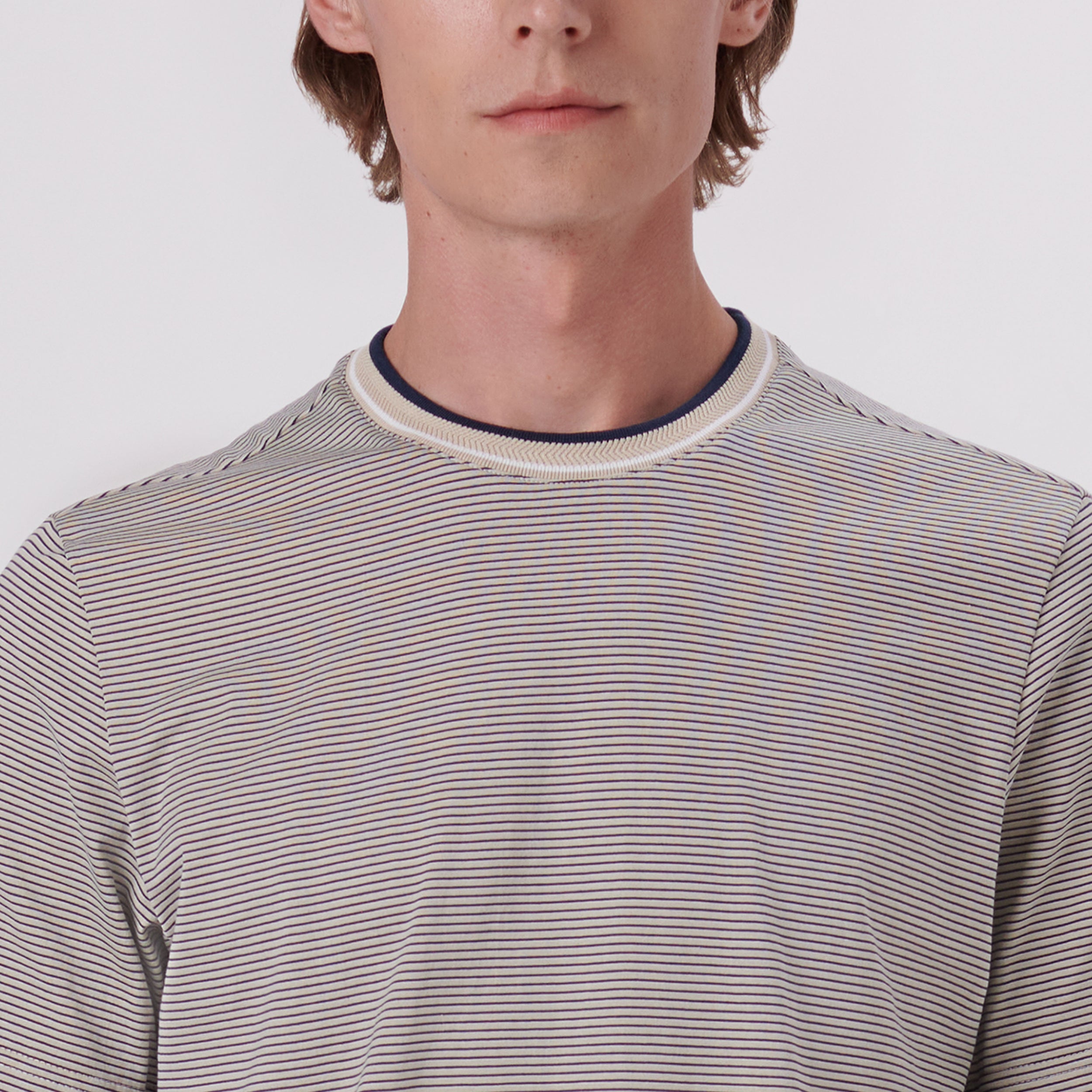 Striped short-sleeved crew neck T-shirt in 100% cotton with chevron striped rib knit collar and double contrast tipping detail.