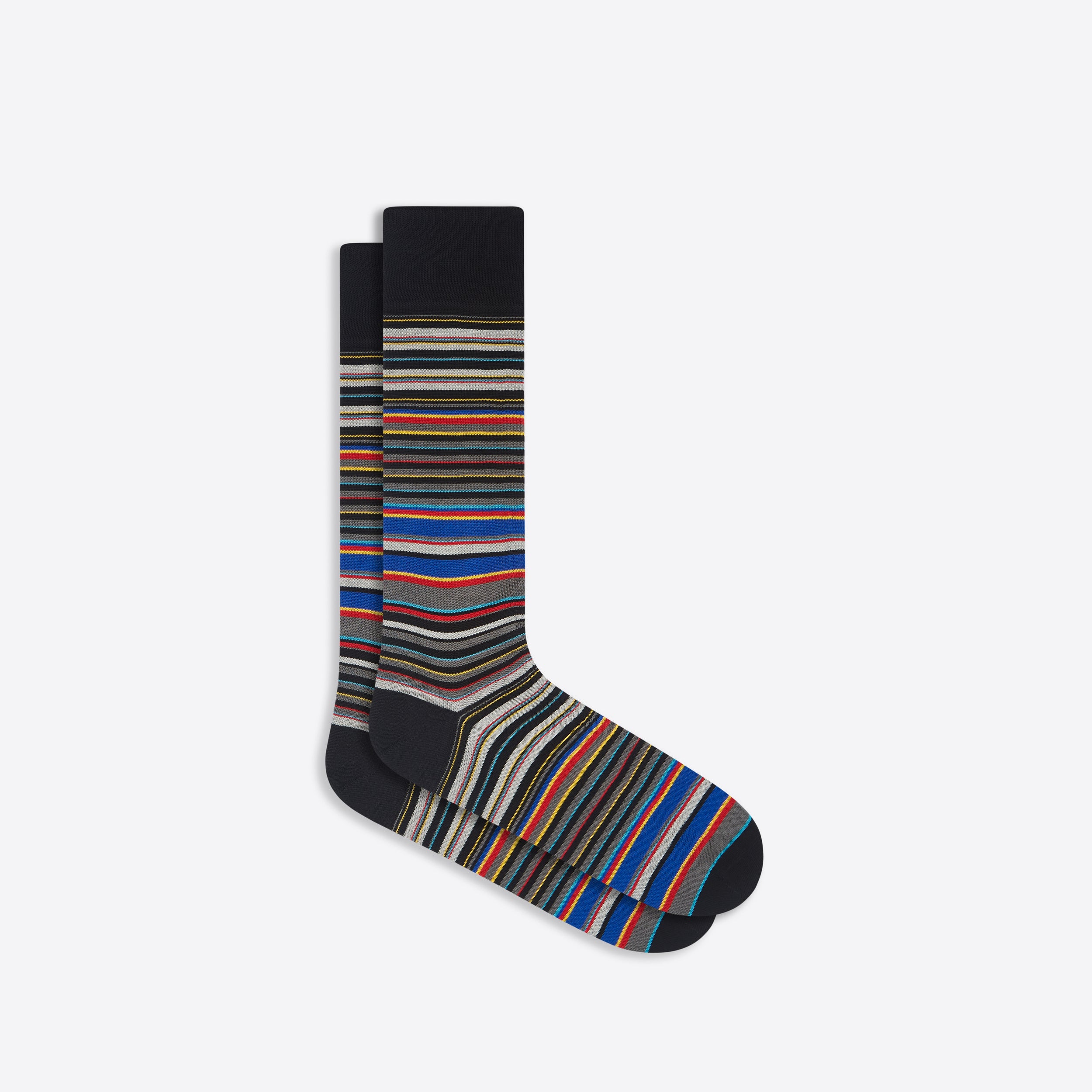Striped mid-calf socks in fine gauge mercerized cotton blend with rib knit cuff band, hand linked toe and reinforced heel seams. Made in Italy.
