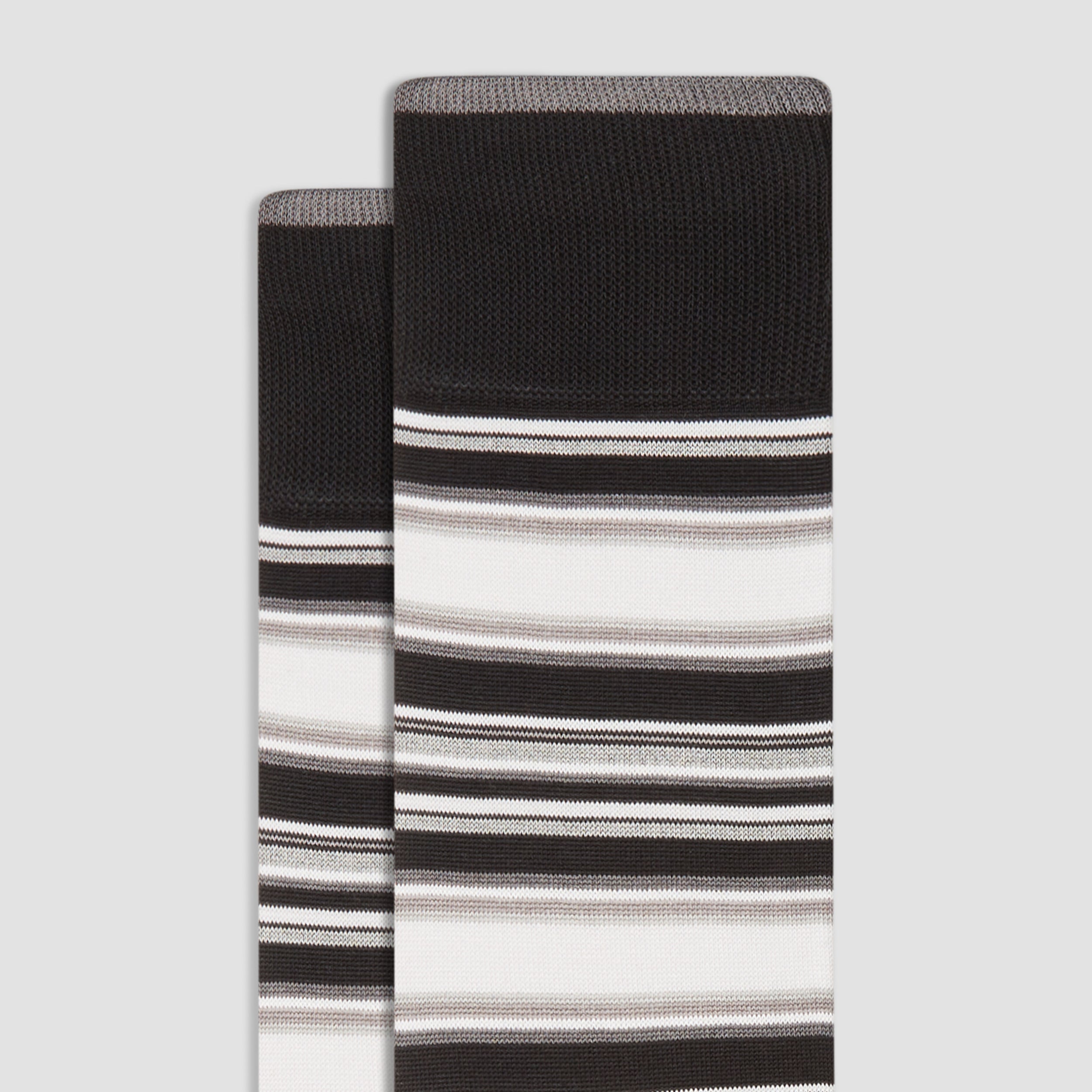 Striped mid-calf socks in fine gauge mercerized cotton blend with rib knit cuff band, hand linked toe and reinforced heel seams. Made in Italy.