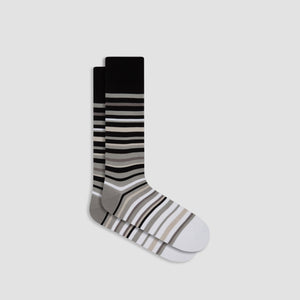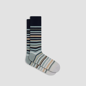 Striped mid-calf socks in fine gauge mercerized cotton blend with rib knit cuff band, hand linked toe and reinforced heel seams. Made in Italy.