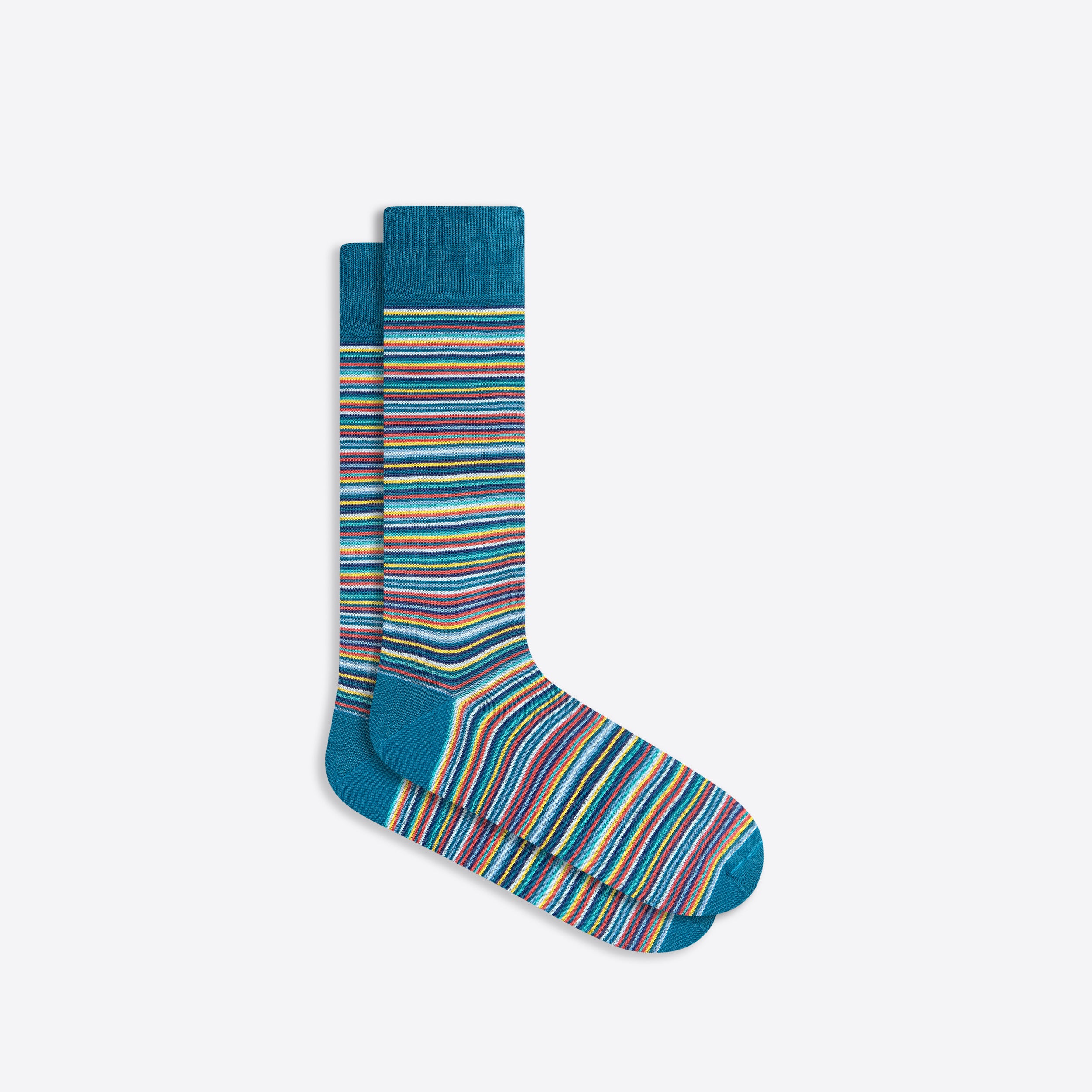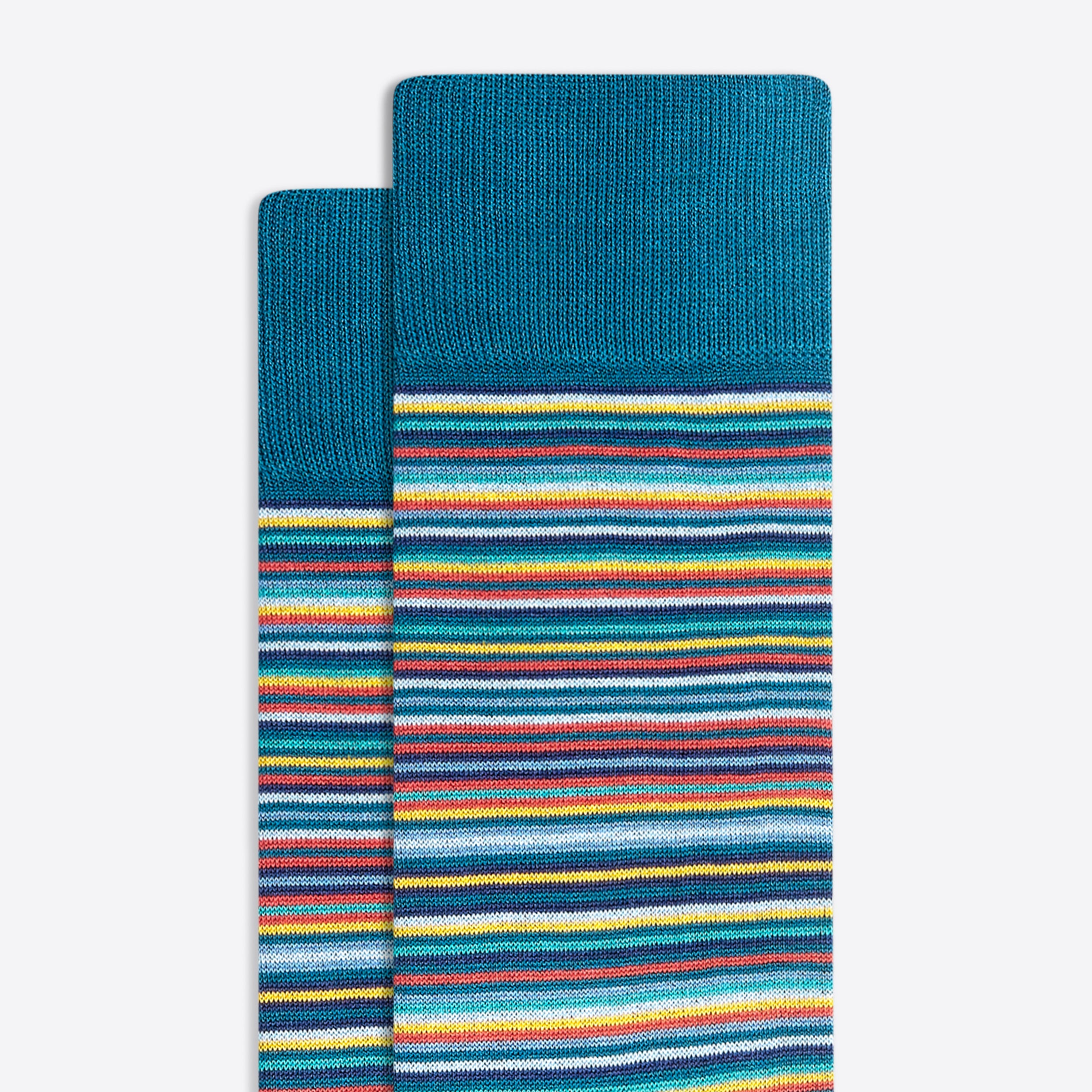 Striped mid-calf socks in fine gauge mercerized cotton blend with rib knit cuff band, hand linked toe and reinforced heel seams. Made in Italy.