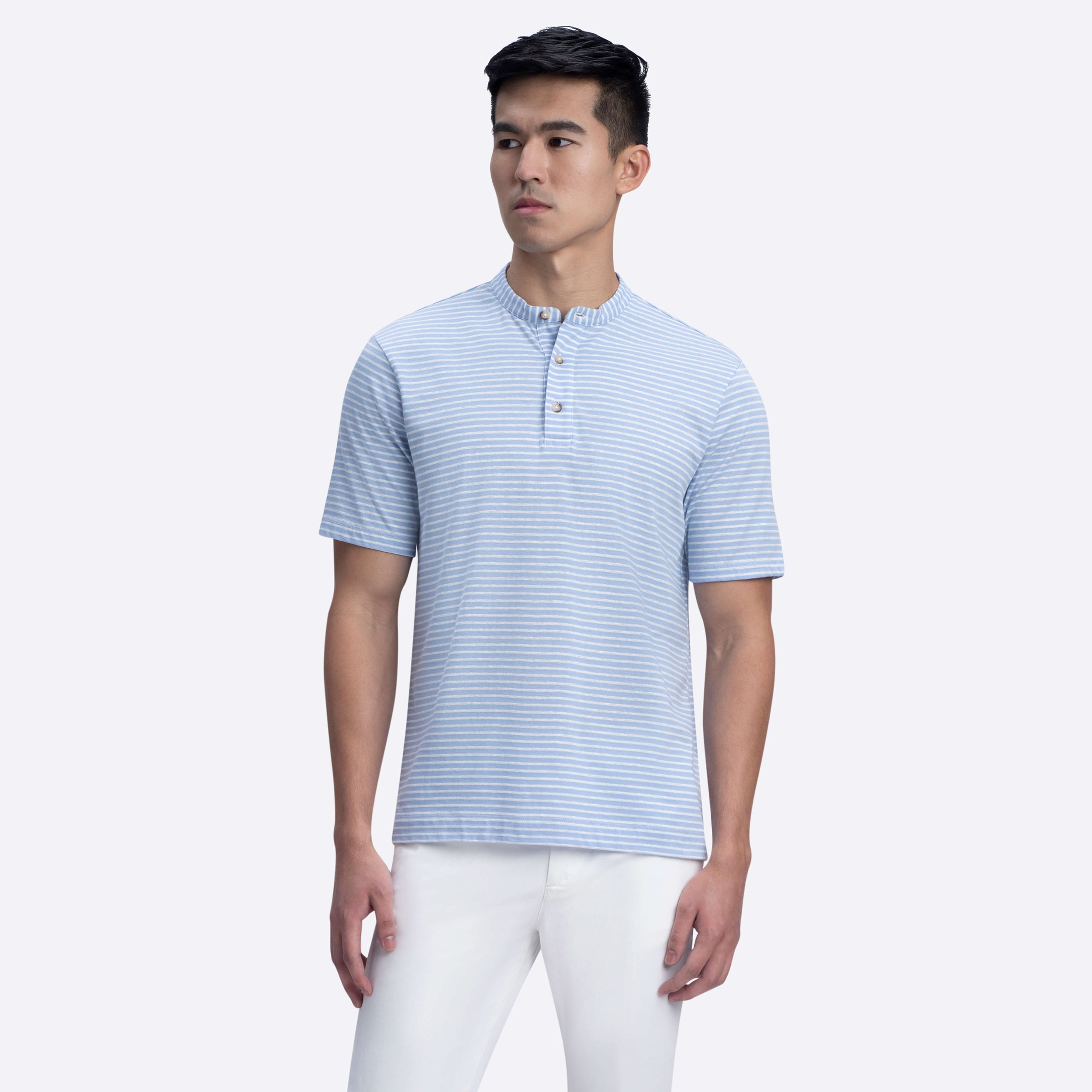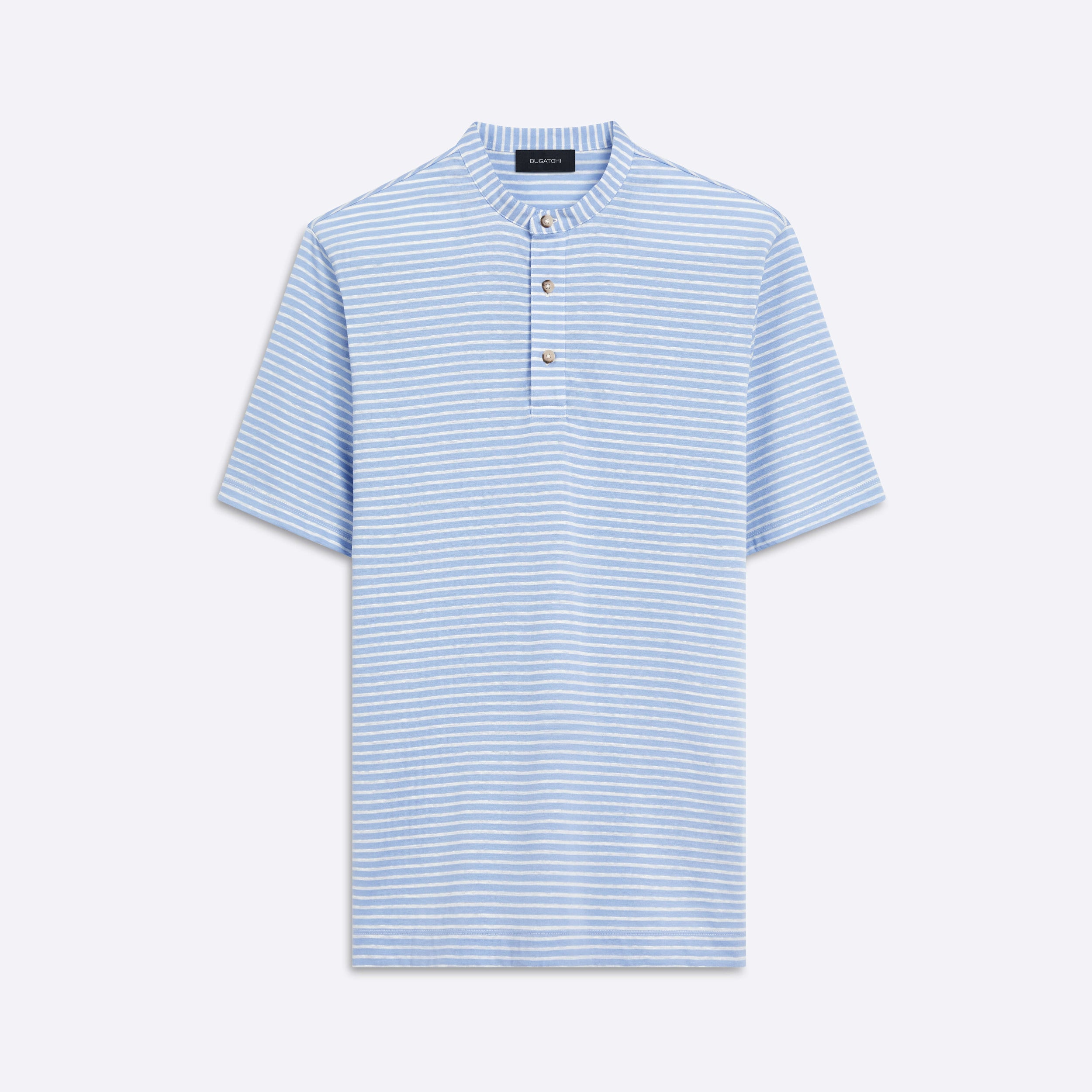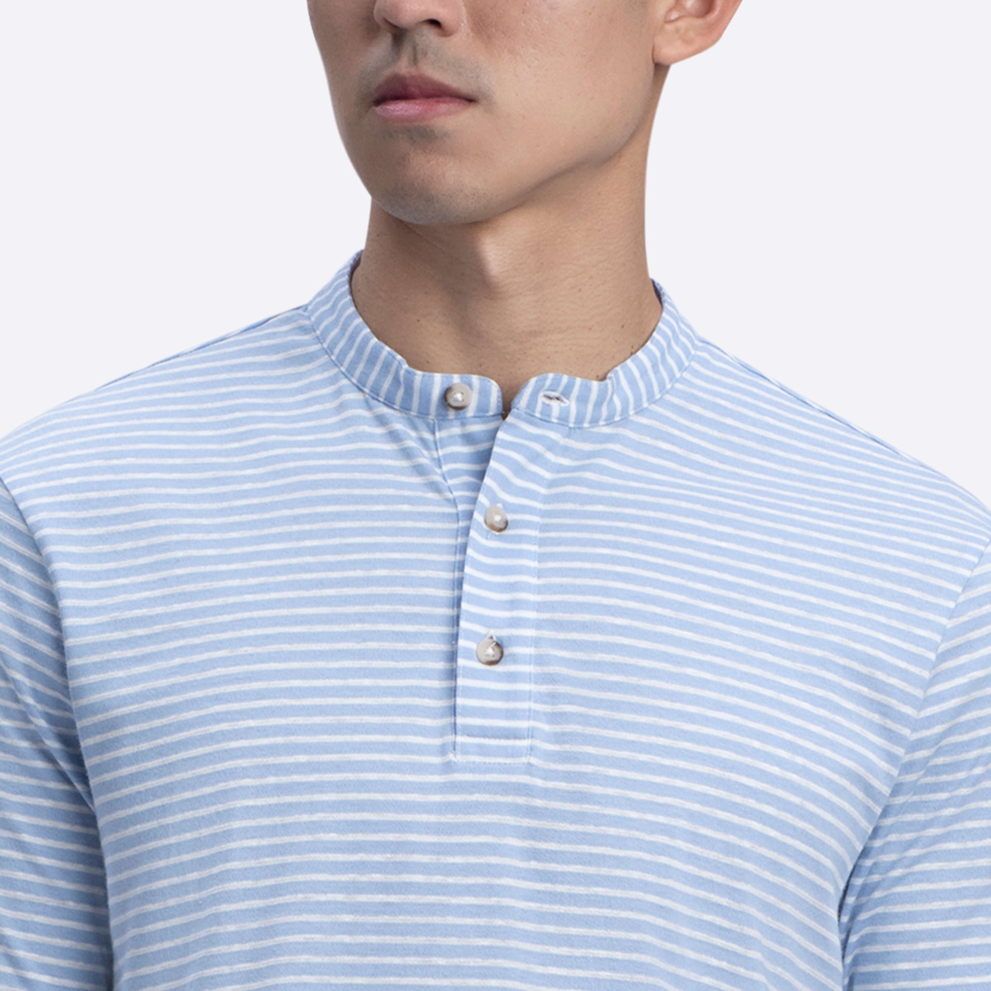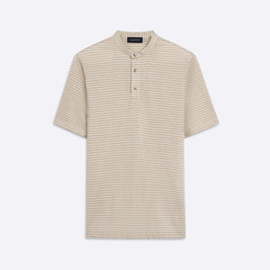 Short-sleeved henley in striped cotton linen blend and three button placket.