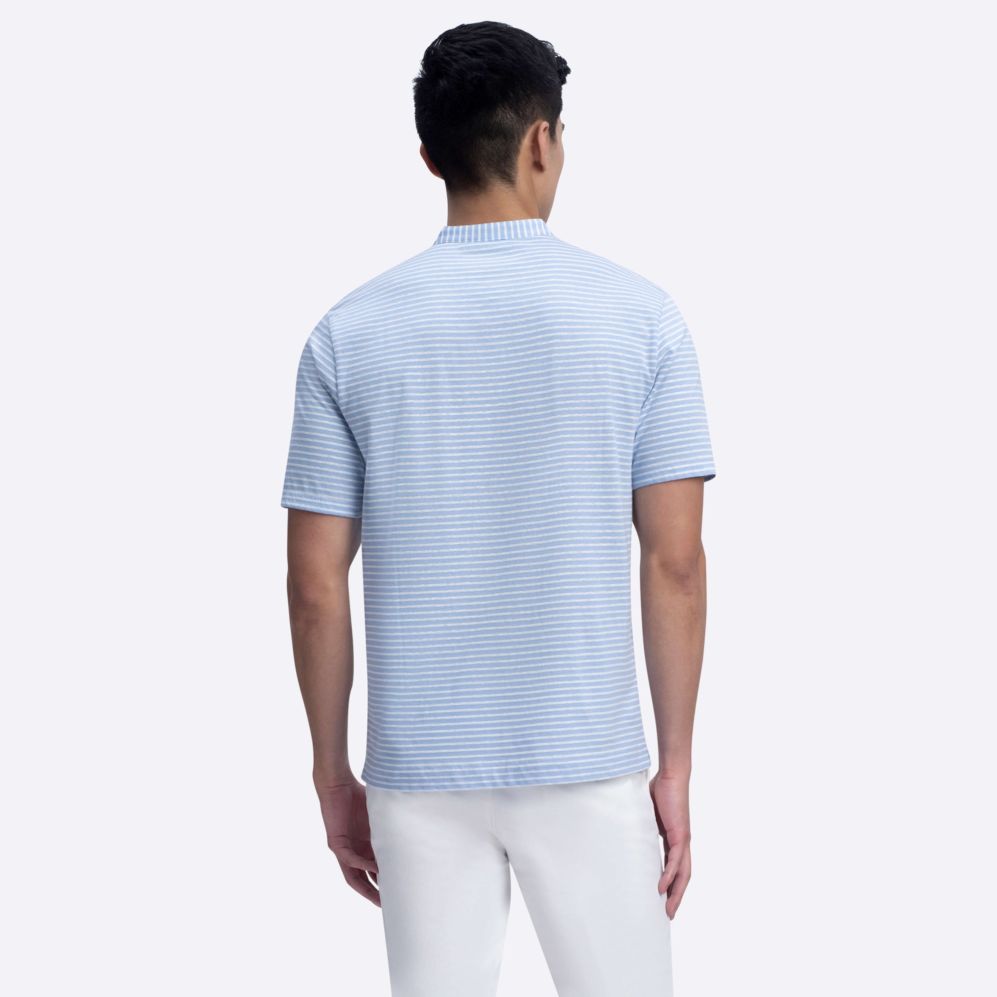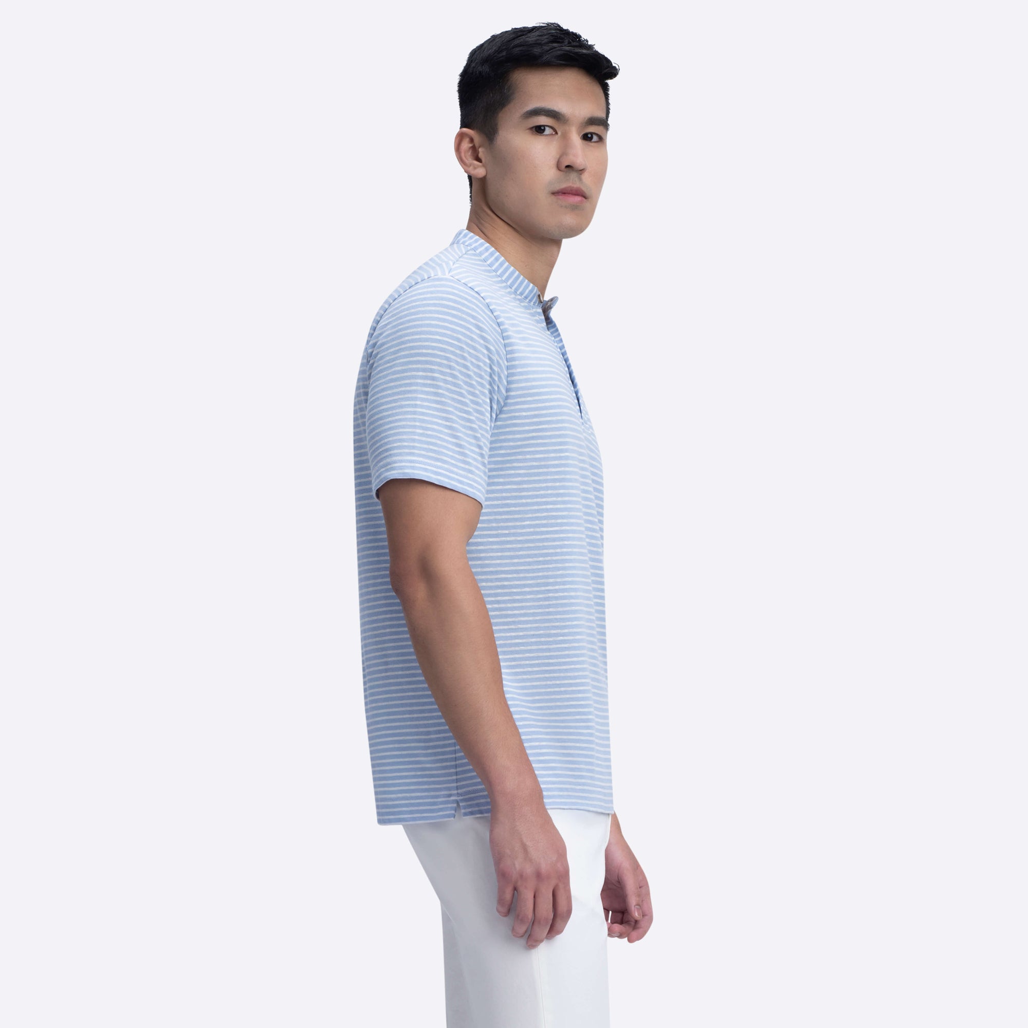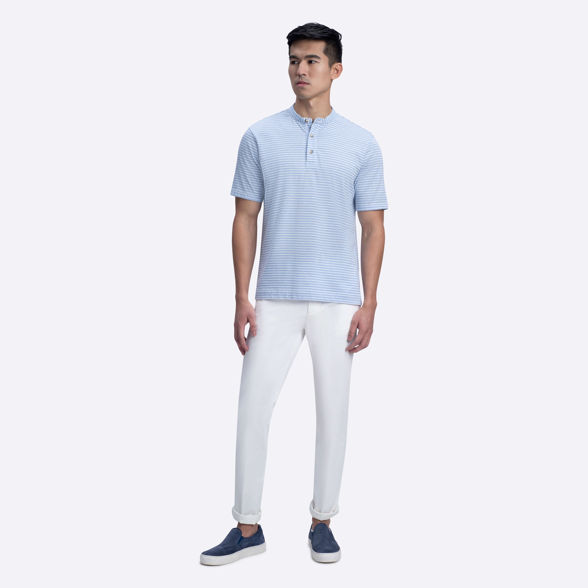 Short-sleeved henley in striped cotton linen blend and three button placket.