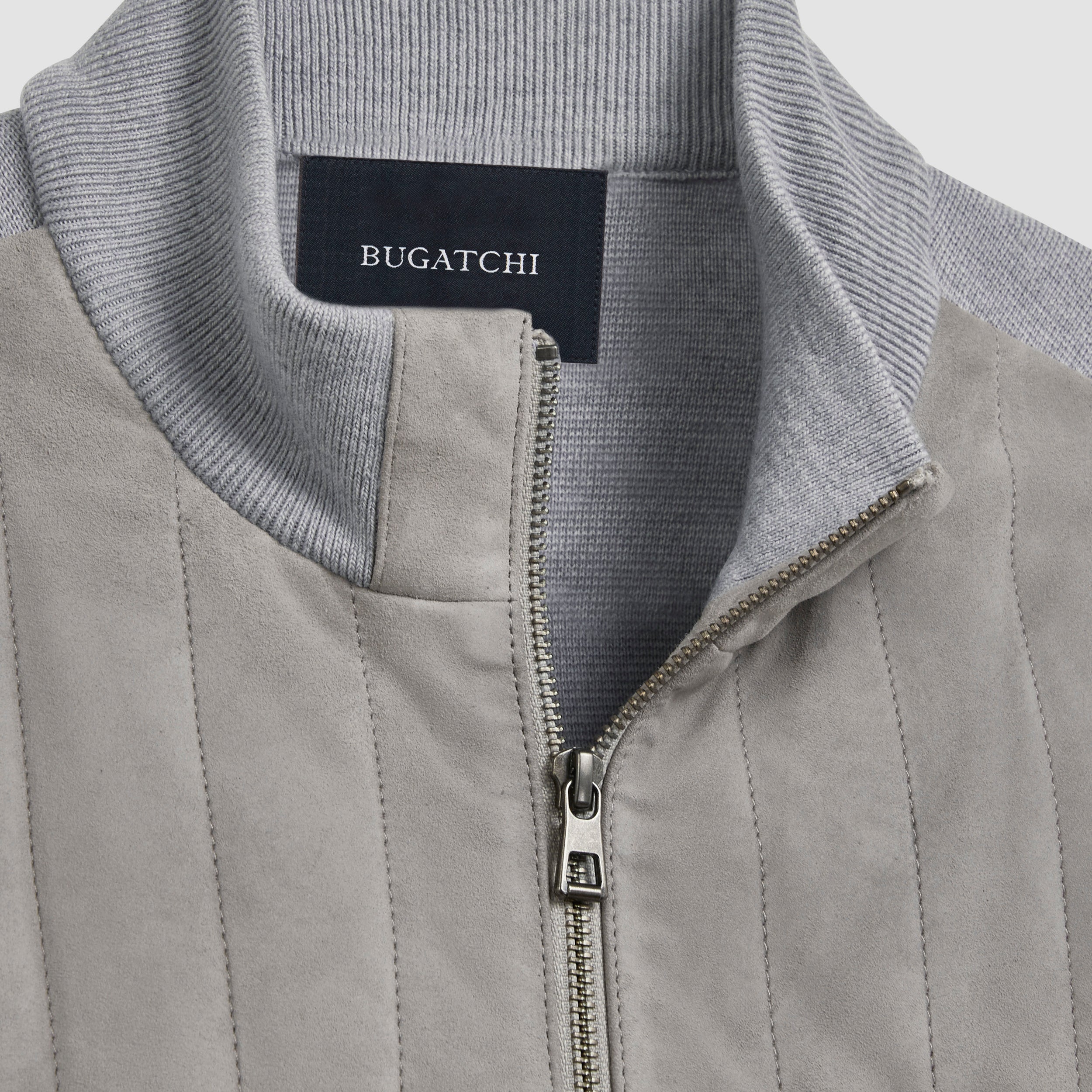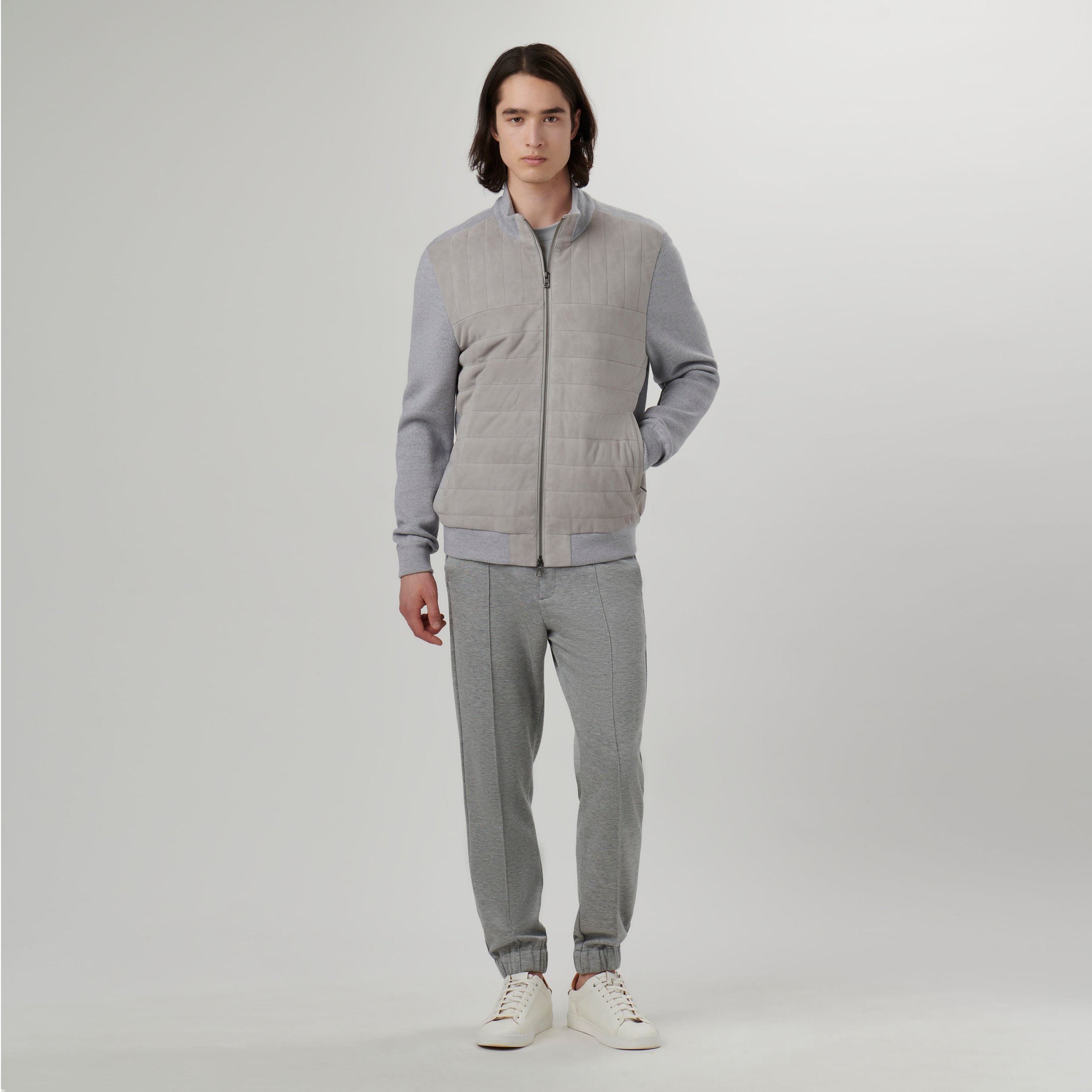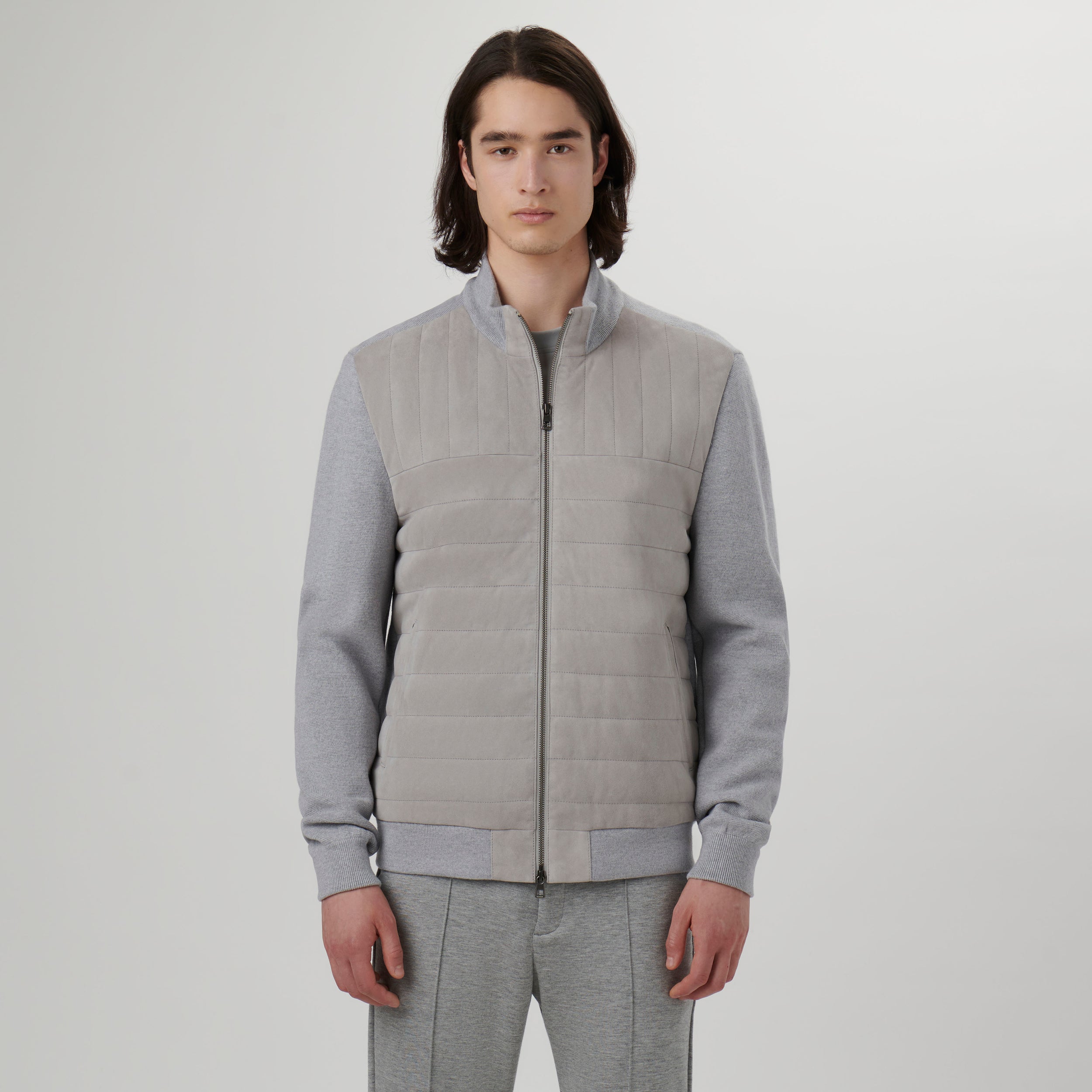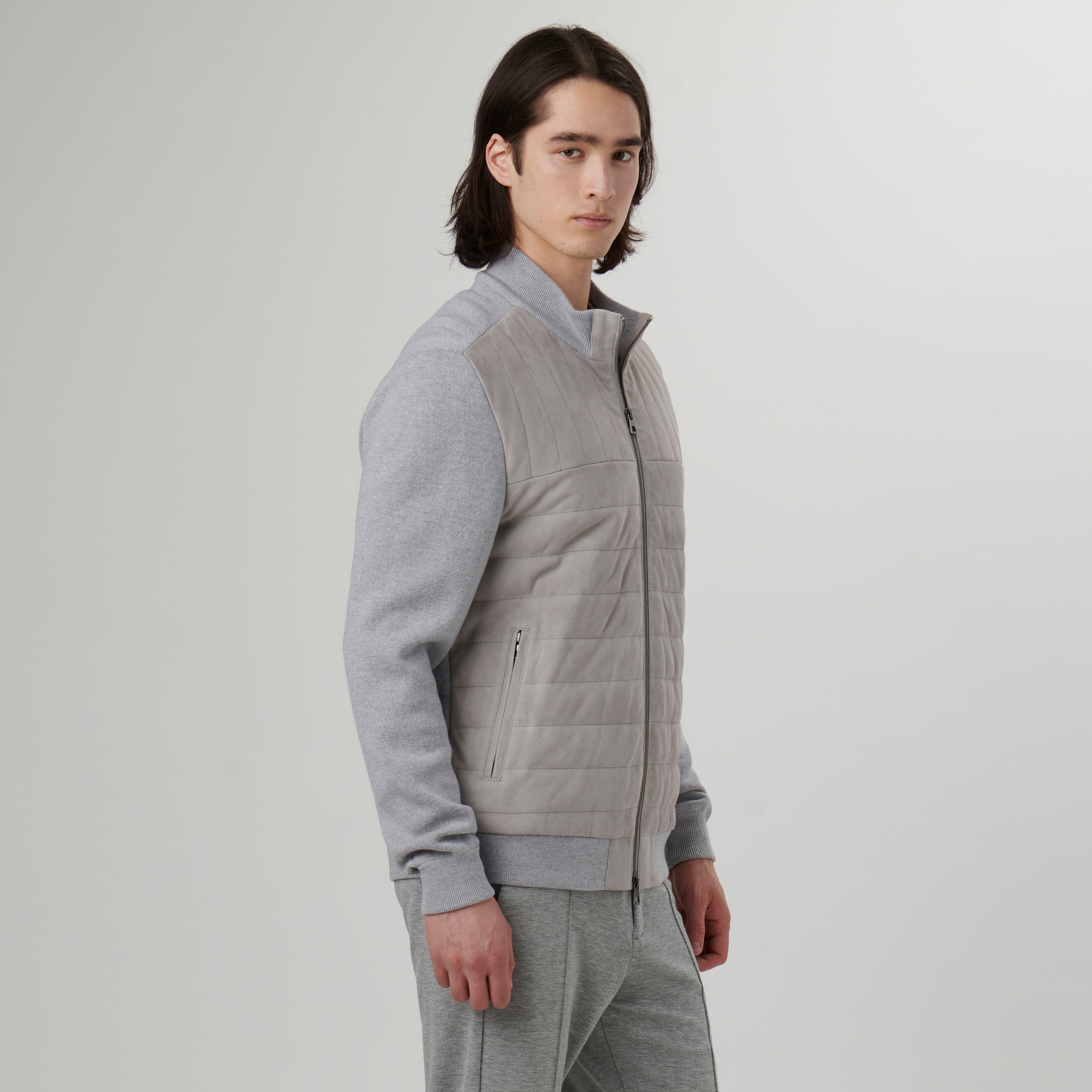 Sweater jacket in 100% goat suede and 100% wool combination with mock neck collar, two-way zipper closure and slanted zippered pockets . The front is in quilted 100% goat suede and the sleeves, back, collar and waistband are in 100% wool.