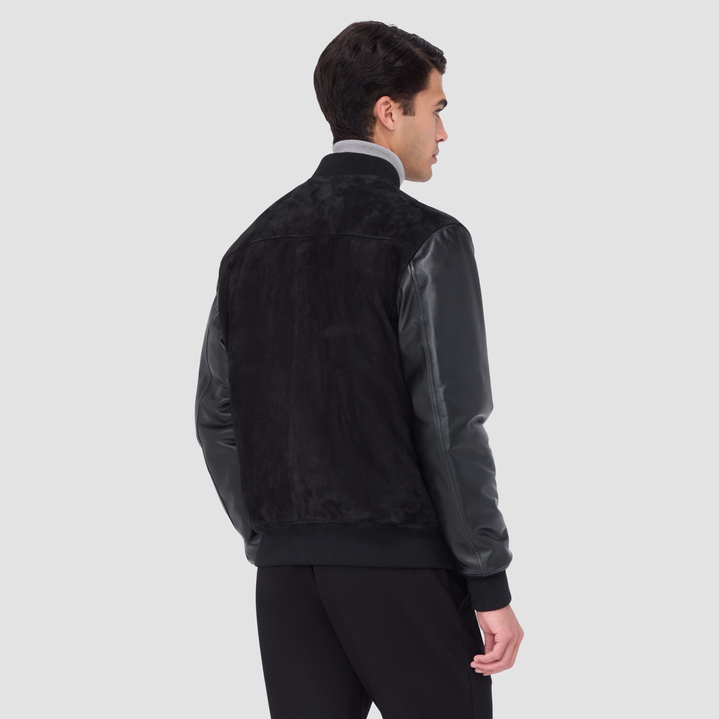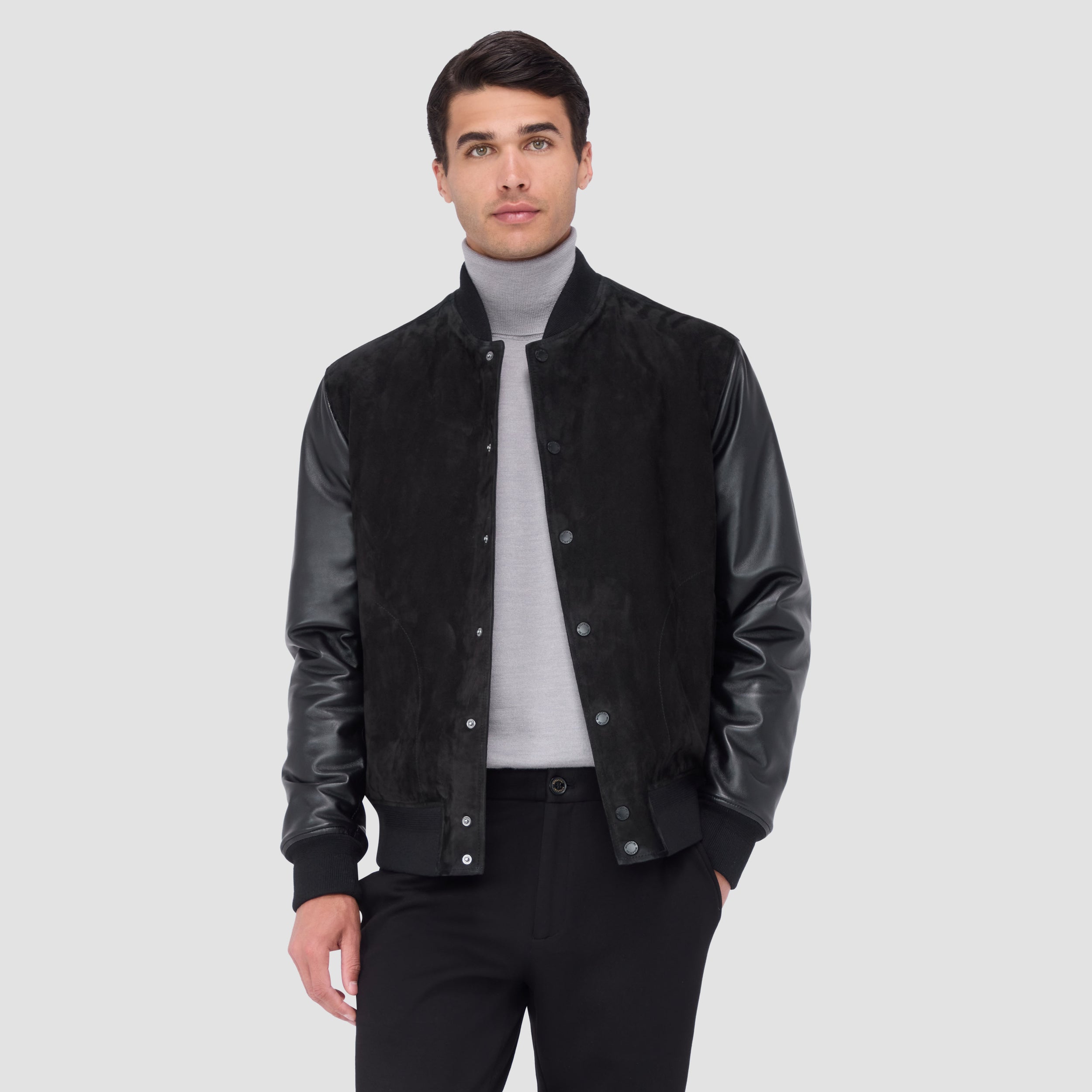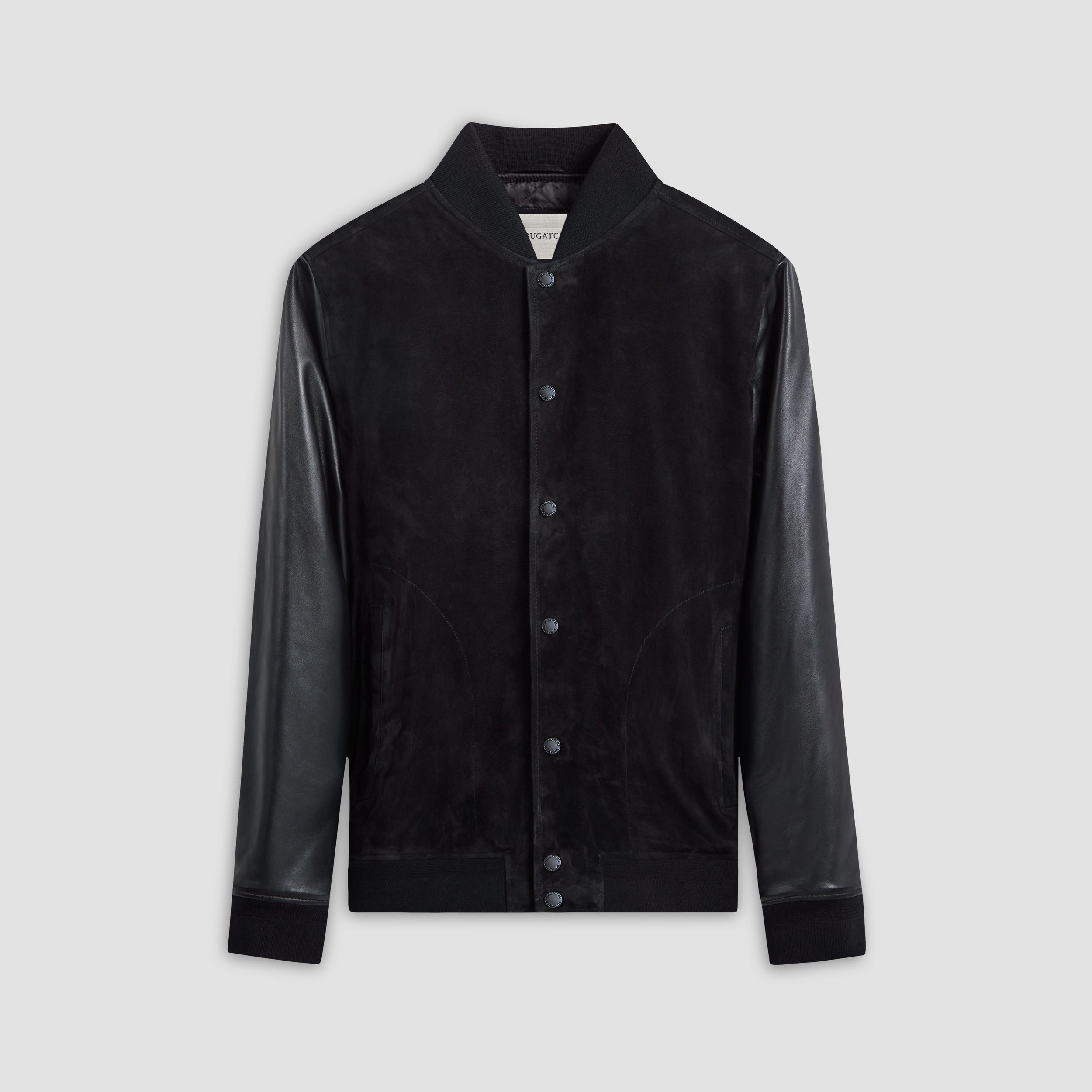 This bomber jacket merges the luxurious softness of goat suede with the rugged durability of leather sleeves for a timeless statement piece. Fully lined in diamond-quilted nylon, it promises warmth and insulation while the rib-knit baseball collar, cuffs, and waist add comfort and sporty sophistication. It features a full front snap closure and slanted side pockets as well as discreet inner pockets for storing valuables.