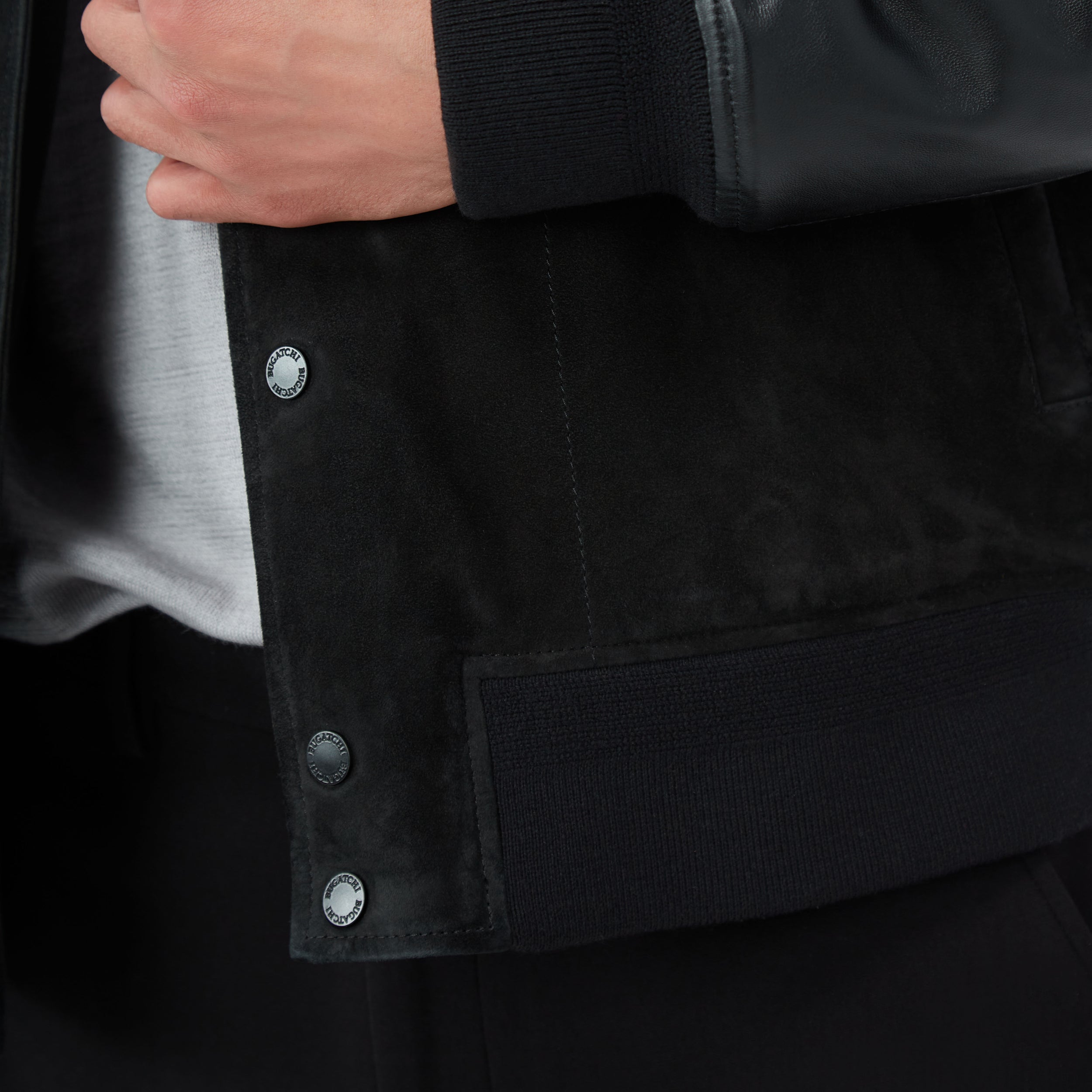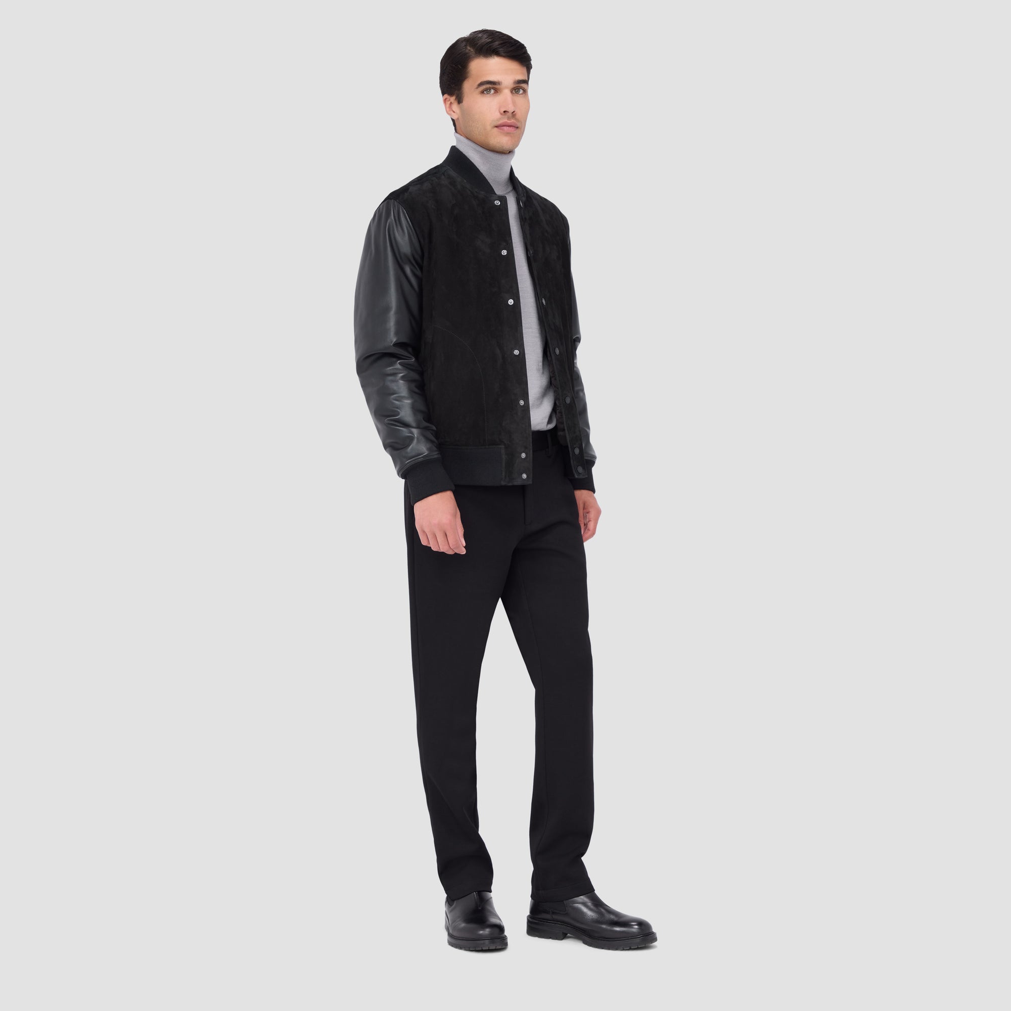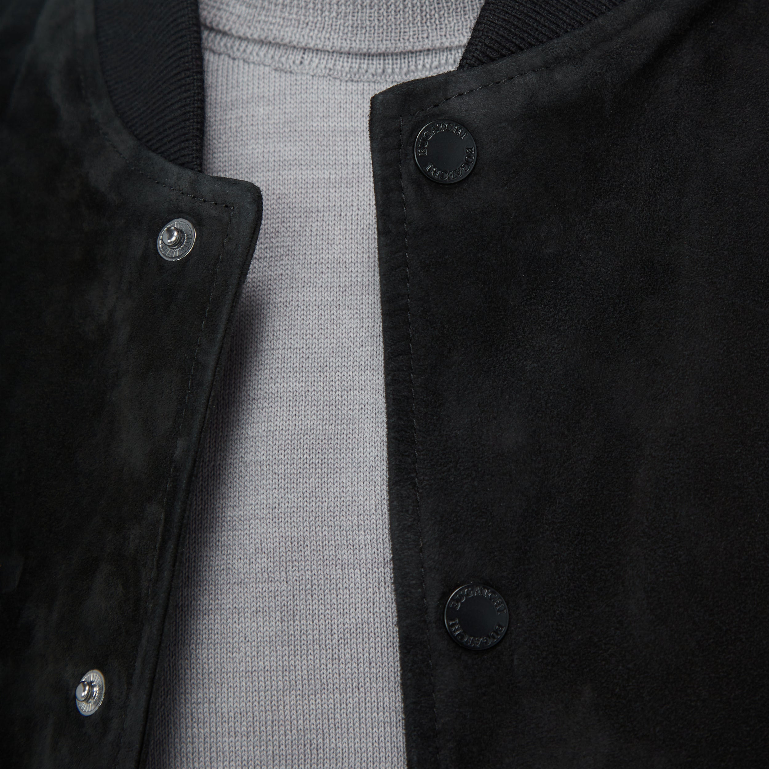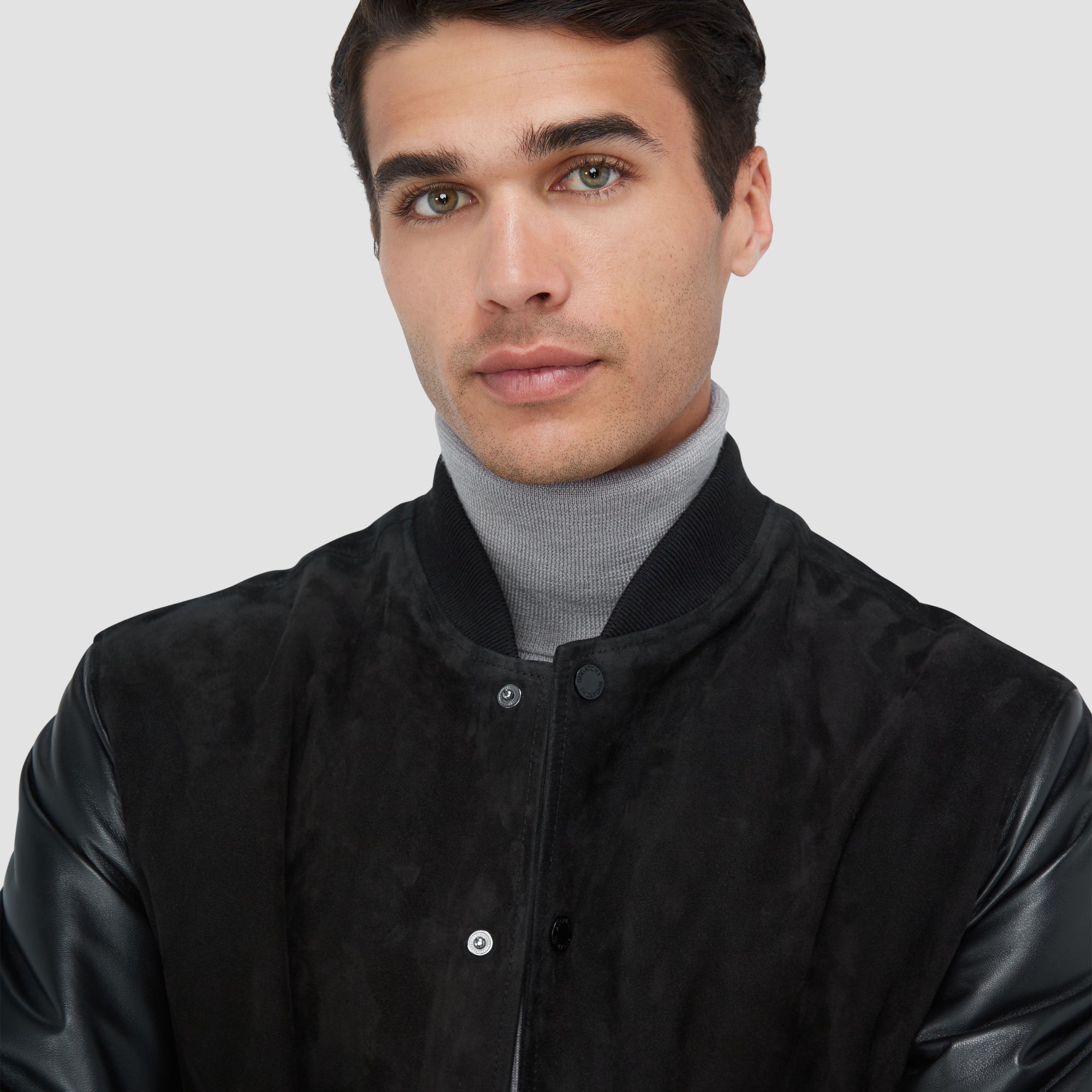This bomber jacket merges the luxurious softness of goat suede with the rugged durability of leather sleeves for a timeless statement piece. Fully lined in diamond-quilted nylon, it promises warmth and insulation while the rib-knit baseball collar, cuffs, and waist add comfort and sporty sophistication. It features a full front snap closure and slanted side pockets as well as discreet inner pockets for storing valuables.