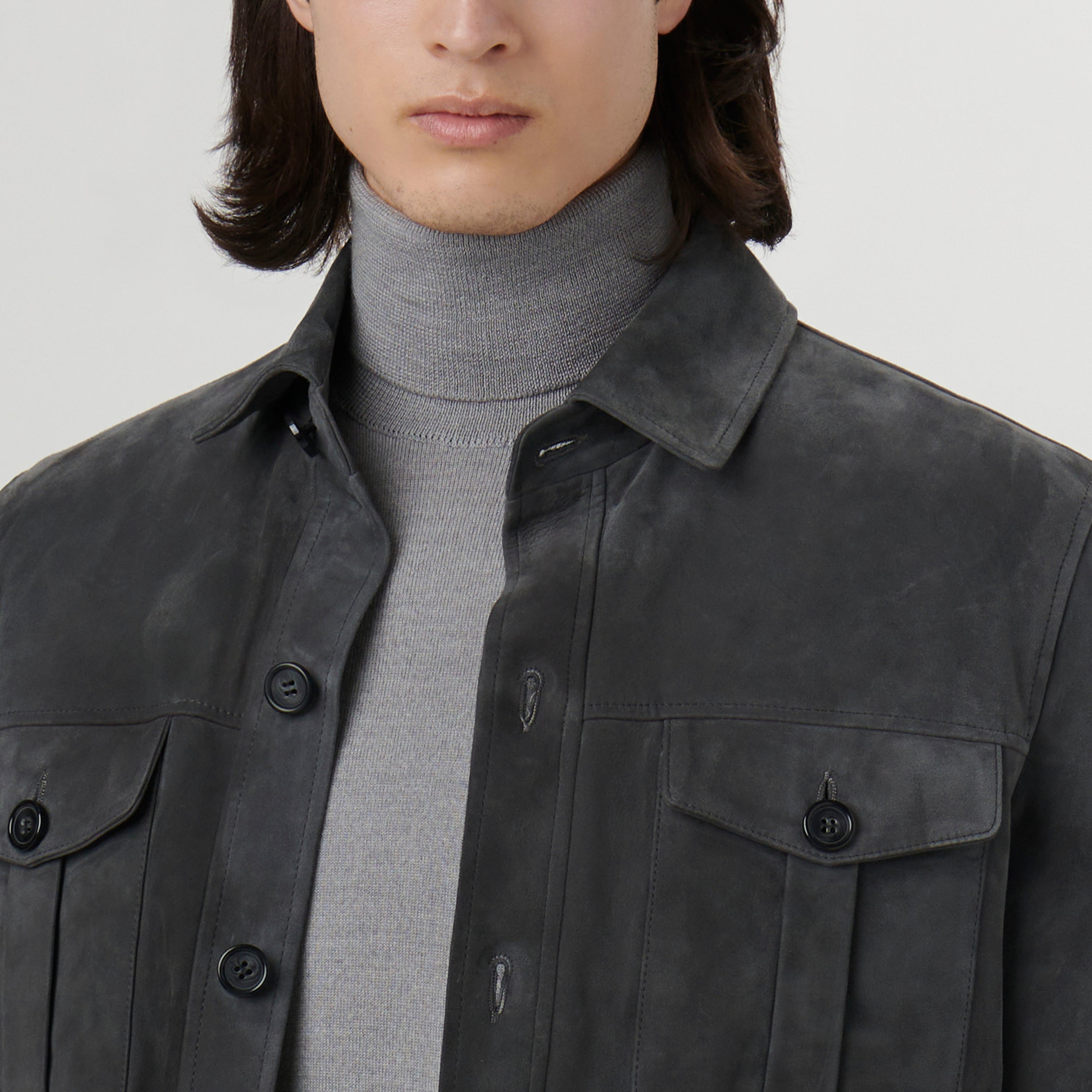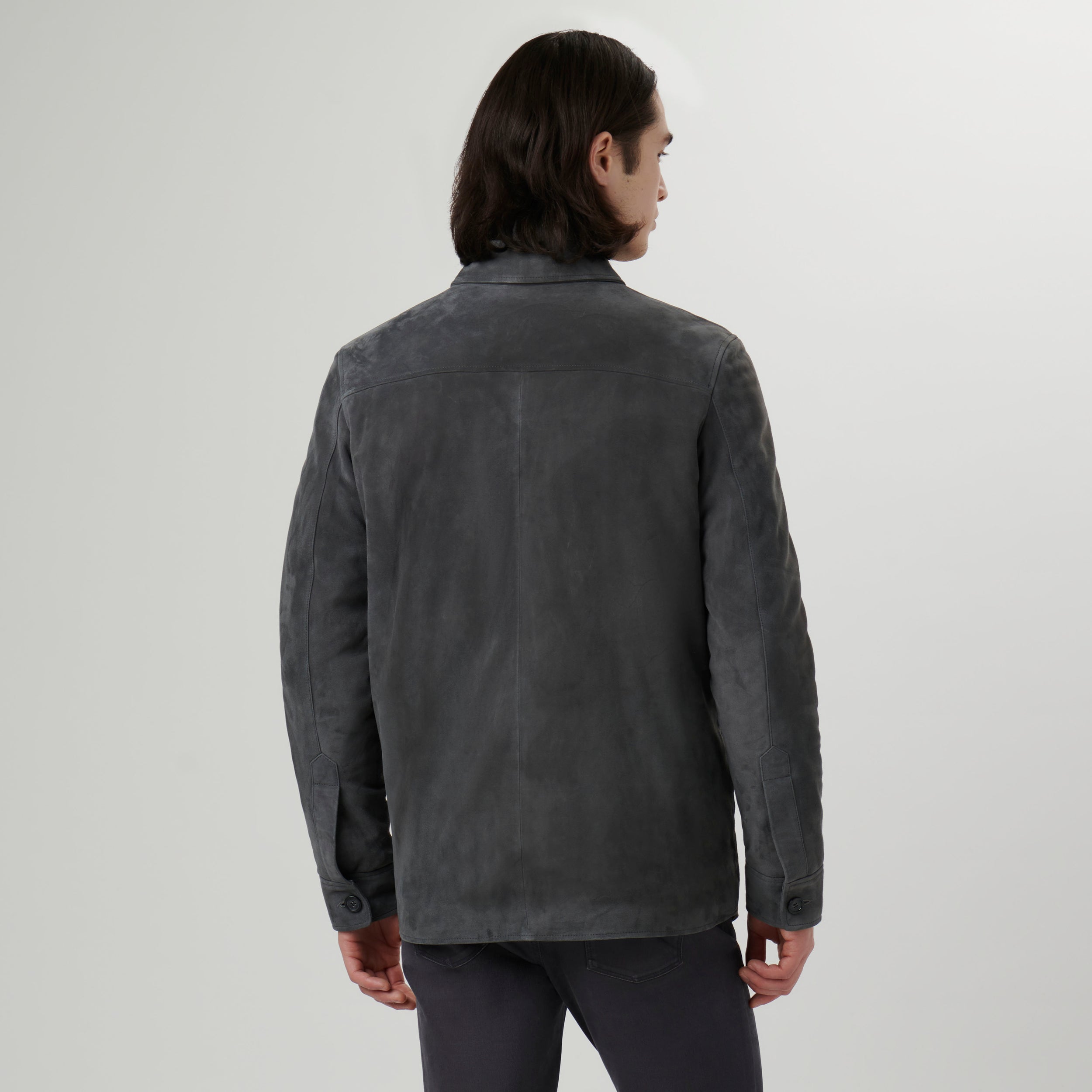 Shirt jacket in 100% goat suede with point collar, full button closure, buttoned chest pockets and slanted pockets.