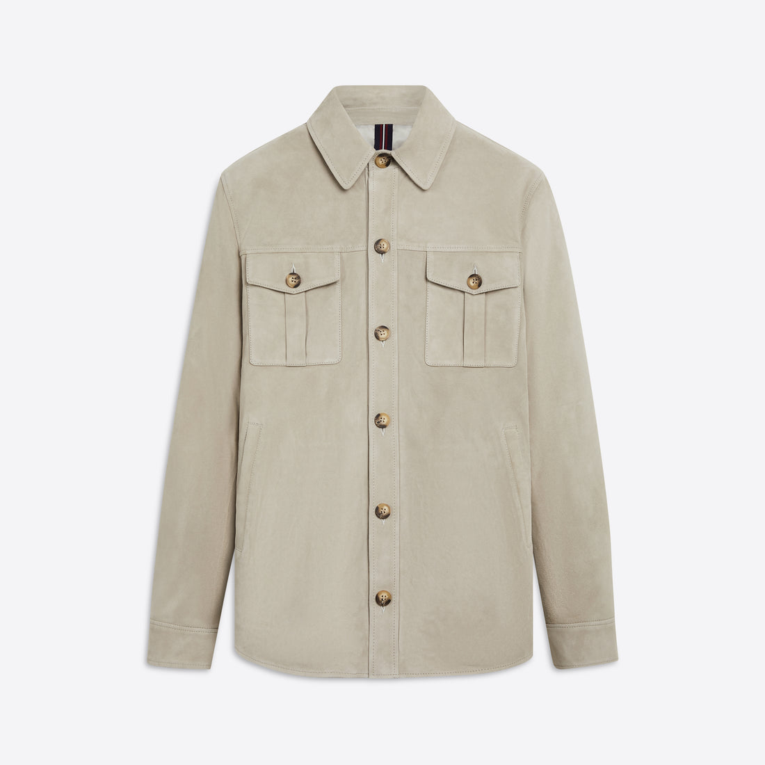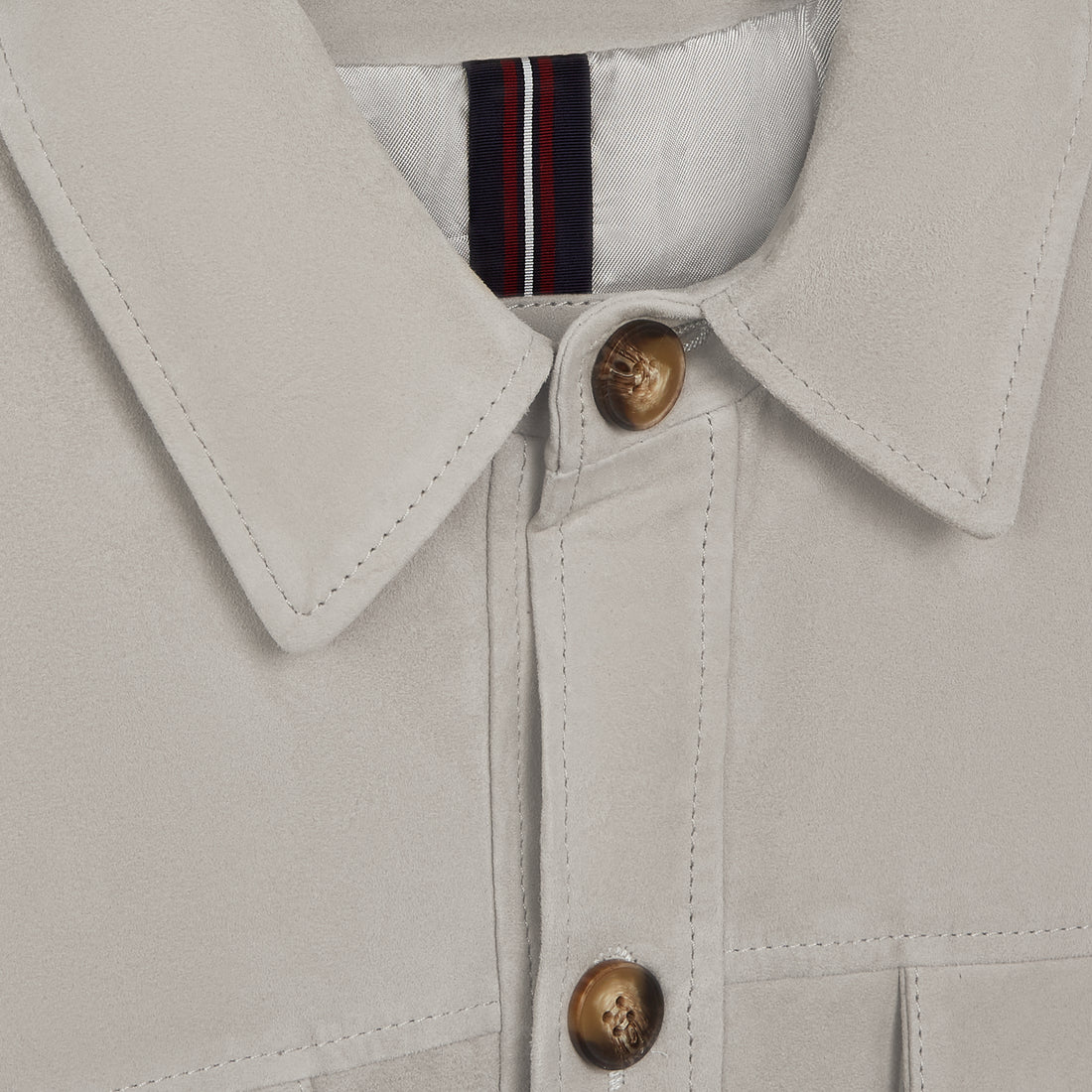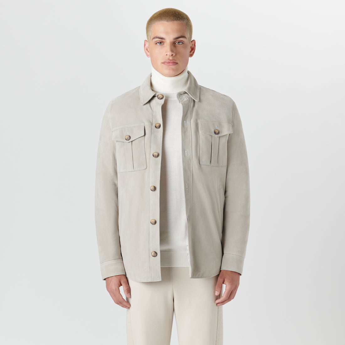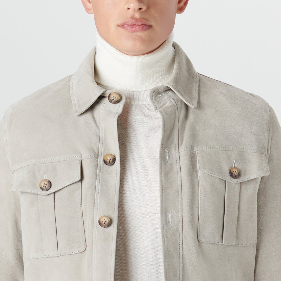 Shirt jacket in 100% suede with point collar, full button closure, two chest pockets with buttoned flap and two slanted side pockets.