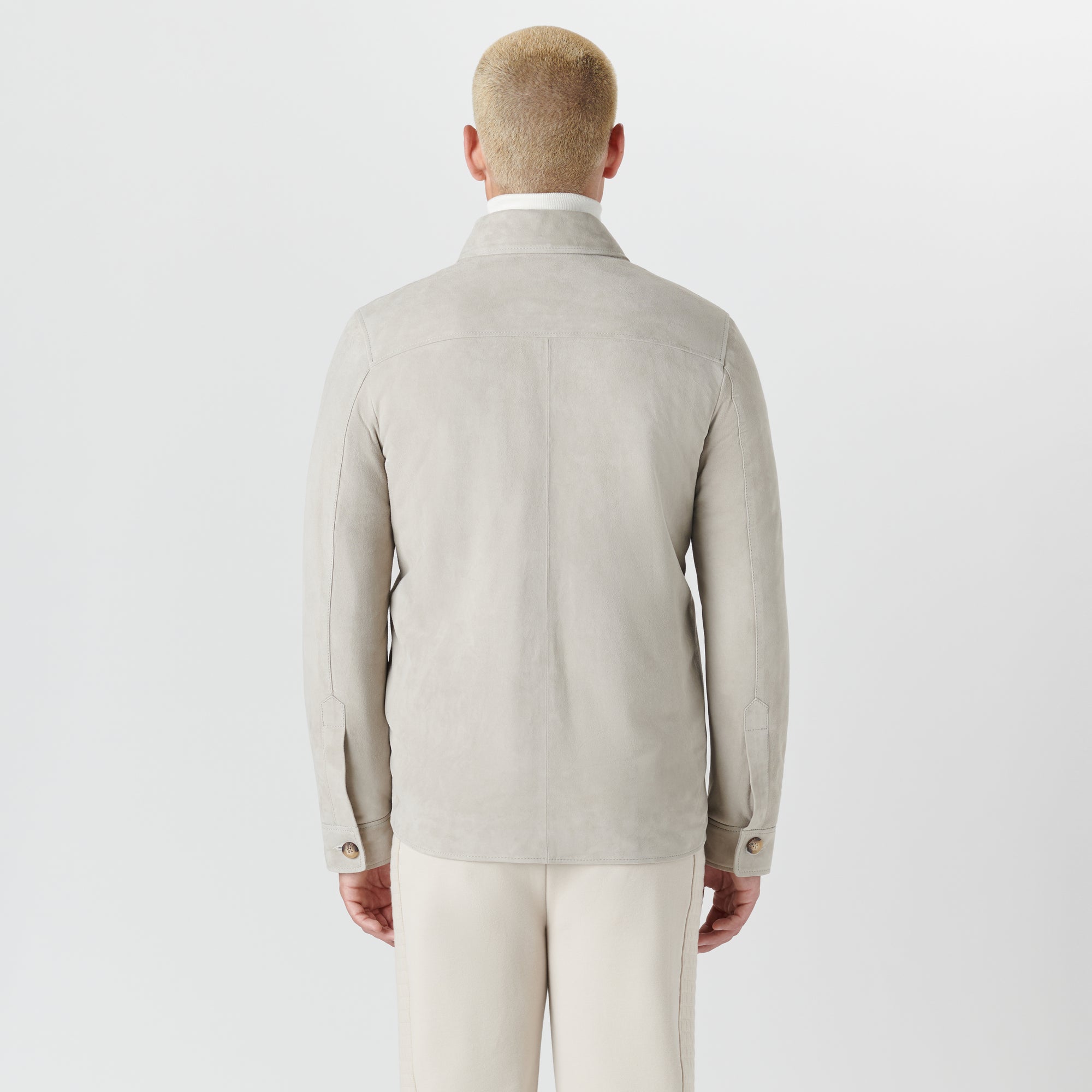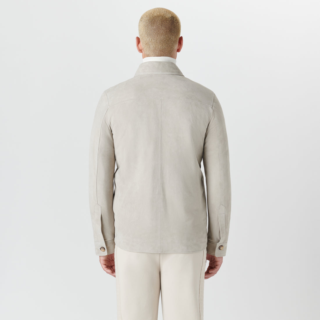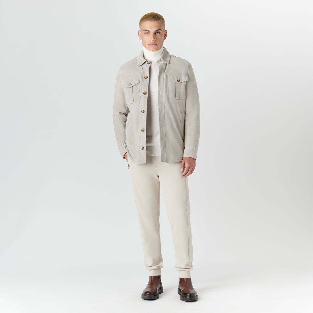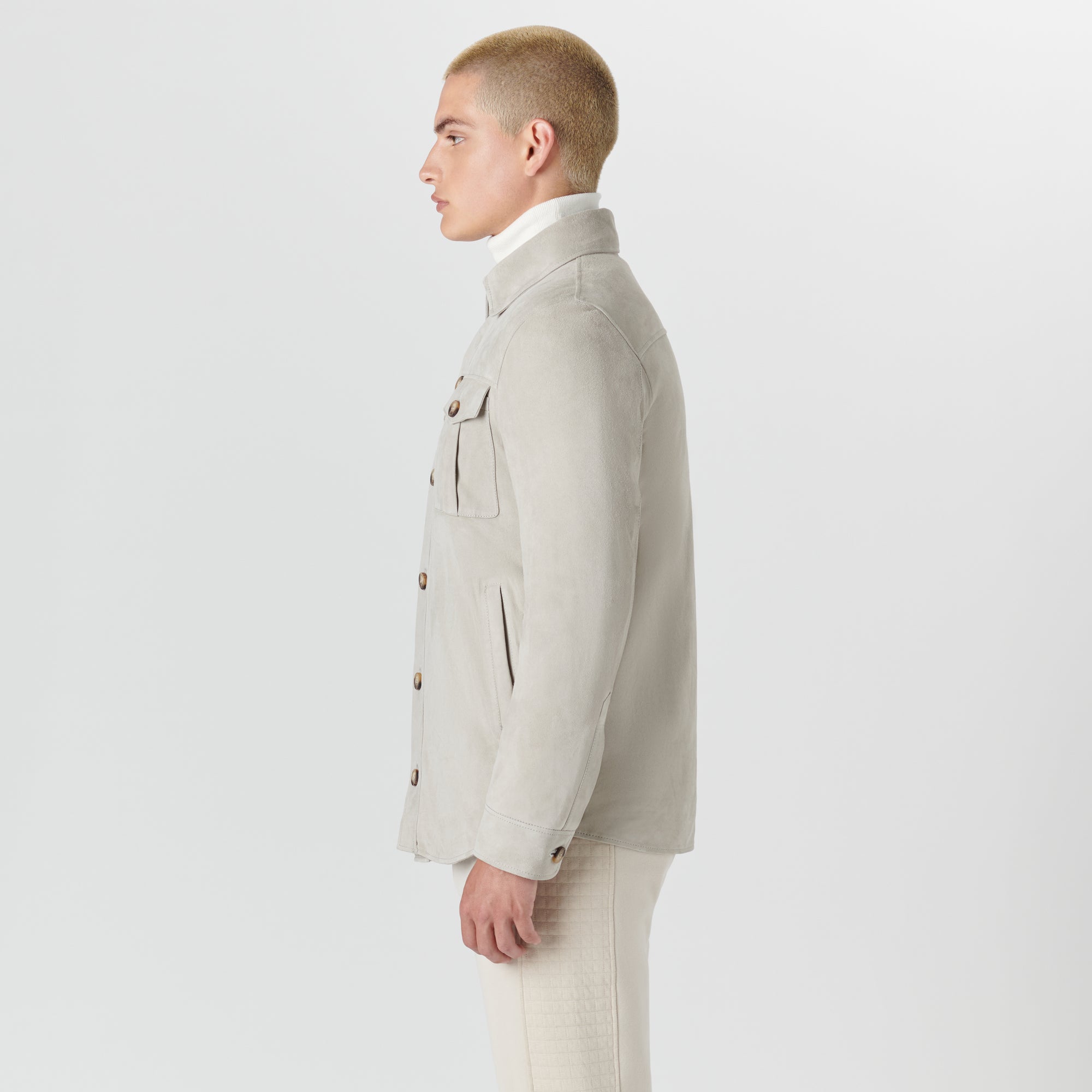 Shirt jacket in 100% suede with point collar, full button closure, two chest pockets with buttoned flap and two slanted side pockets.