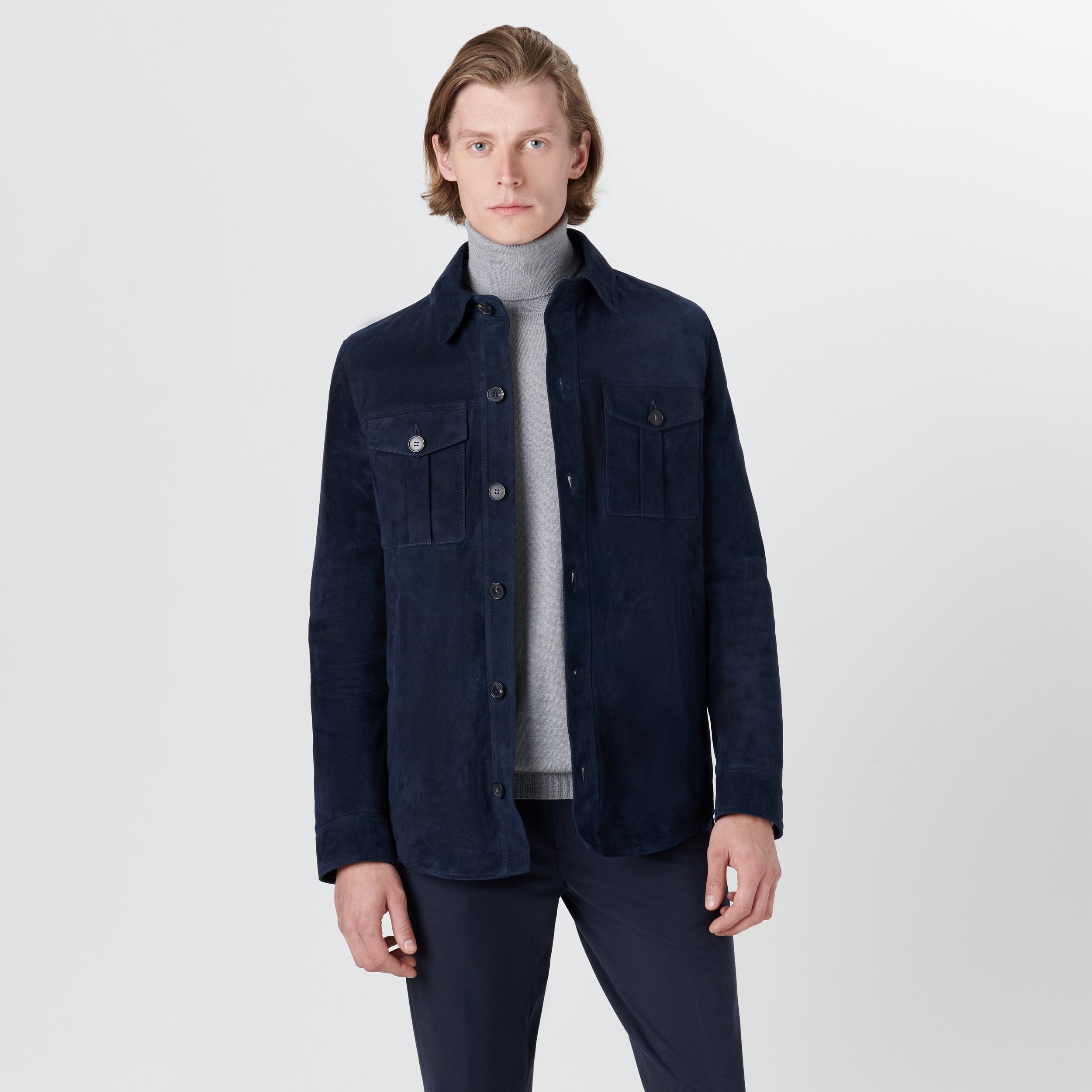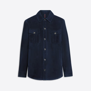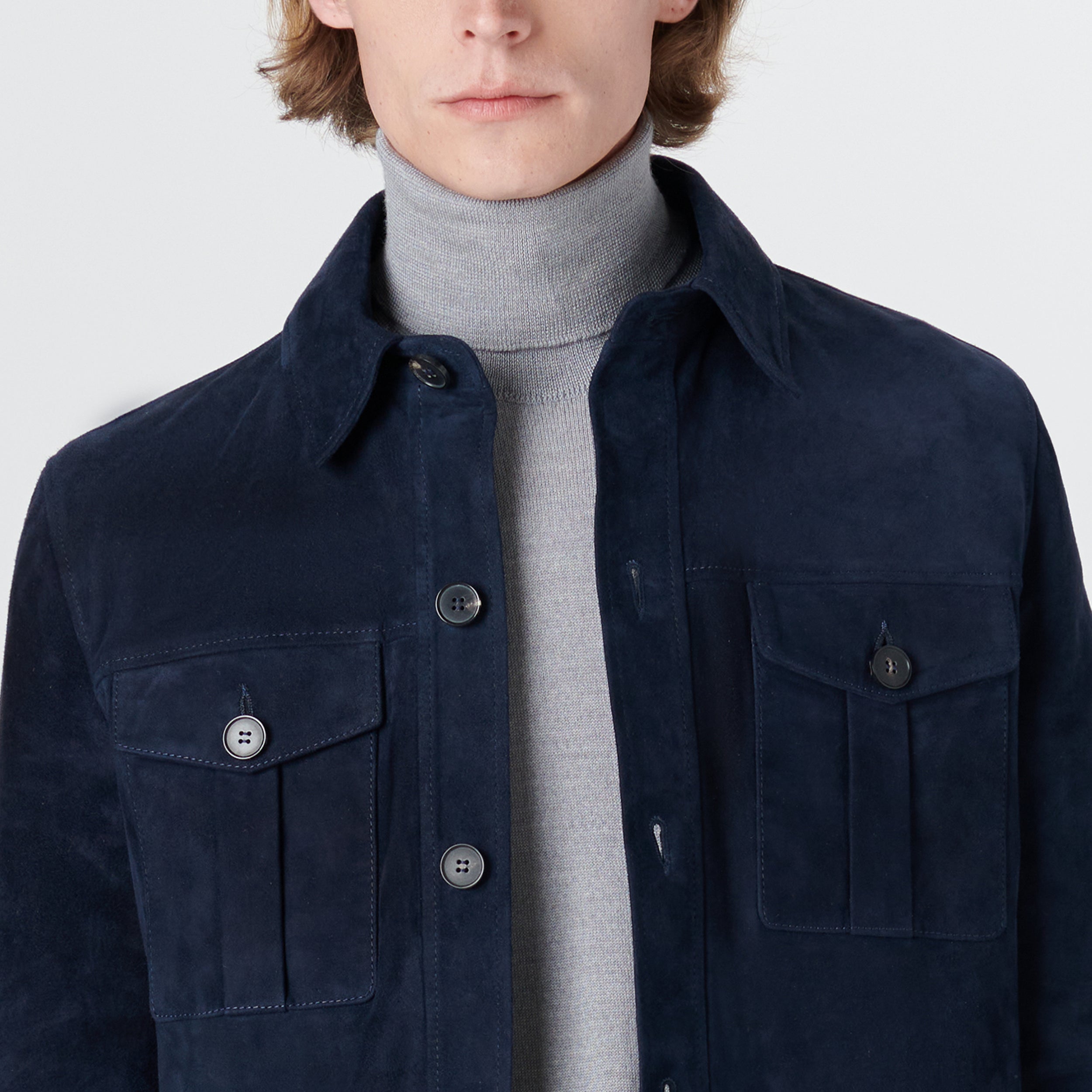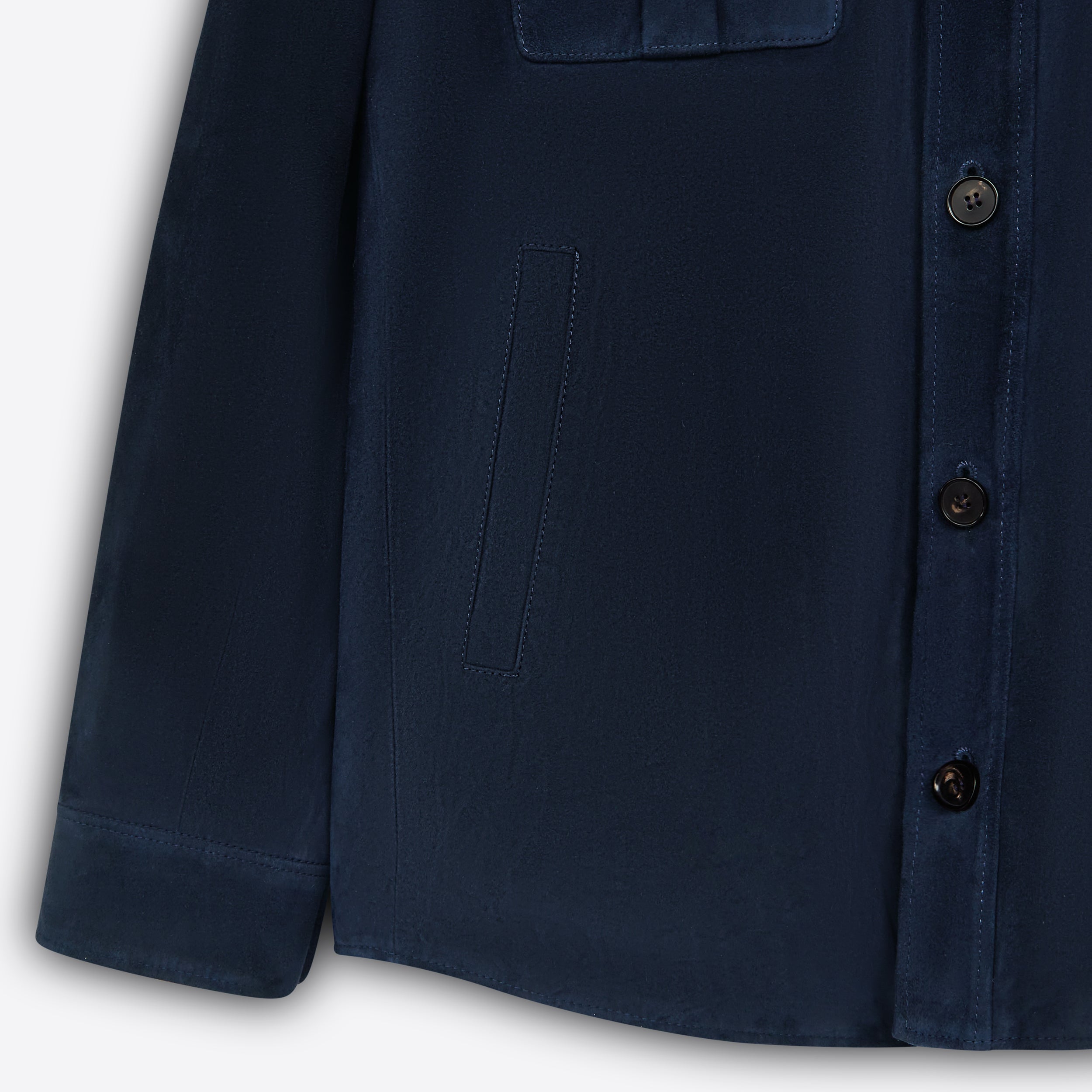 Shirt jacket in 100% suede with point collar, full button closure, two chest pockets with buttoned flap and two slanted side pockets.