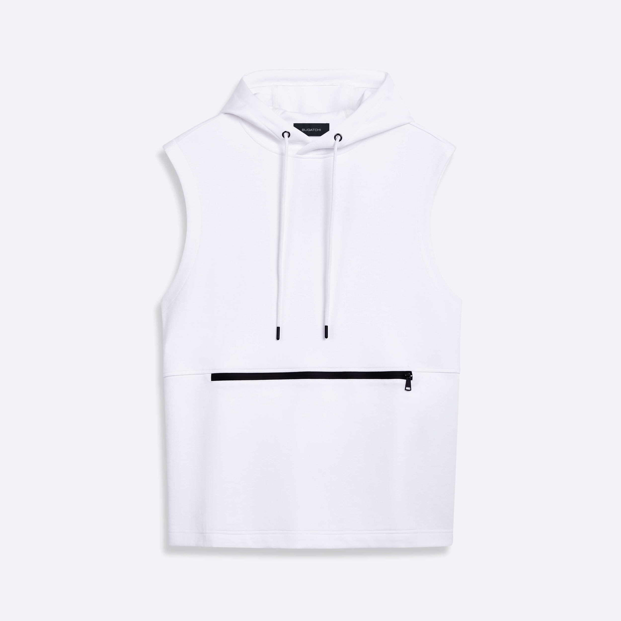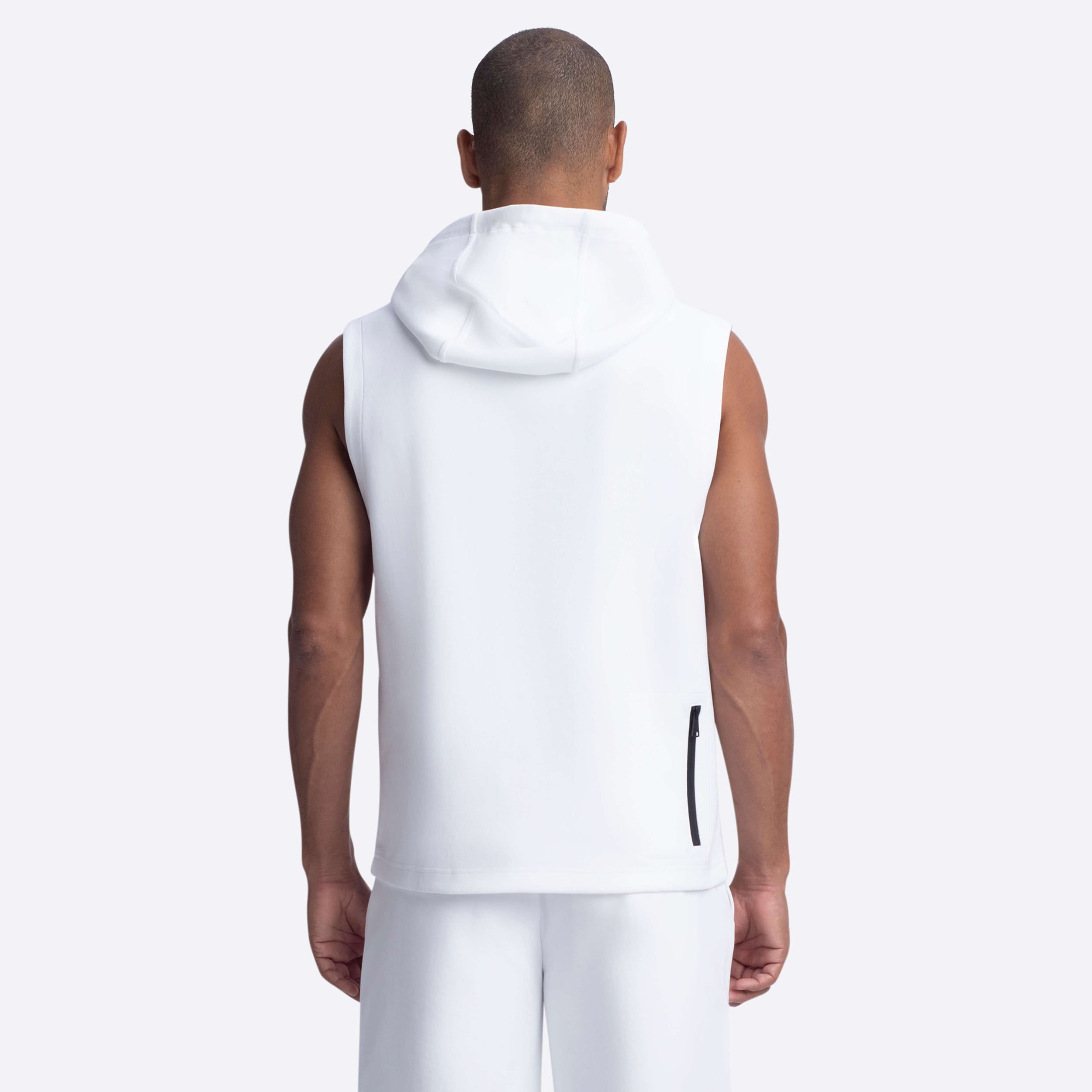 Sleeveless knit sweatshirt hooded vest in COMFORT cotton blend with drawstring hood, zipped kangaroo pocket and back pocket.