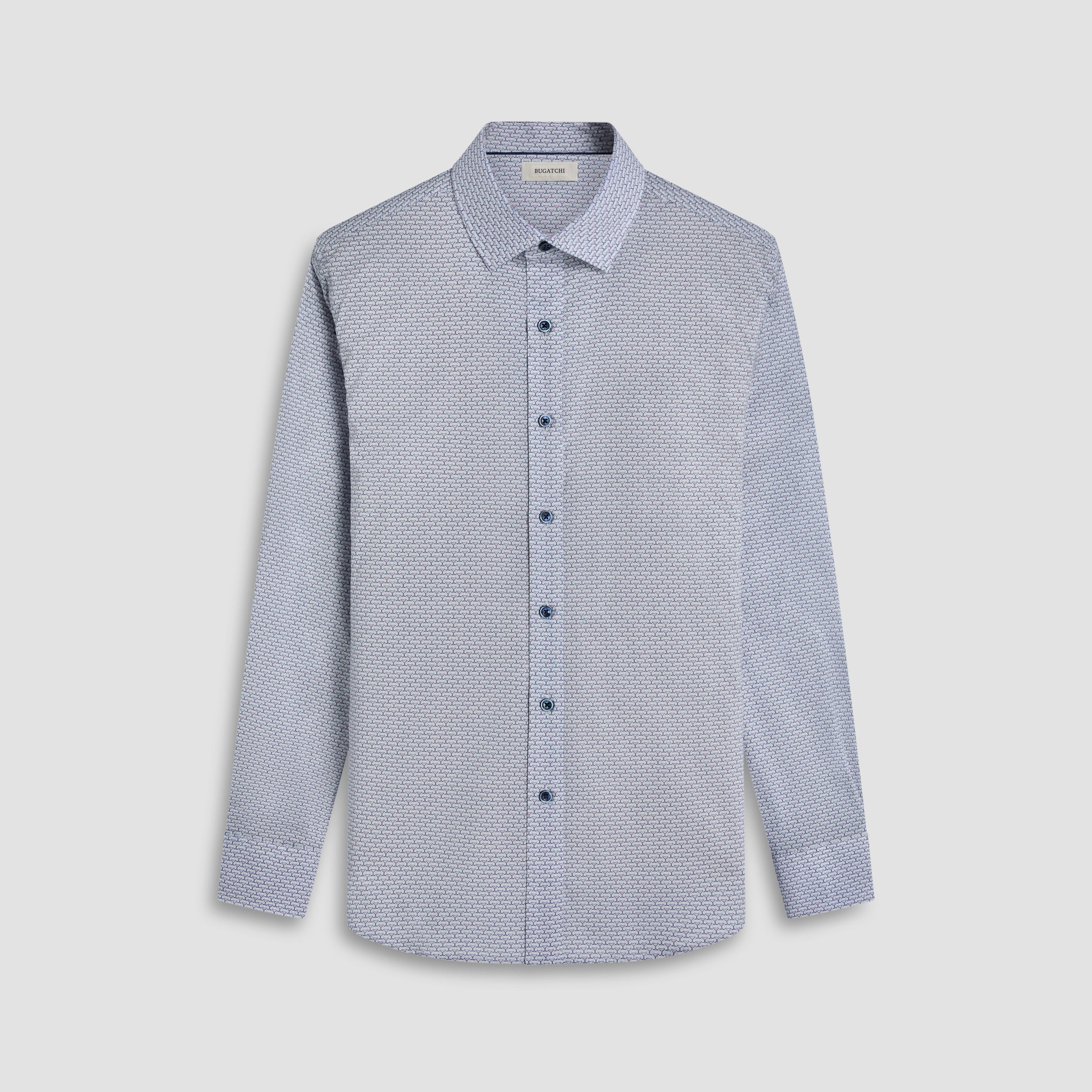 The Julian long-sleeve Comfort Stretch cotton shirt in martini print is crafted from premium Italian fabric. Designed for versatility, it features a point collar, mother-of-pearl buttons, a curved hem that can be worn tucked or untucked, and notched cuffs adjustable for a custom fit-wear them snug or loose, or convert them for cufflinks. A refined choice for any occasion.