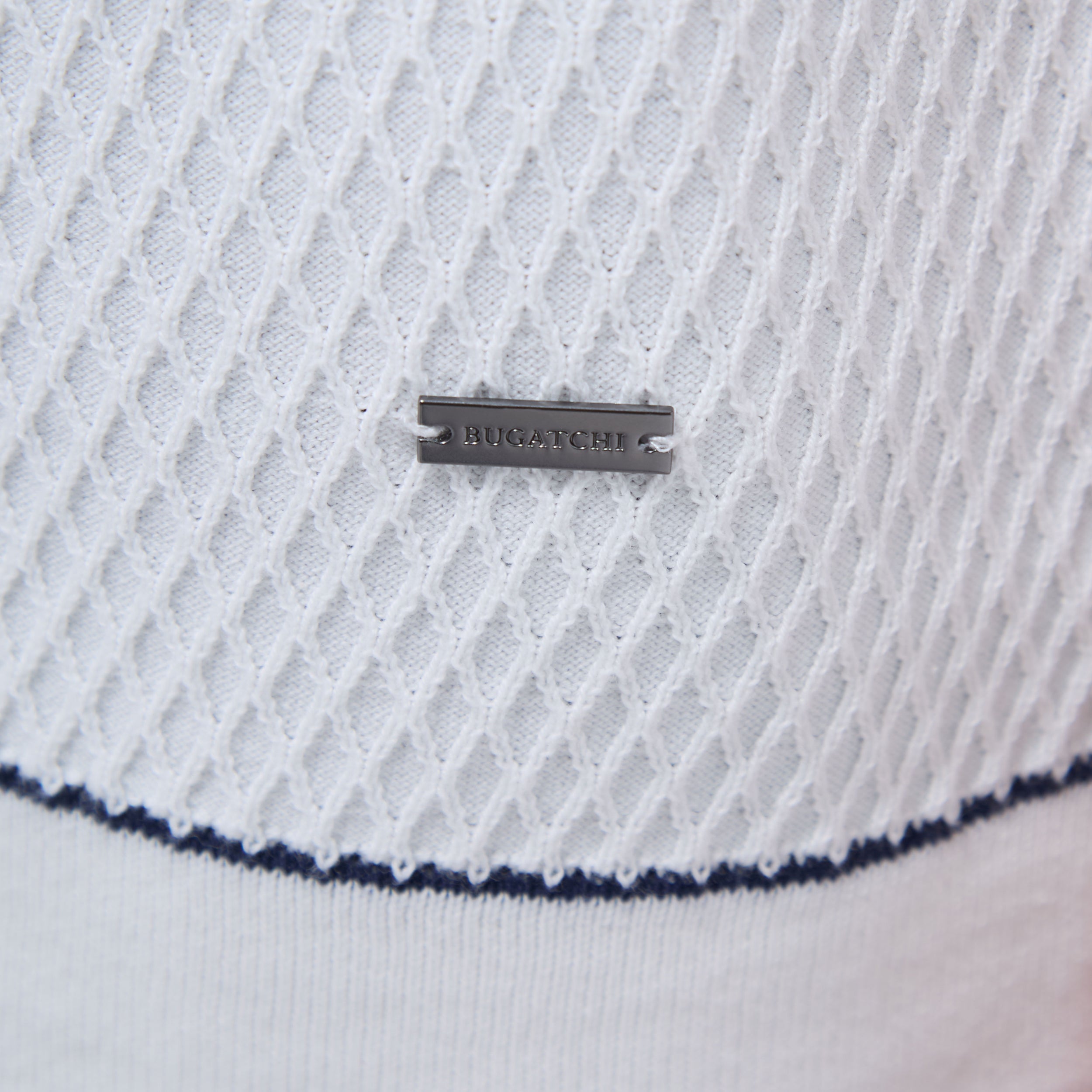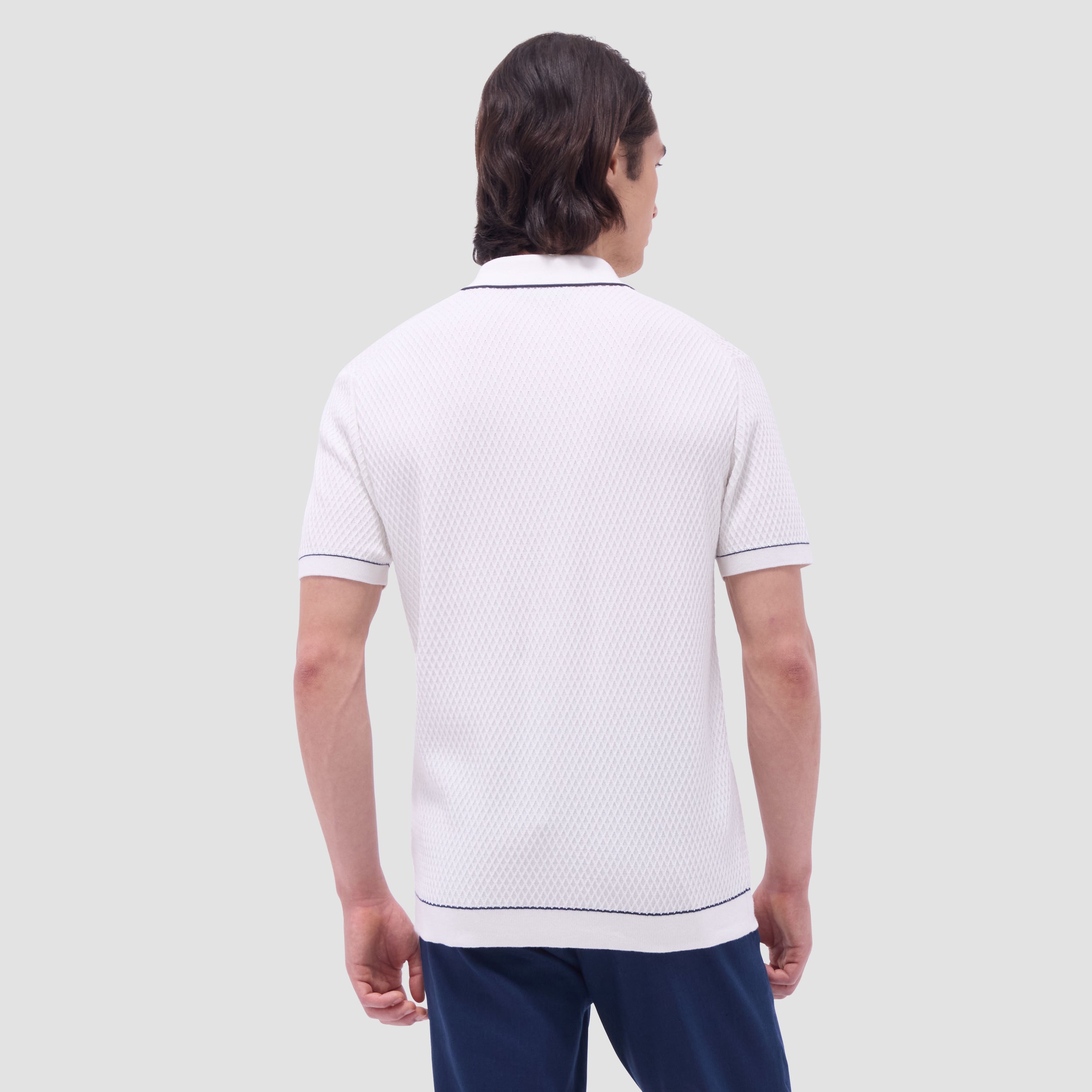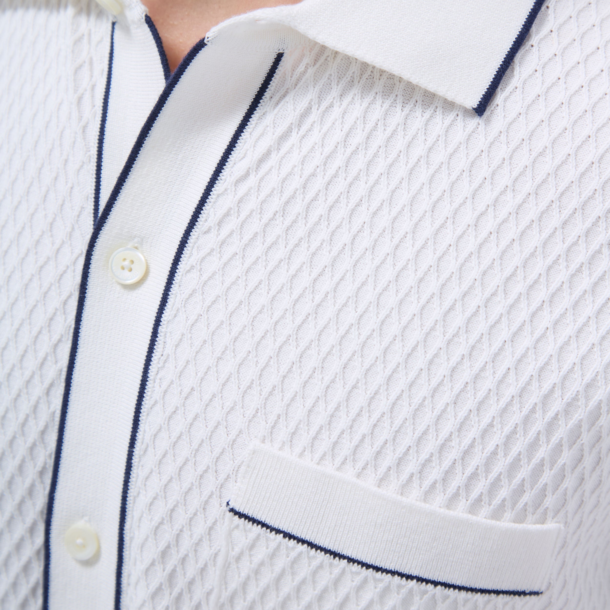 This short-sleeve, full-button knit shirt is made from a cotton blend with a textured geometric knit pattern. It features a chest pocket, tonal ribbed collar, cuffs, and placket for a clean, structured look, accented with contrast tipping adding for a subtler refined touch. Its combination of classic design and modern detailing makes it versatile for both casual and semi-formal occasions.