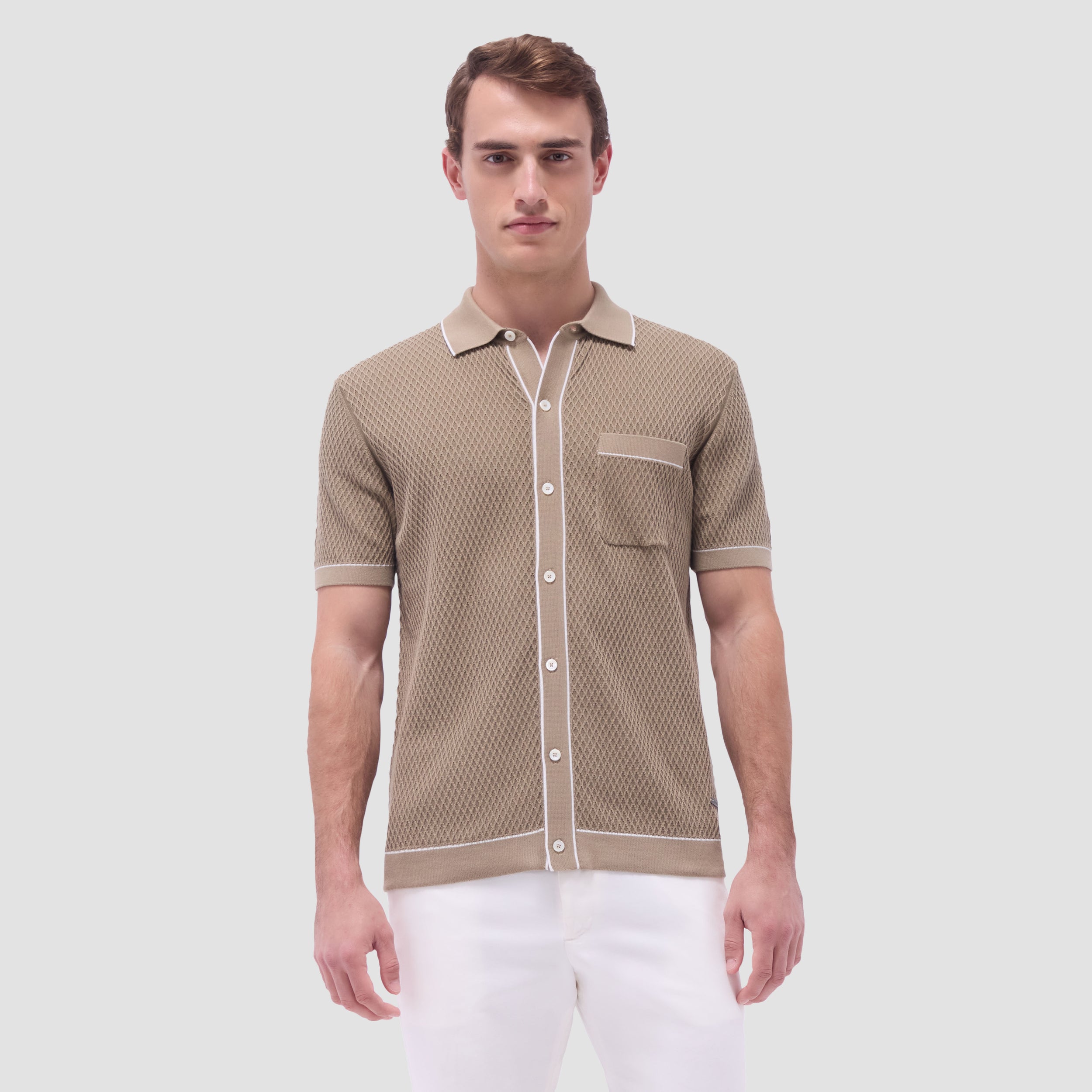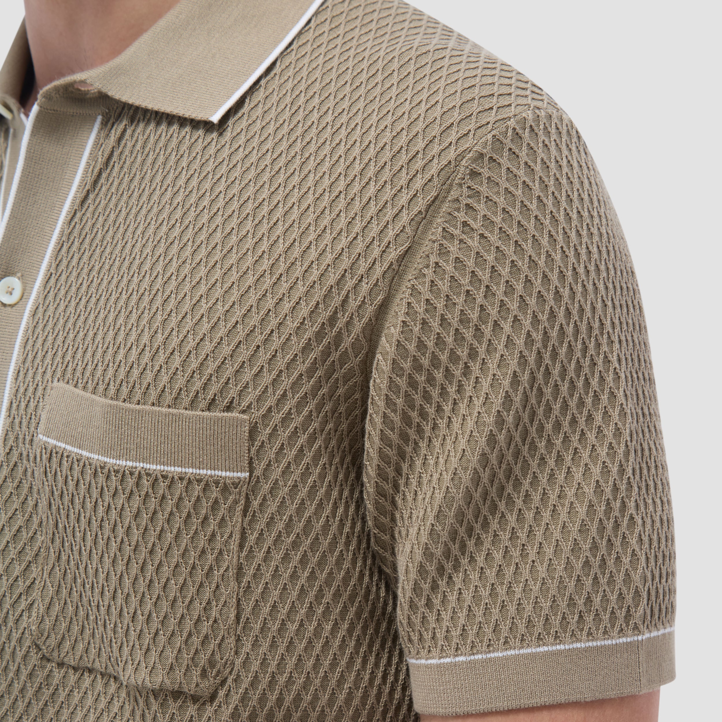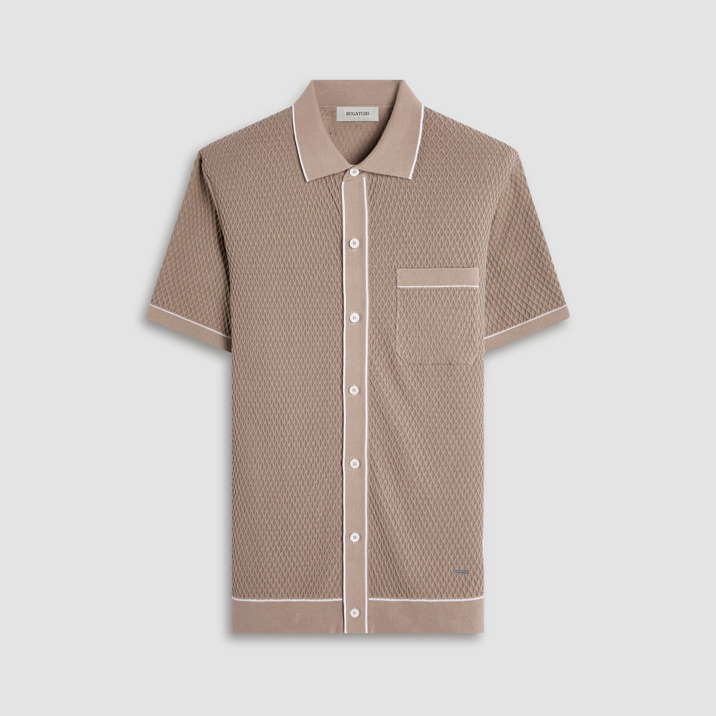 This short-sleeve, full-button knit shirt is made from a cotton blend with a textured geometric knit pattern. It features a chest pocket, tonal ribbed collar, cuffs, and placket for a clean, structured look, accented with contrast tipping adding for a subtler refined touch. Its combination of classic design and modern detailing makes it versatile for both casual and semi-formal occasions.