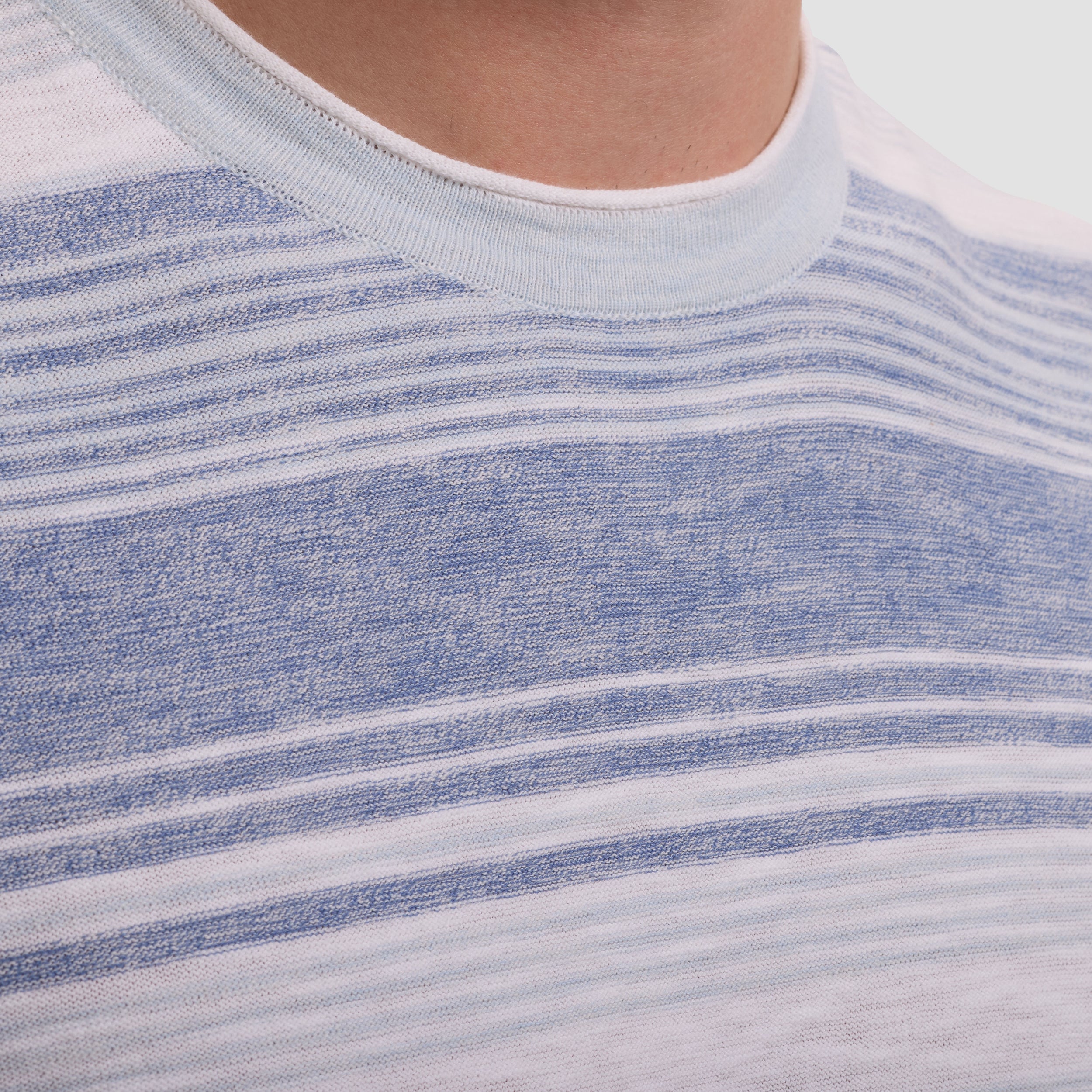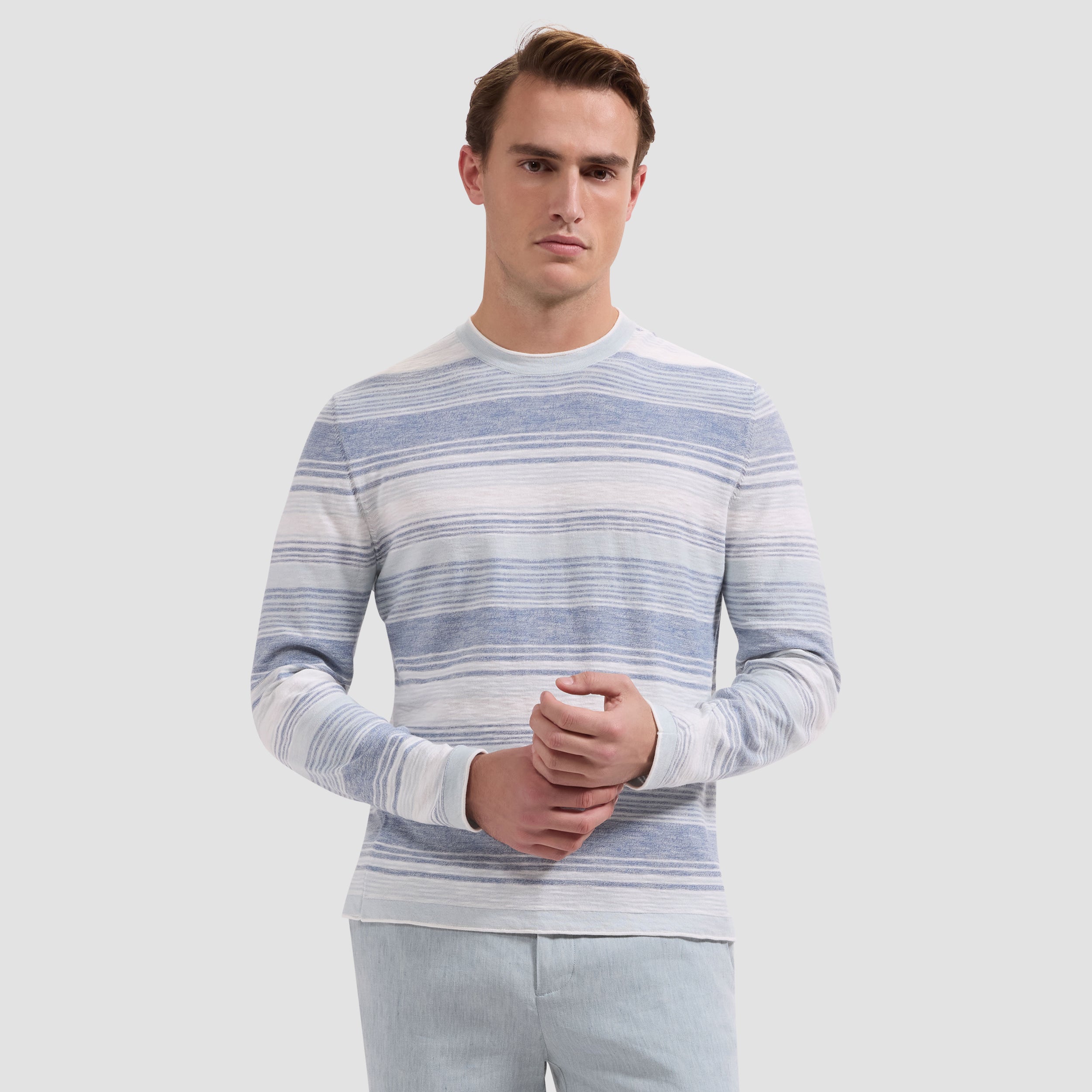 Crafted from 100% cotton, this lightweight crewneck sweater features a soft, heathered finish with tonal horizontal stripes for a relaxed yet refined look. Designed with a classic crew neckline and clean cuffs, it offers effortless versatility—ideal for layering or wearing on its own across seasons.