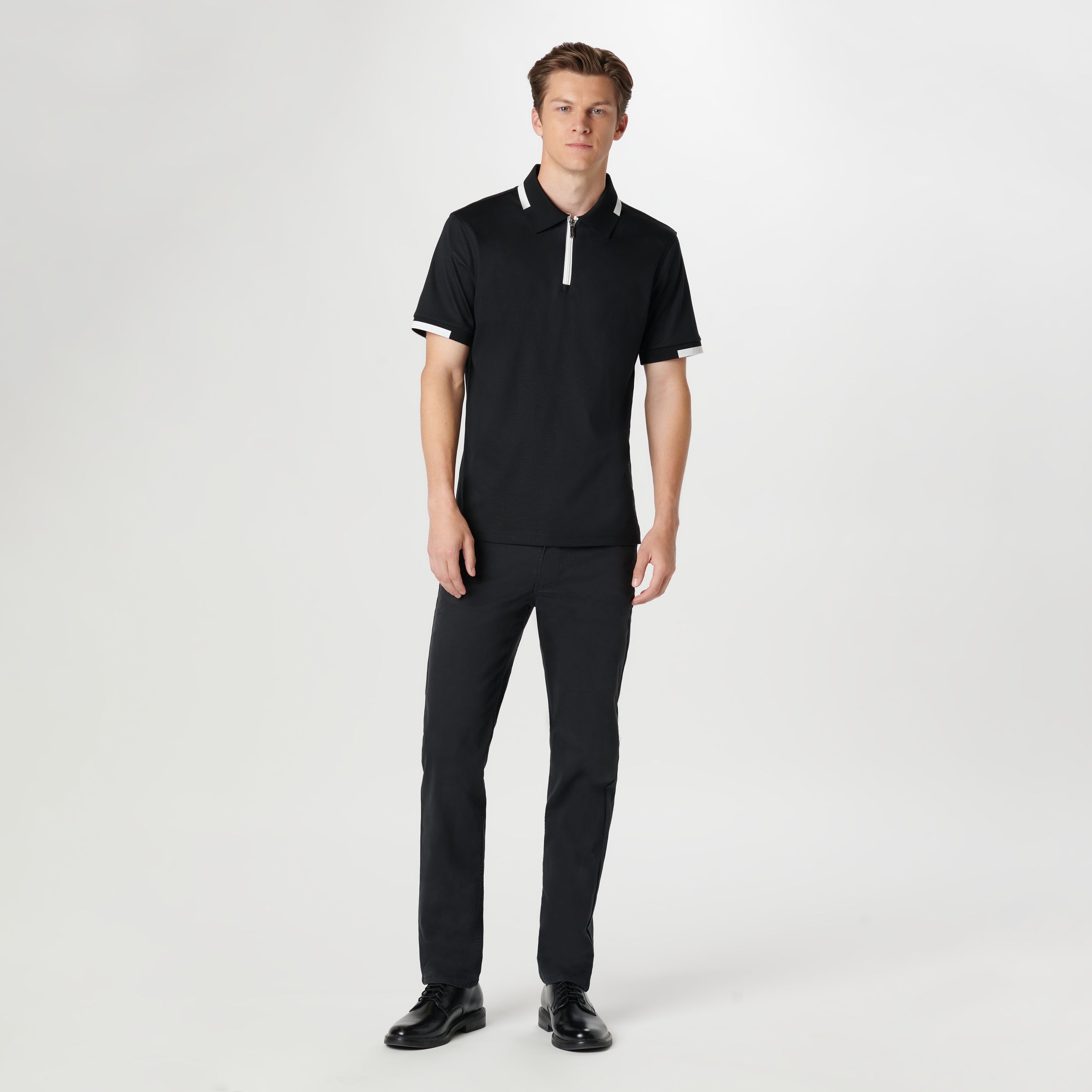 This classic yet stylish short-sleeved polo shirt in 100% Pima cotton features a quarter zipper closure, a polo collar and wide band tipping detail, adding a touch of flair to casual.