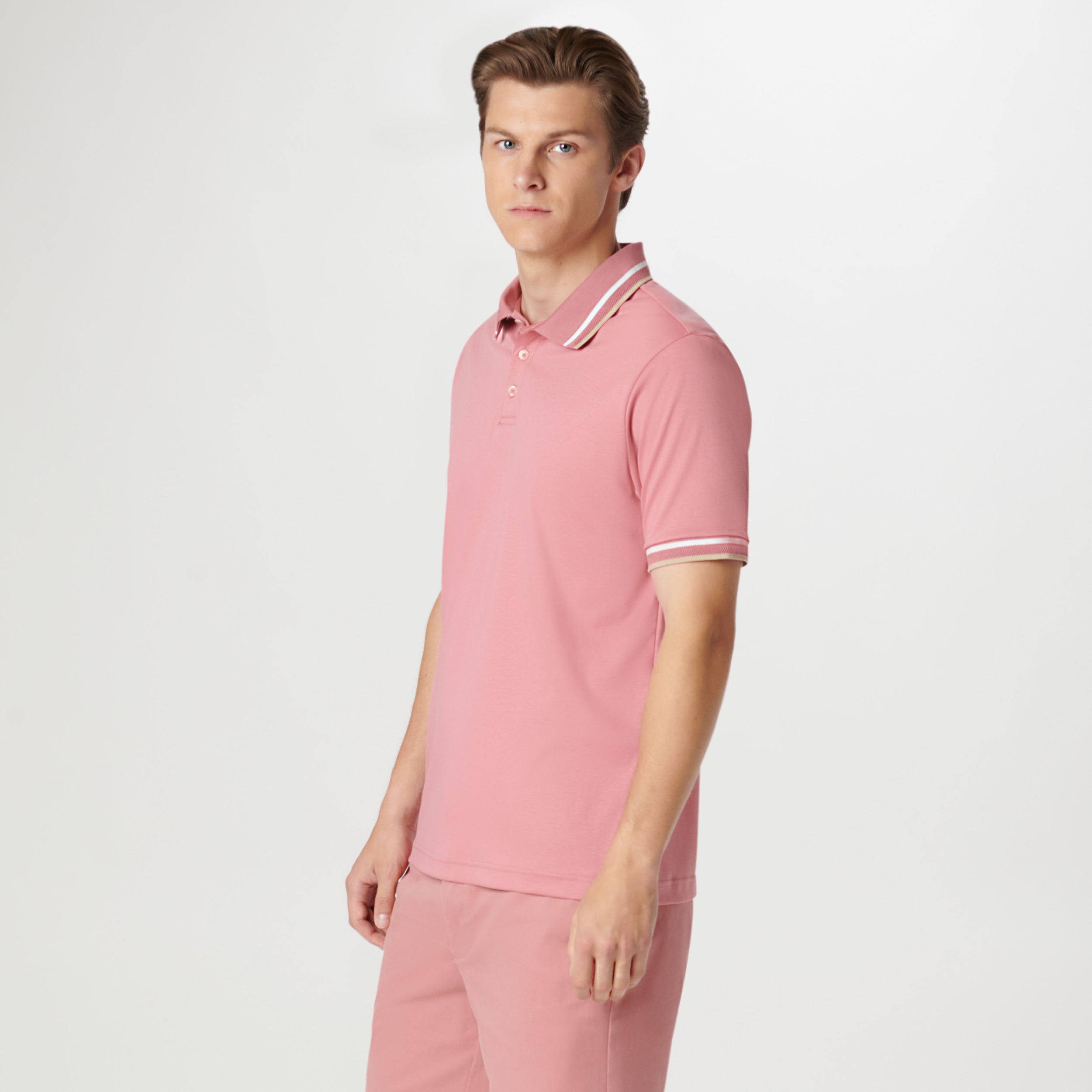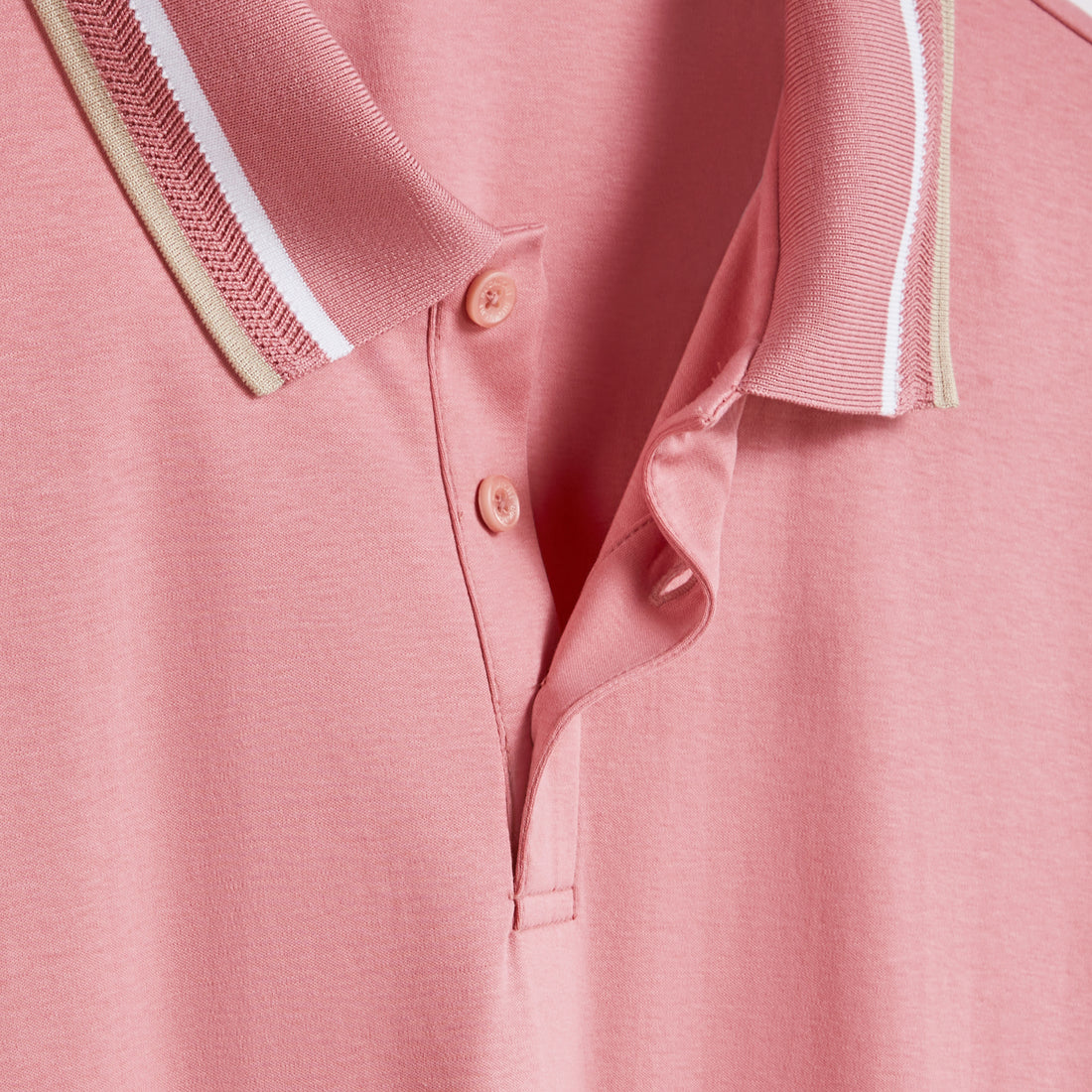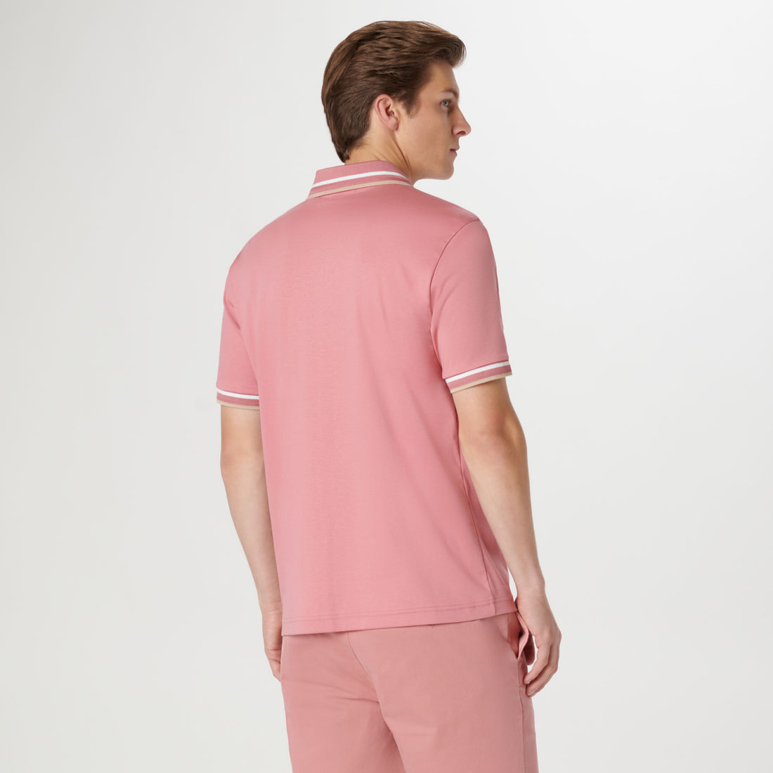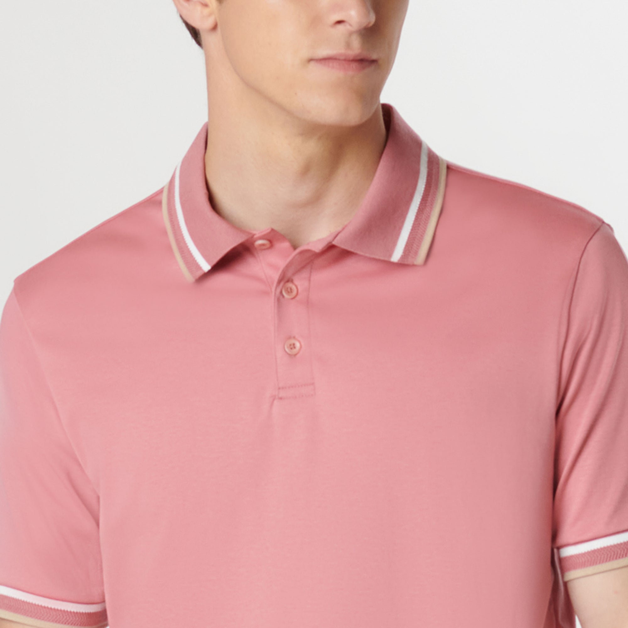 This classic yet stylish short-sleeved polo shirt in solid 100% Pima cotton features a three button placket and elegant chevron stripe tipped polo collar and armbands, adding a touch of sophistication to its timeless design.