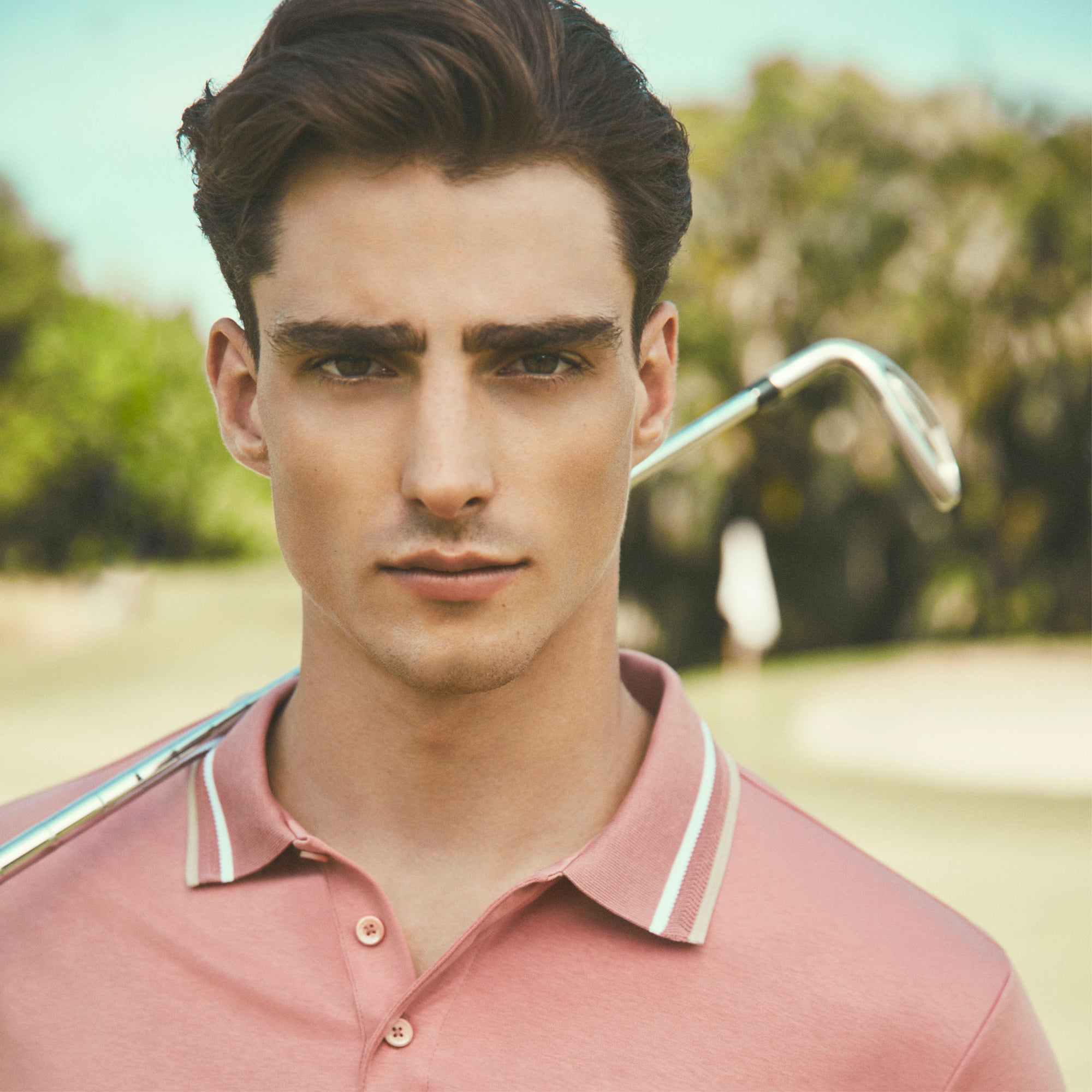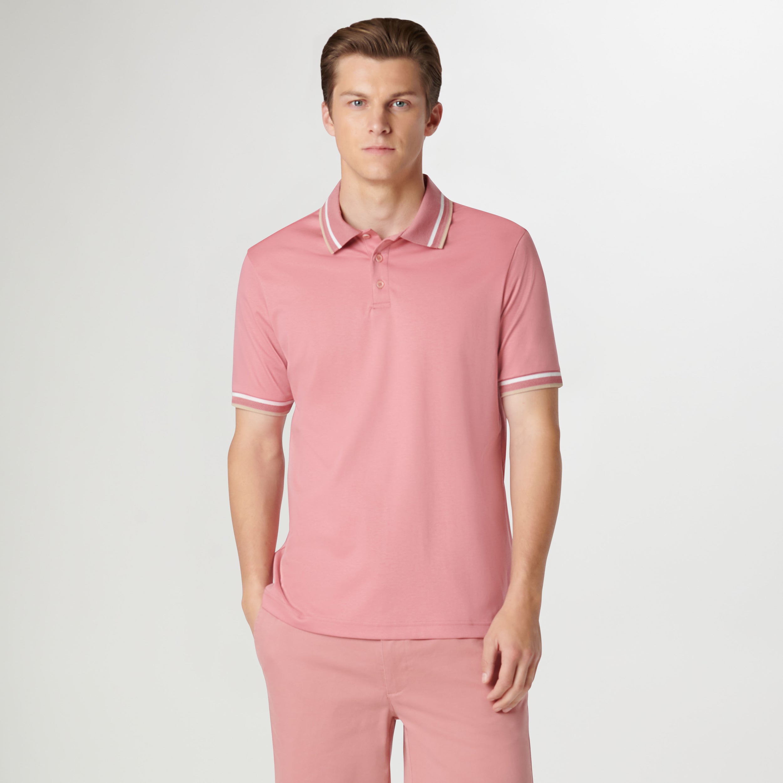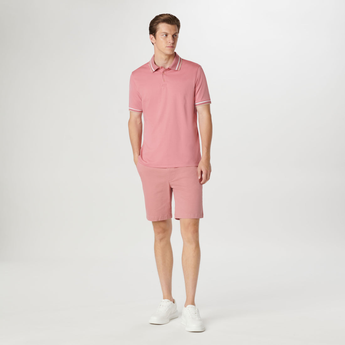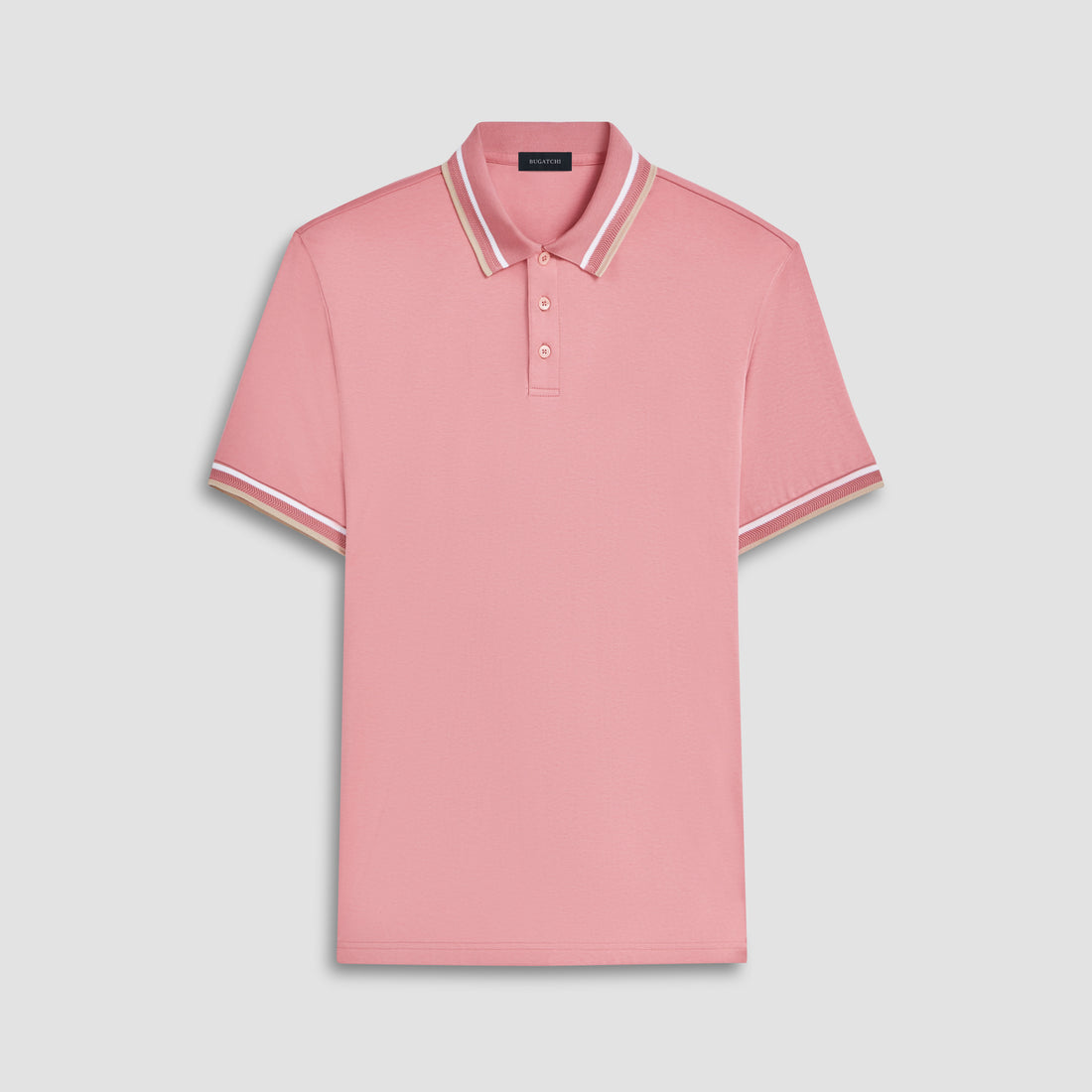 This classic yet stylish short-sleeved polo shirt in solid 100% Pima cotton features a three button placket and elegant chevron stripe tipped polo collar and armbands, adding a touch of sophistication to its timeless design.