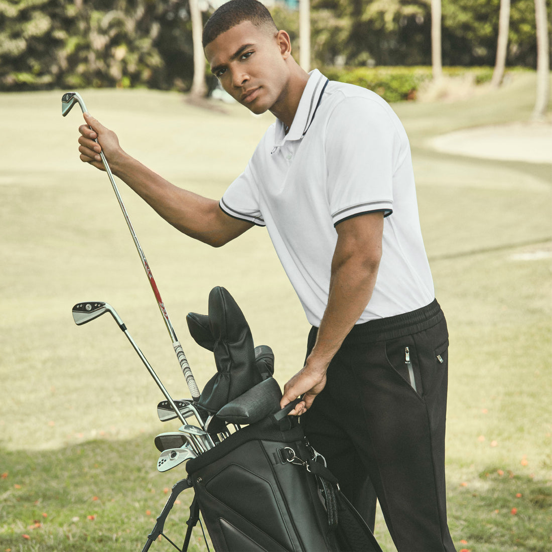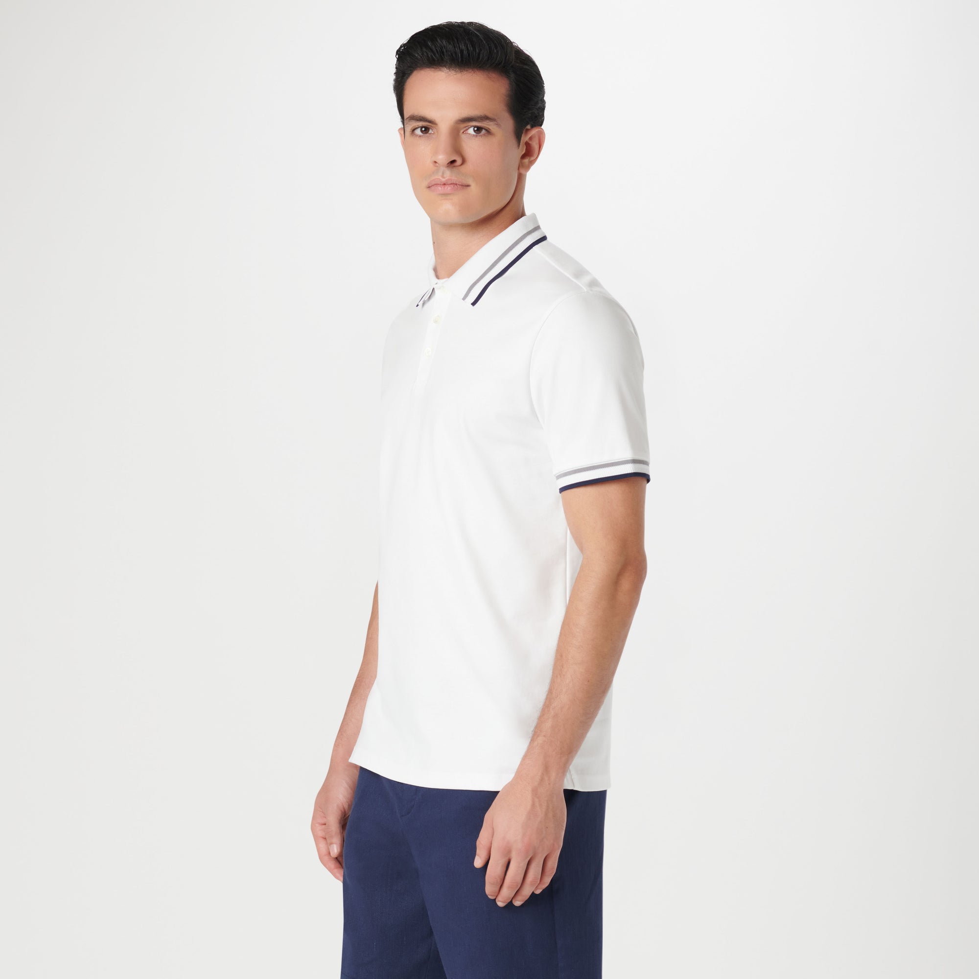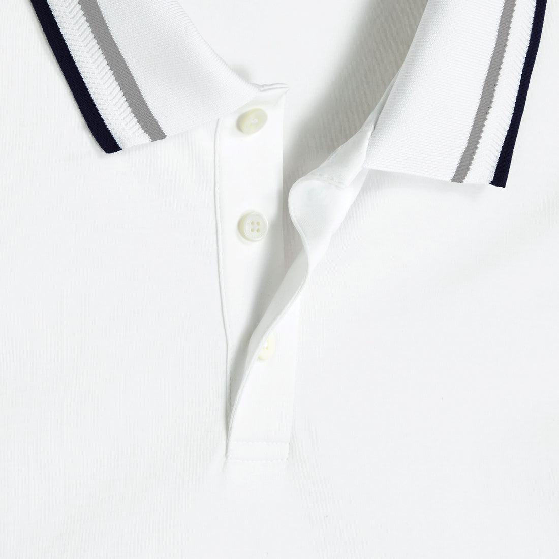 This classic yet stylish short-sleeved polo shirt in solid 100% Pima cotton features a three button placket and elegant chevron stripe tipped polo collar and armbands, adding a touch of sophistication to its timeless design.
