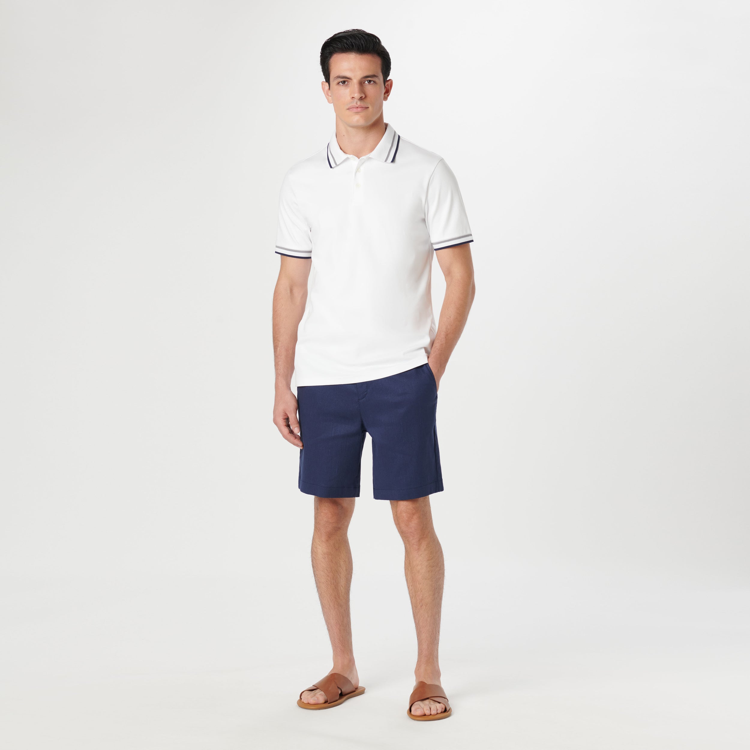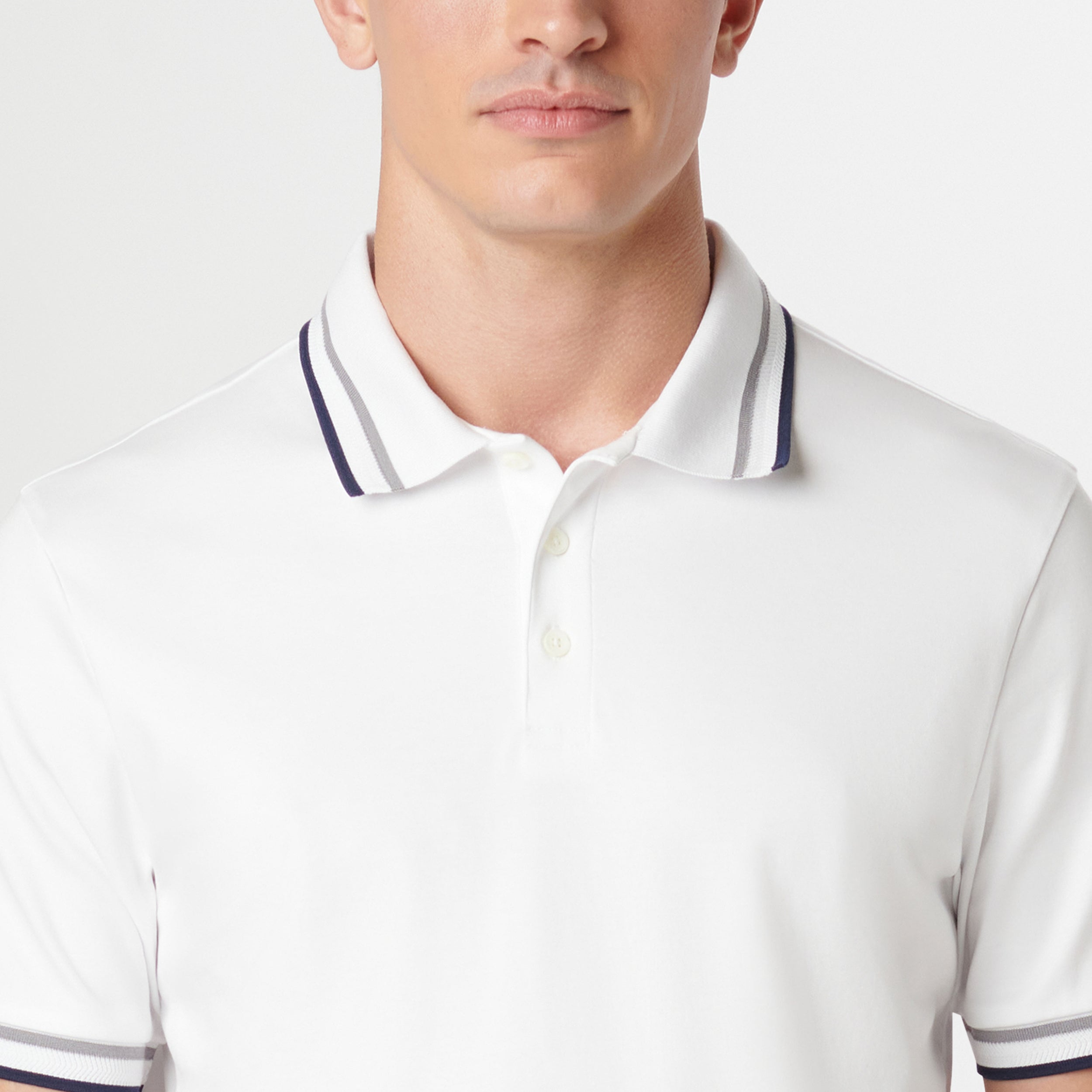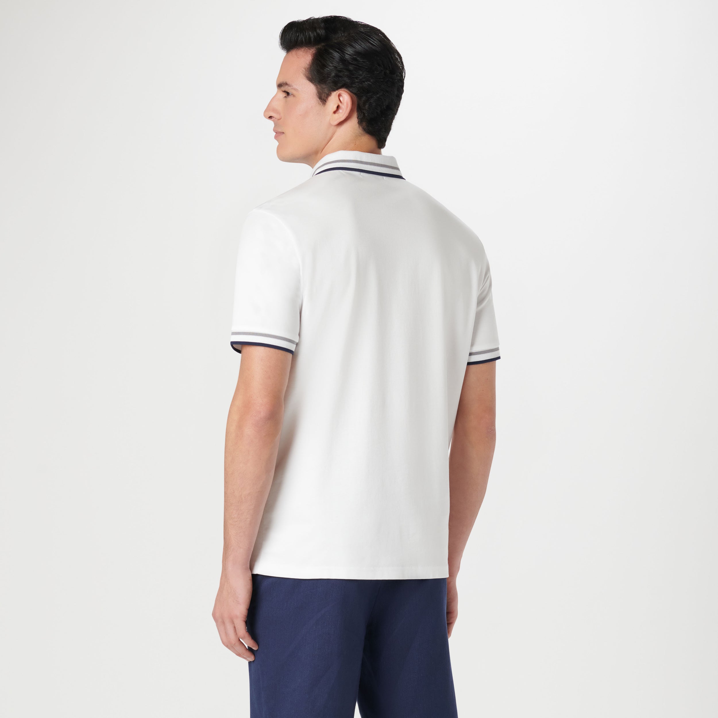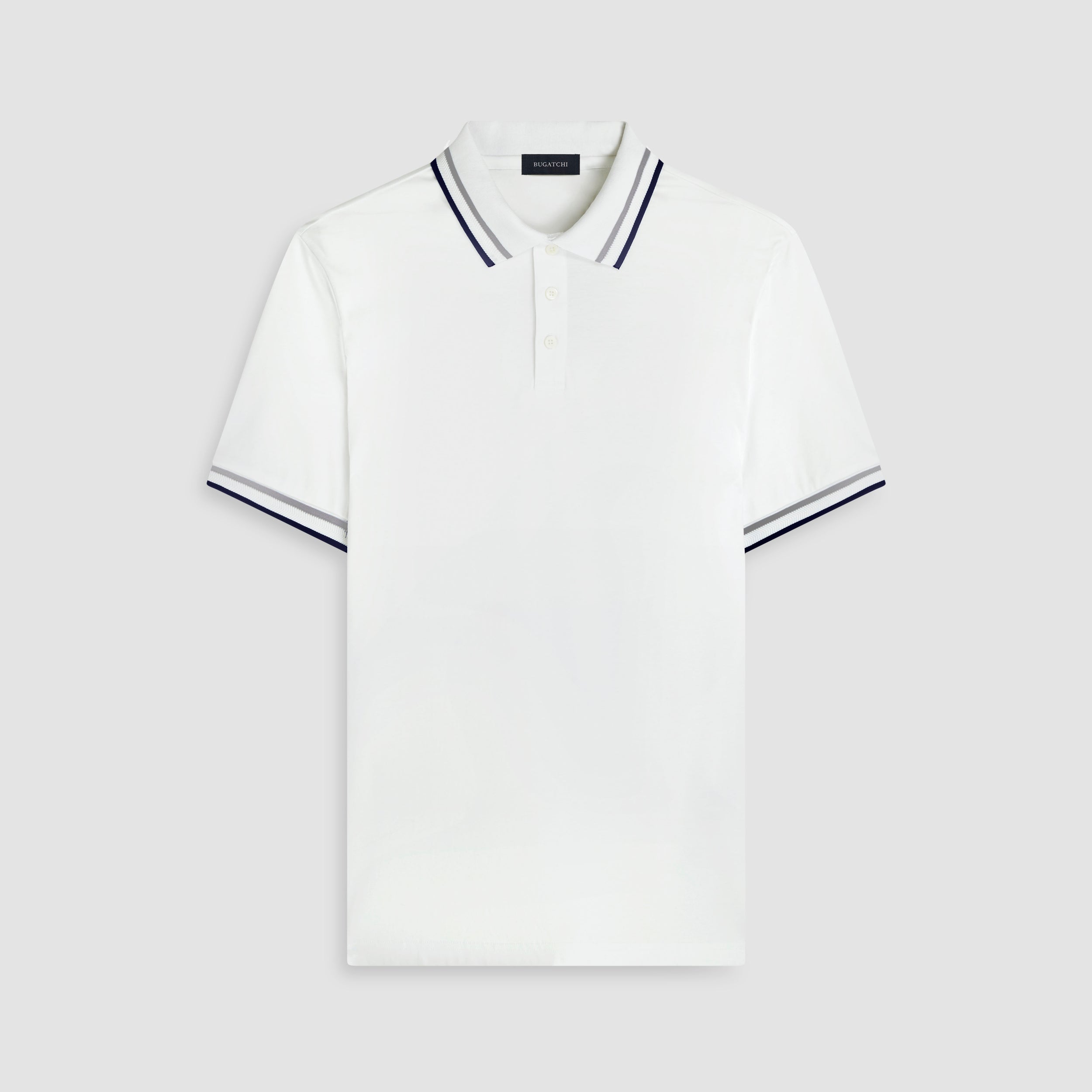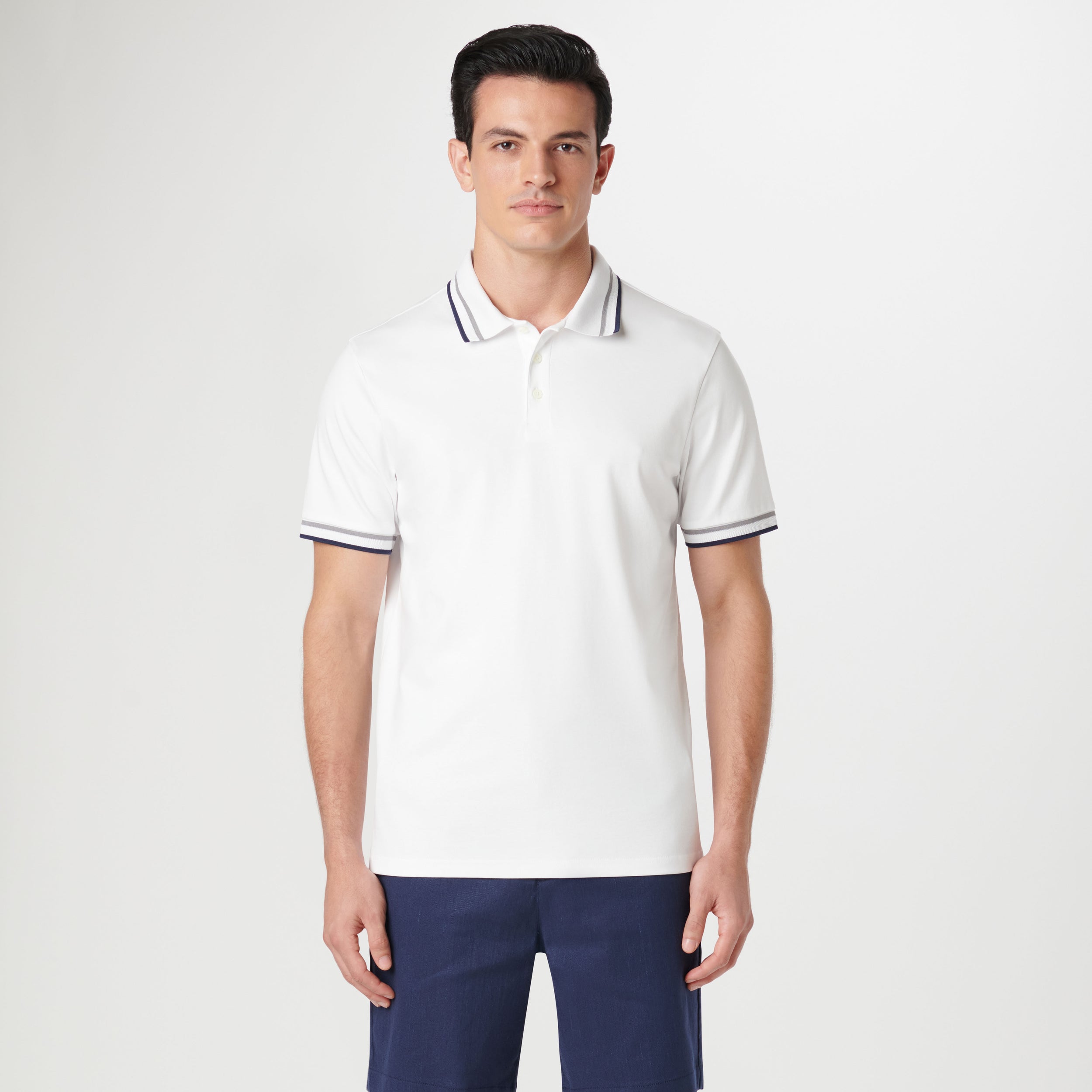 This classic yet stylish short-sleeved polo shirt in solid 100% Pima cotton features a three button placket and elegant chevron stripe tipped polo collar and armbands, adding a touch of sophistication to its timeless design.