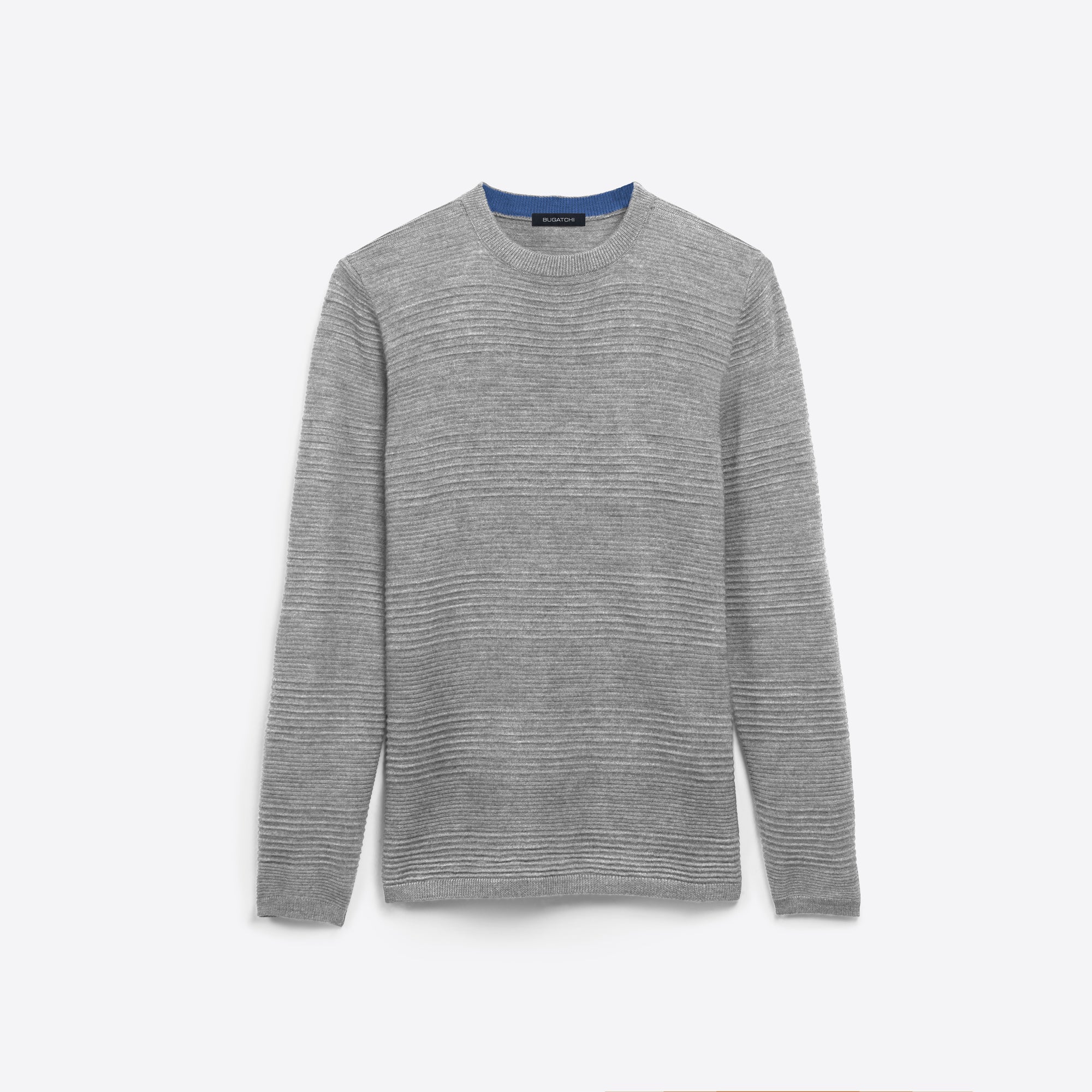 Tonal block-rib long sleeve crew neck sweater in Merino wool blend with solid rib knit collar, cuffs and waistband.