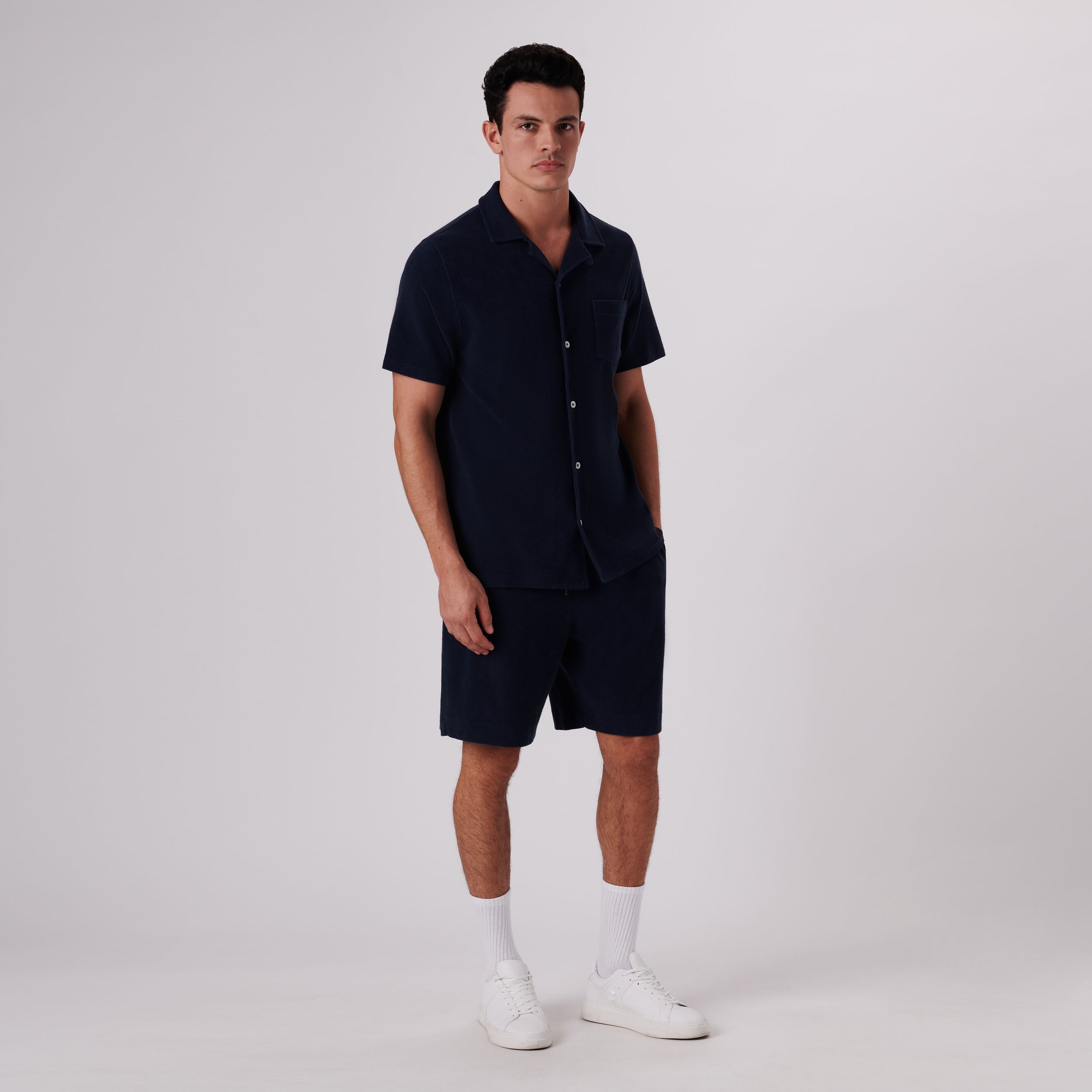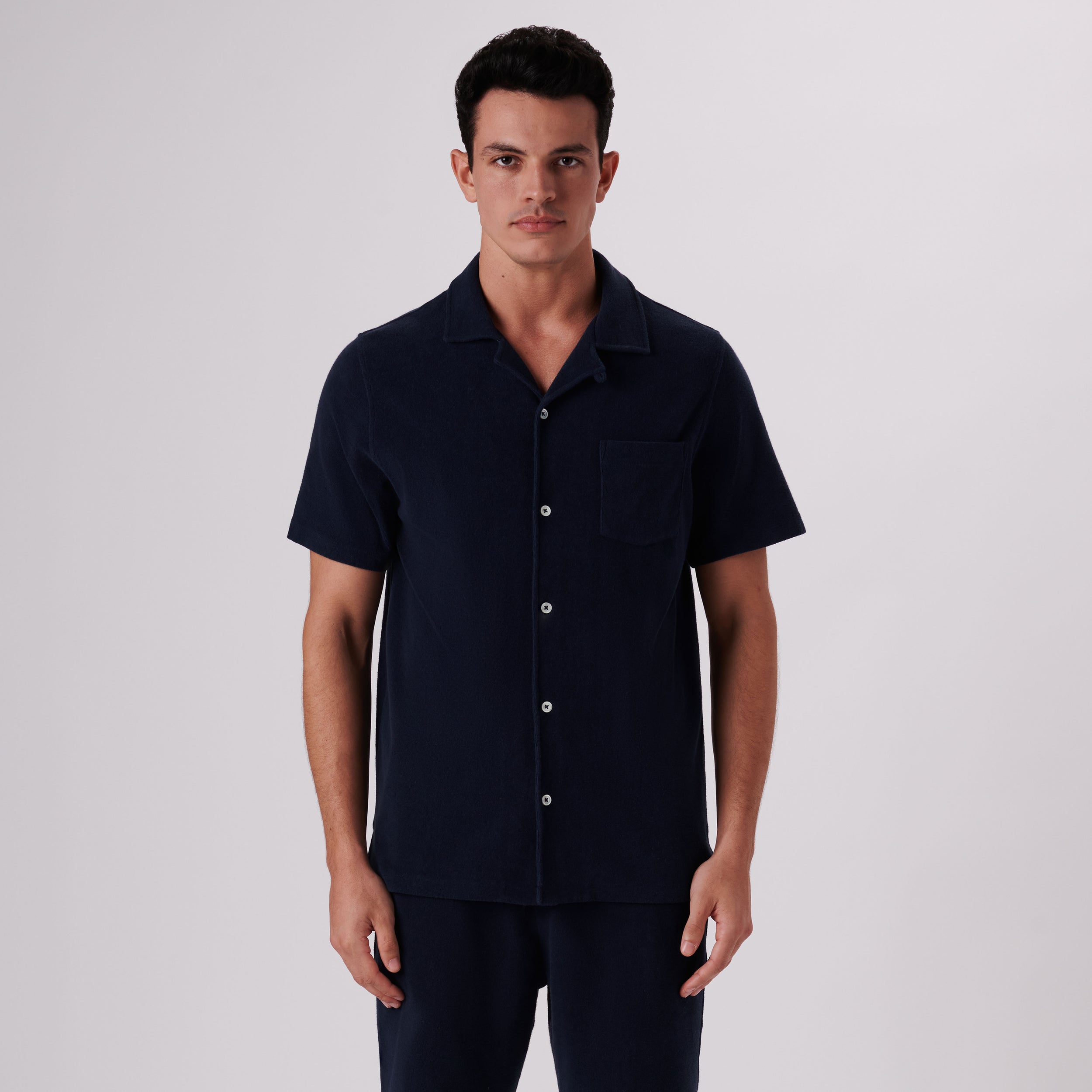 Towelling short-sleeved shirt in soft and absorbent 100% cotton French terry with a camp collar, genuine shell buttons, one chest pocket and a straight hemline.