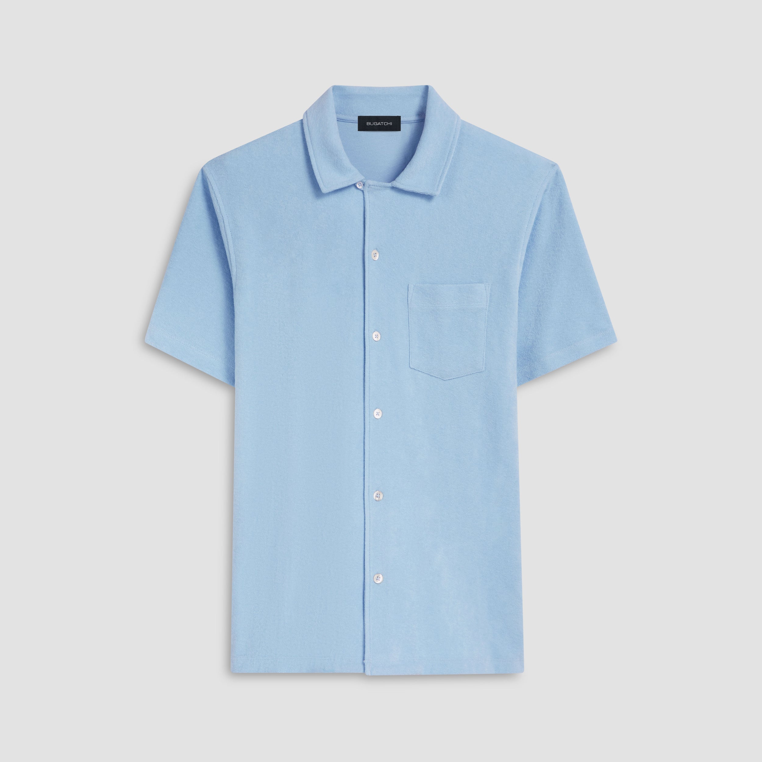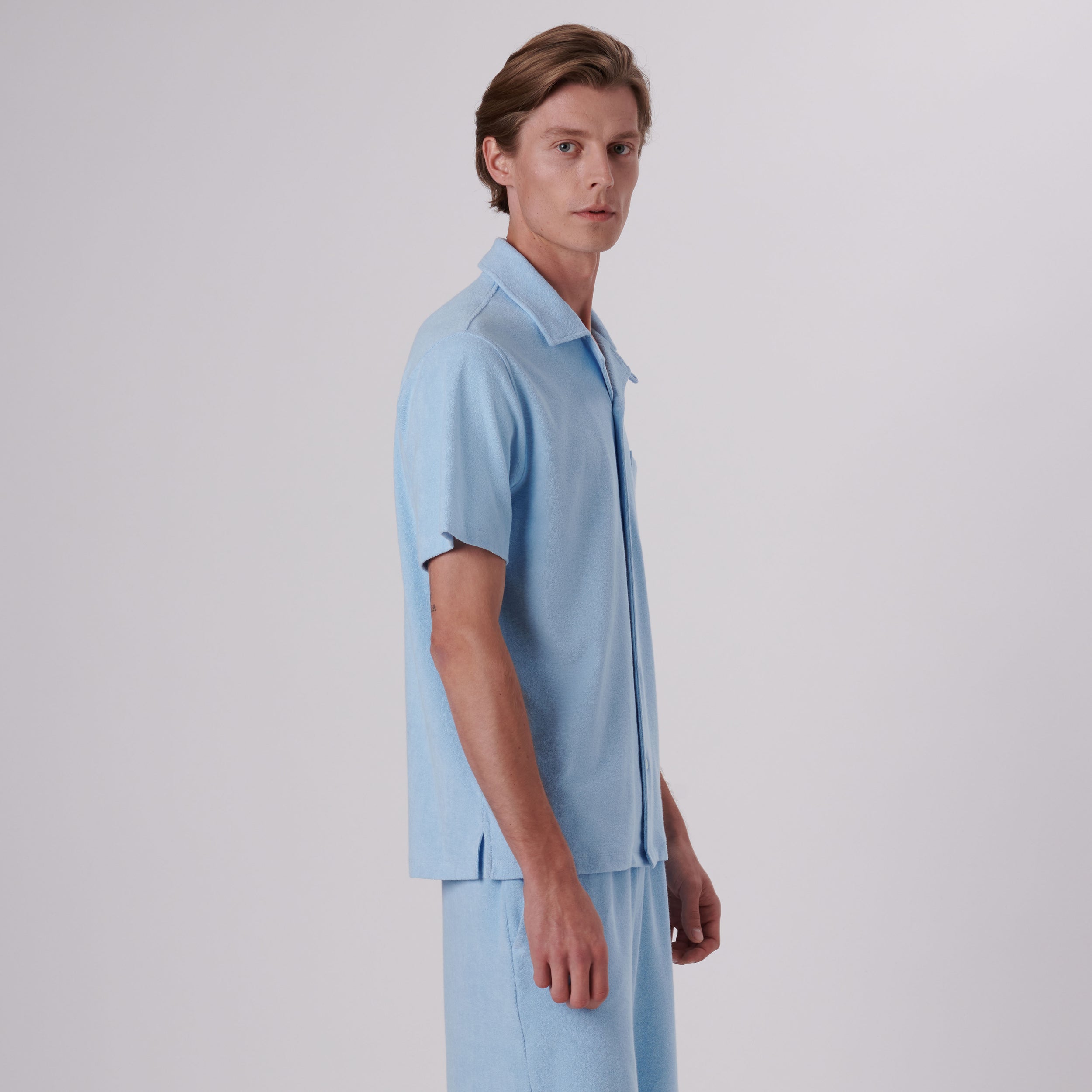 Towelling short-sleeved shirt in soft and absorbent 100% cotton French terry with a camp collar, genuine shell buttons, one chest pocket and a straight hemline.