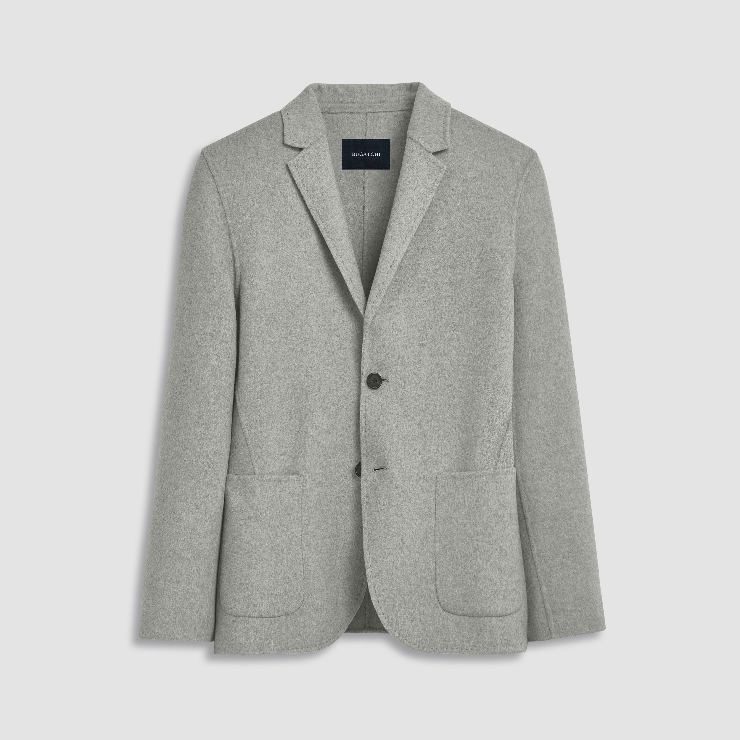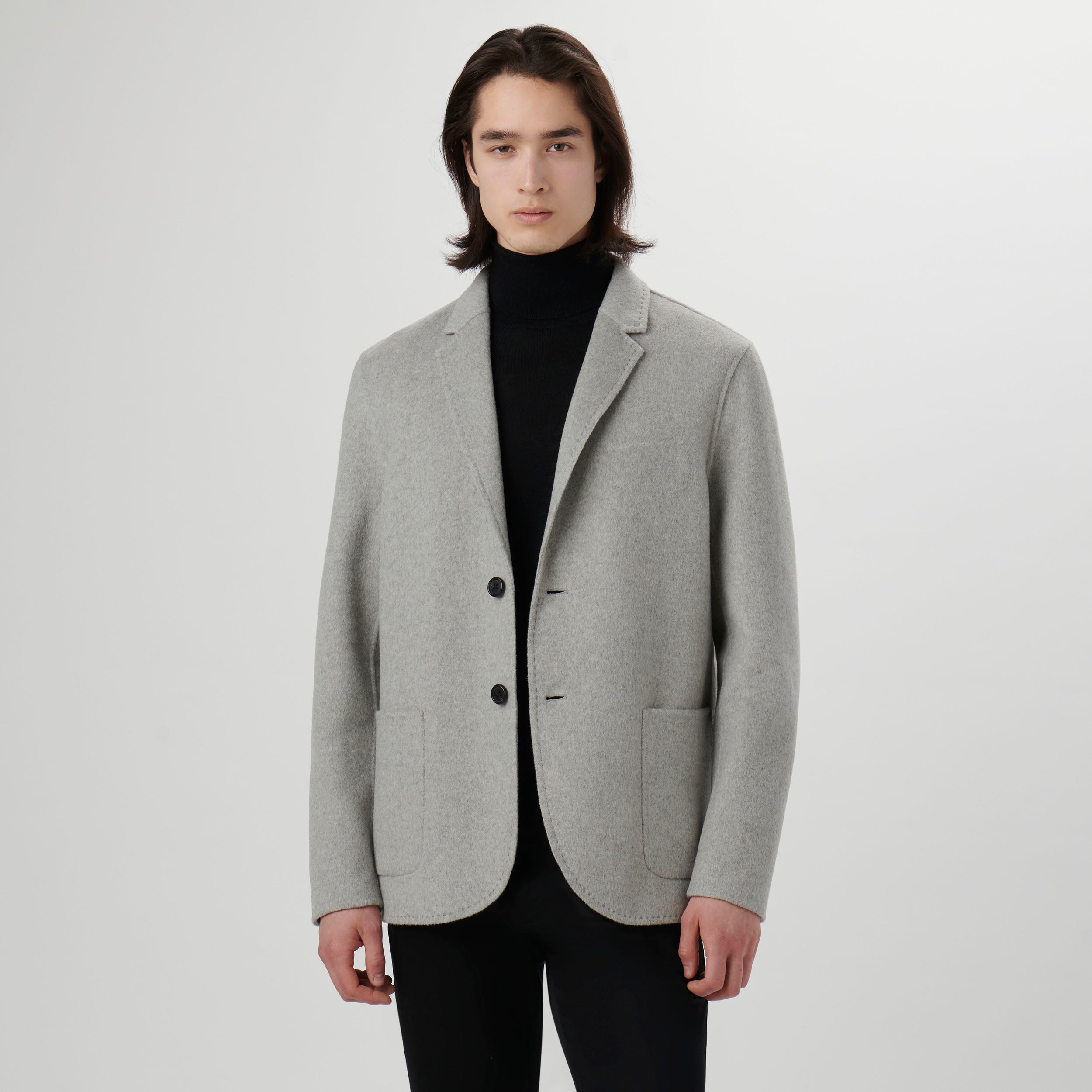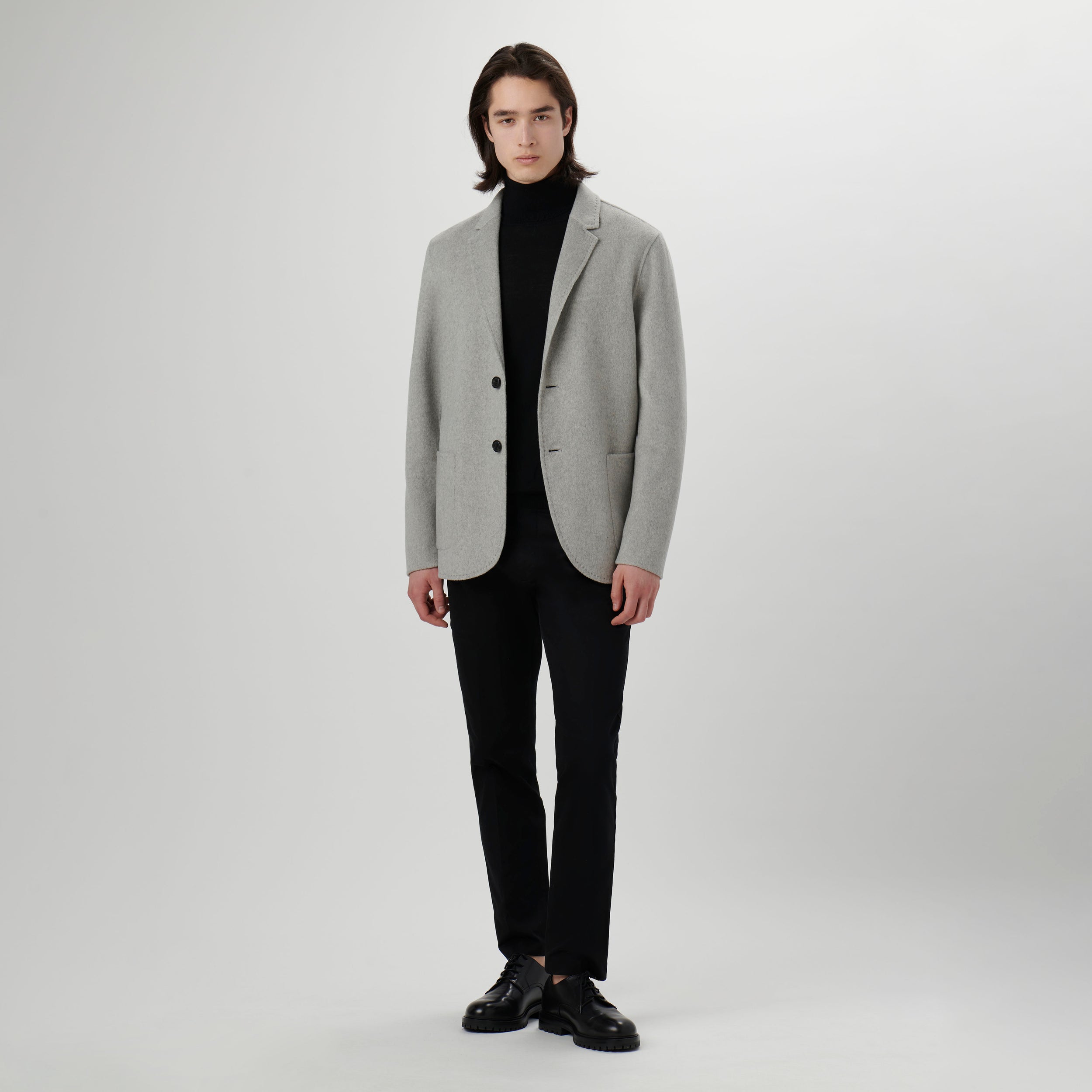 Two button blazer in double knit wool blend with notched lapel and patch pockets.
