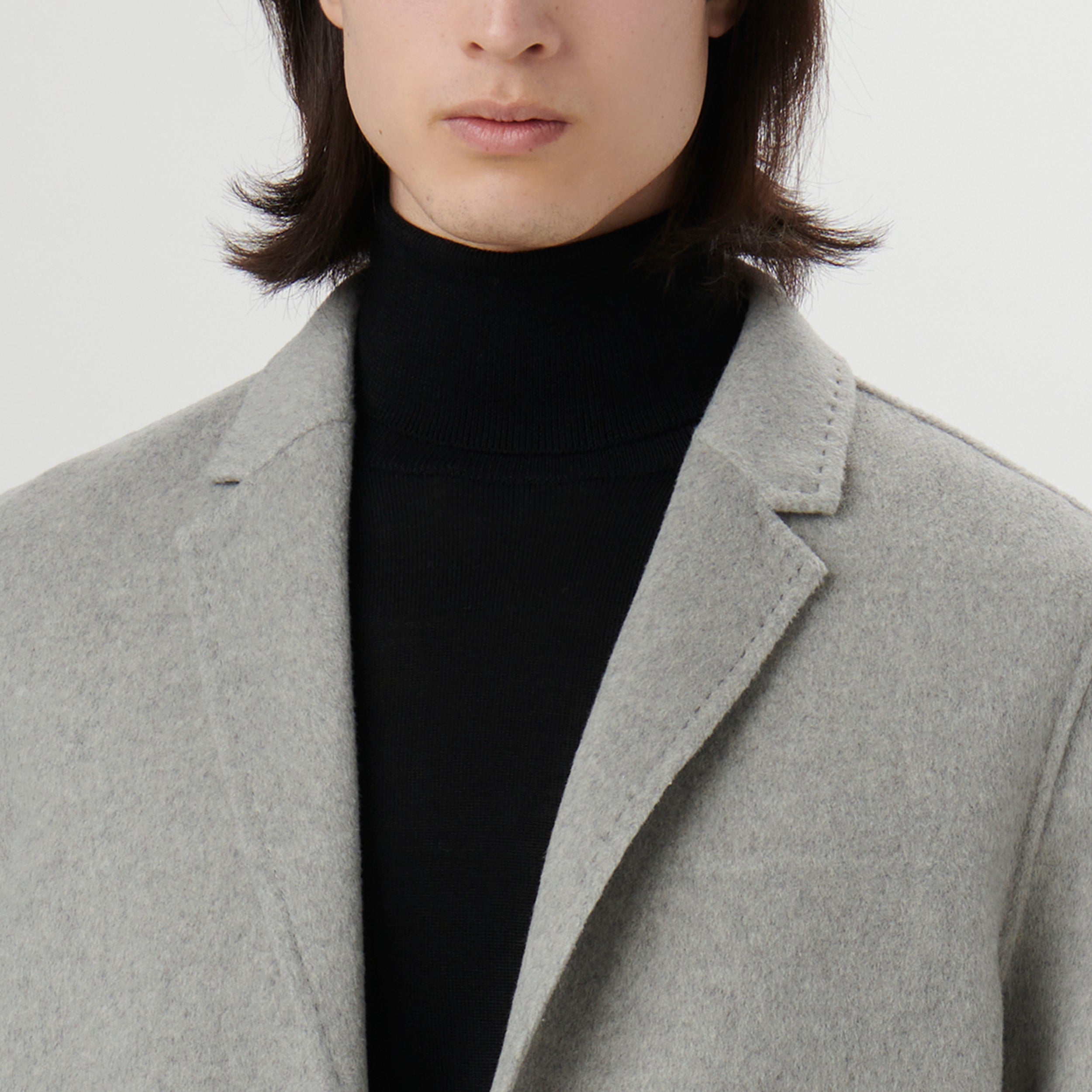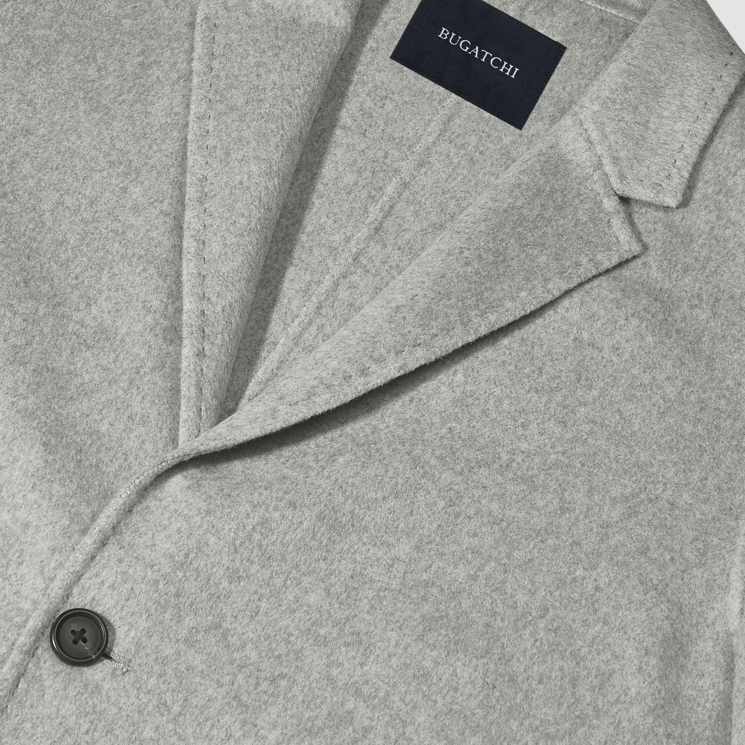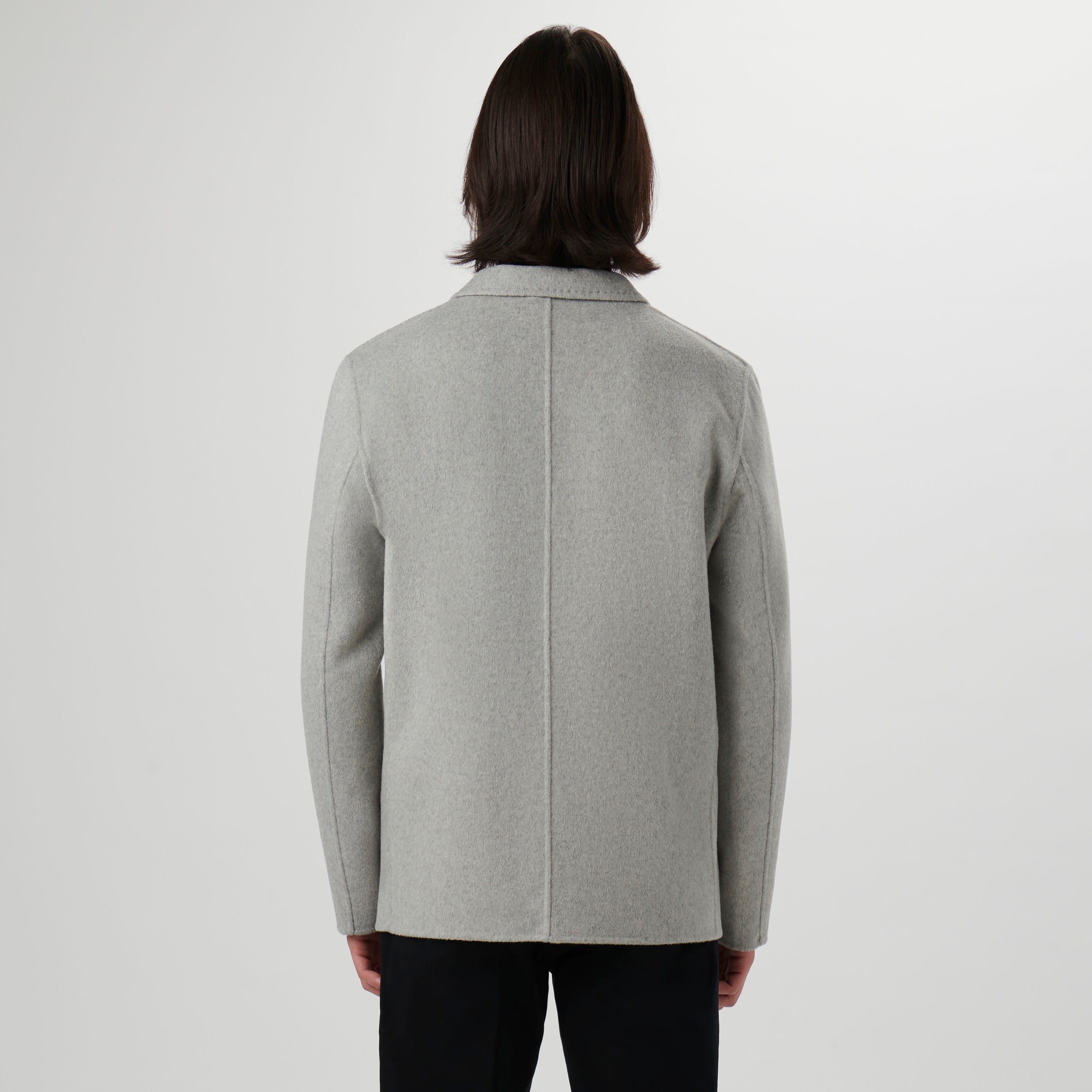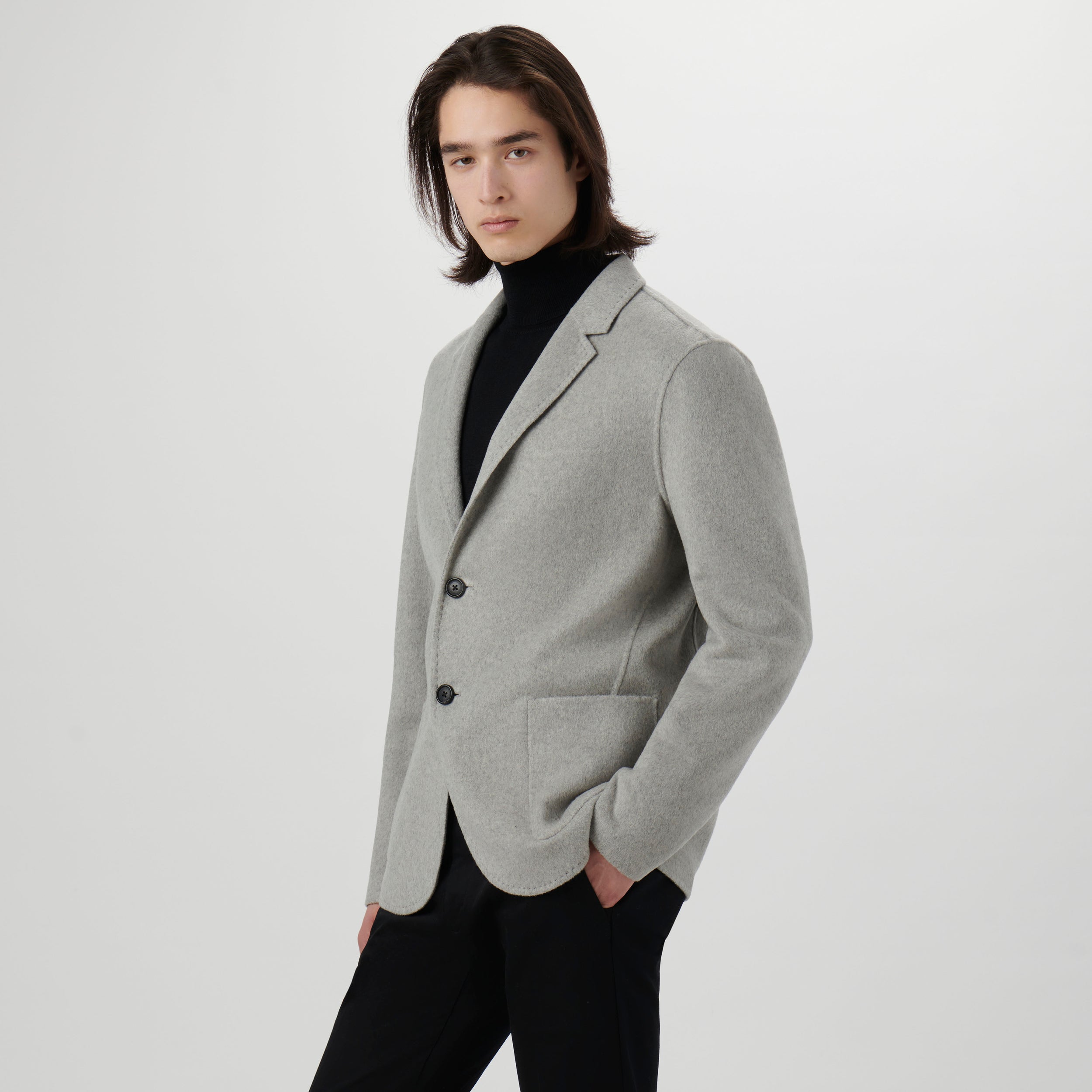 Two button blazer in double knit wool blend with notched lapel and patch pockets.