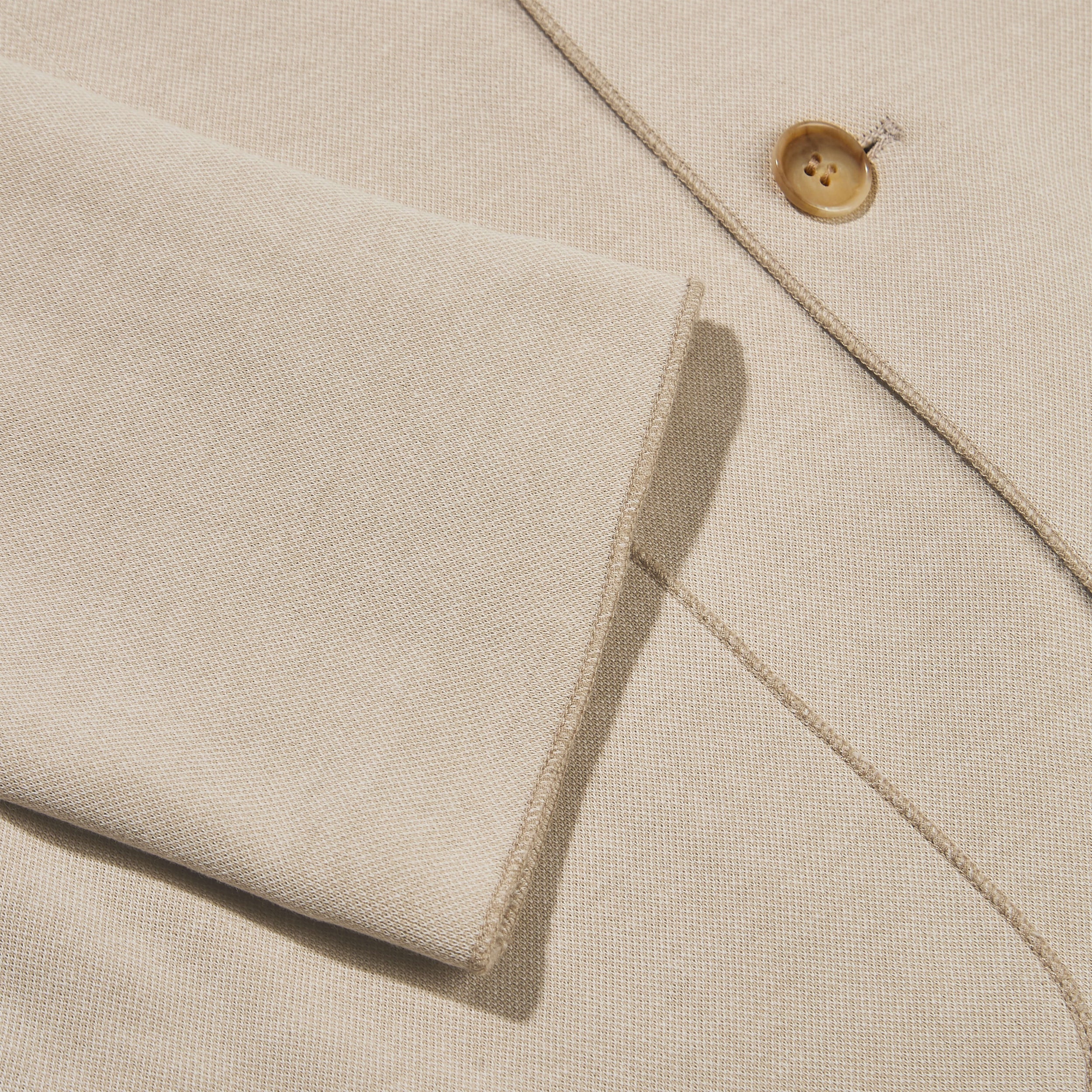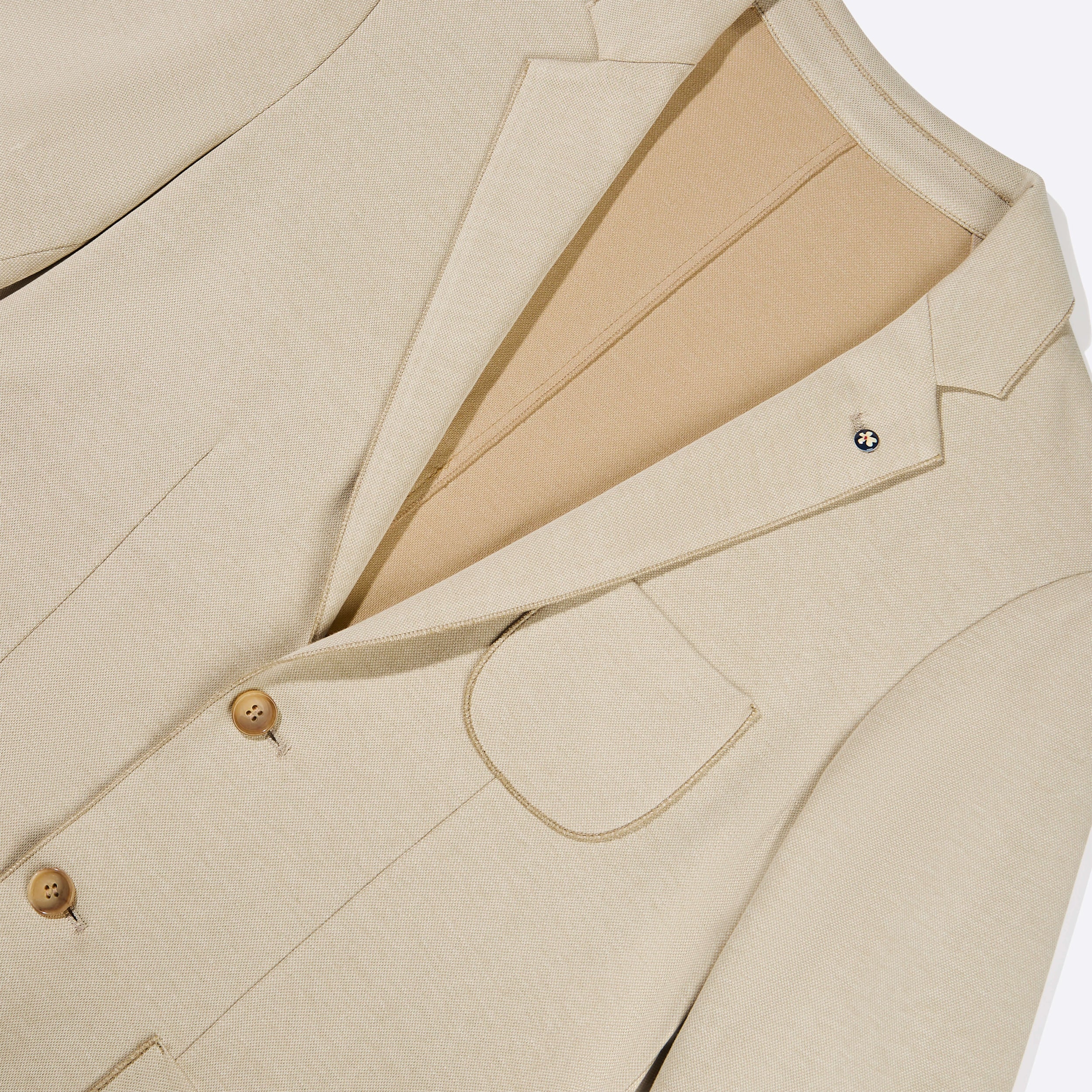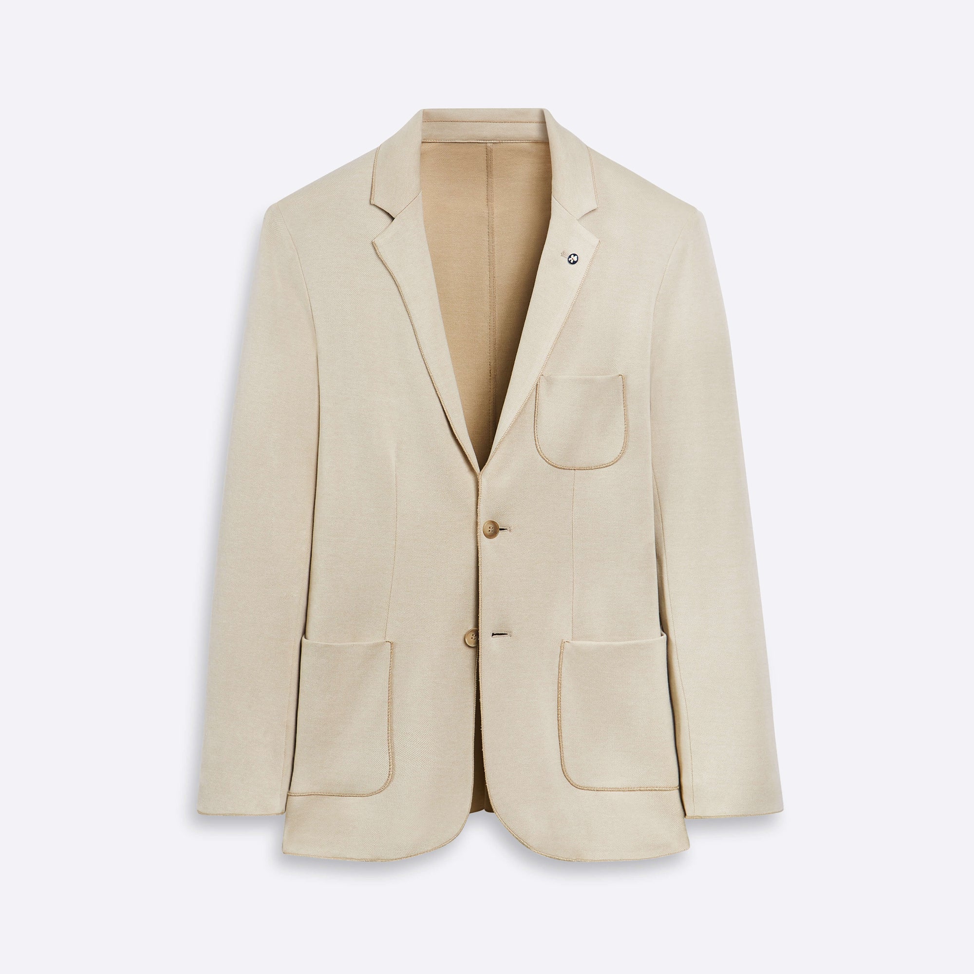 Two button blazer in 100% cotton knit features a soft unconstructed, unlined silhouette and three patch pockets. Made in Italy.