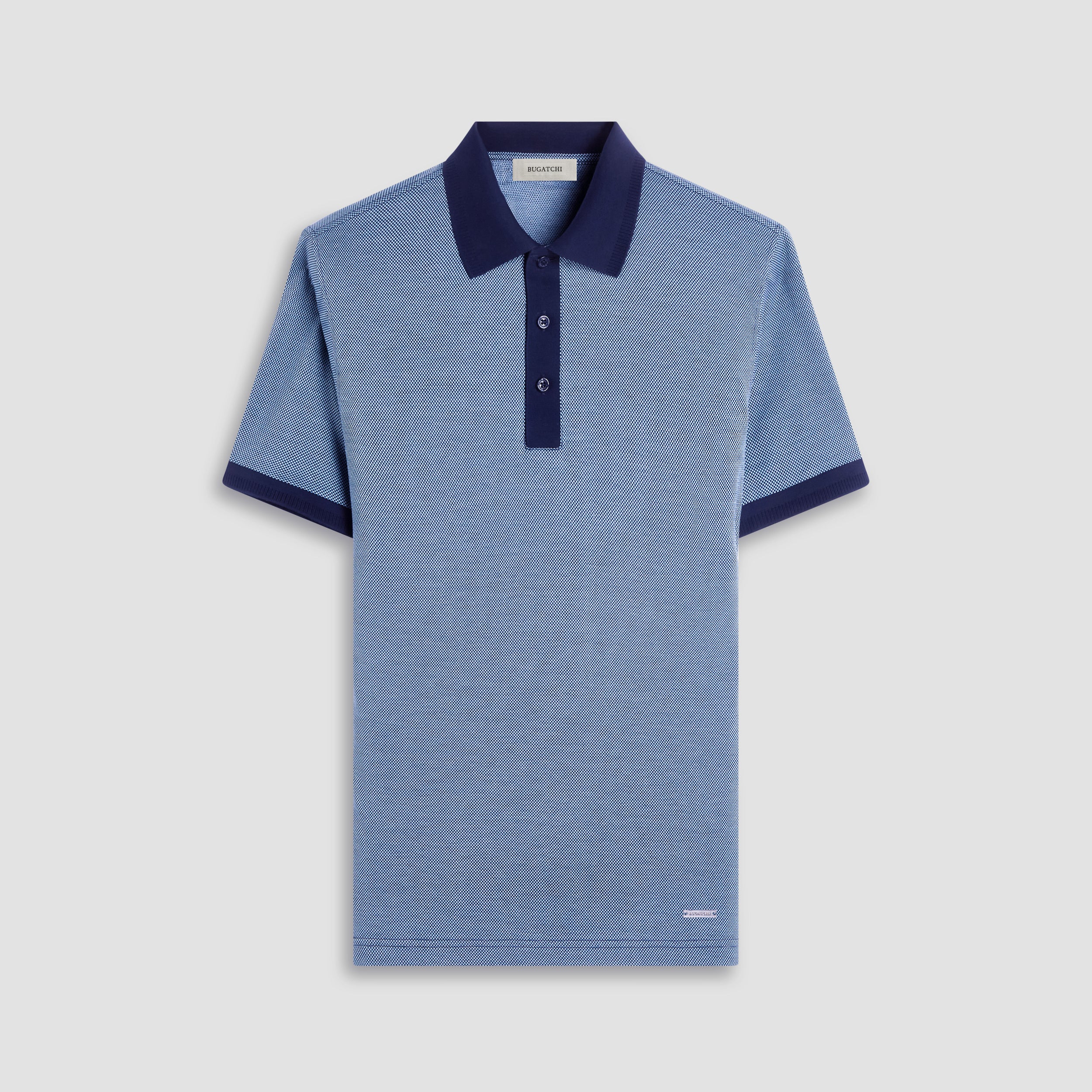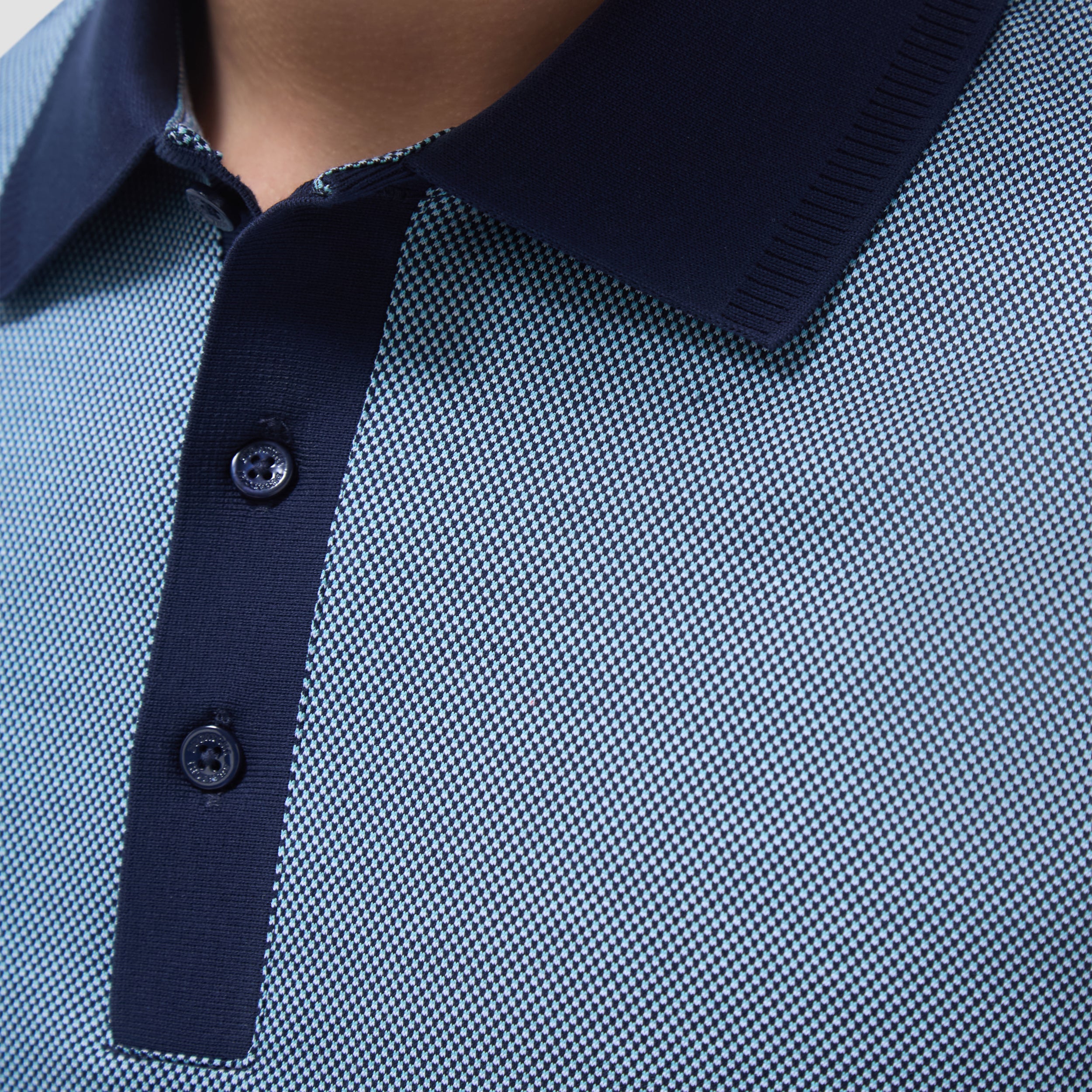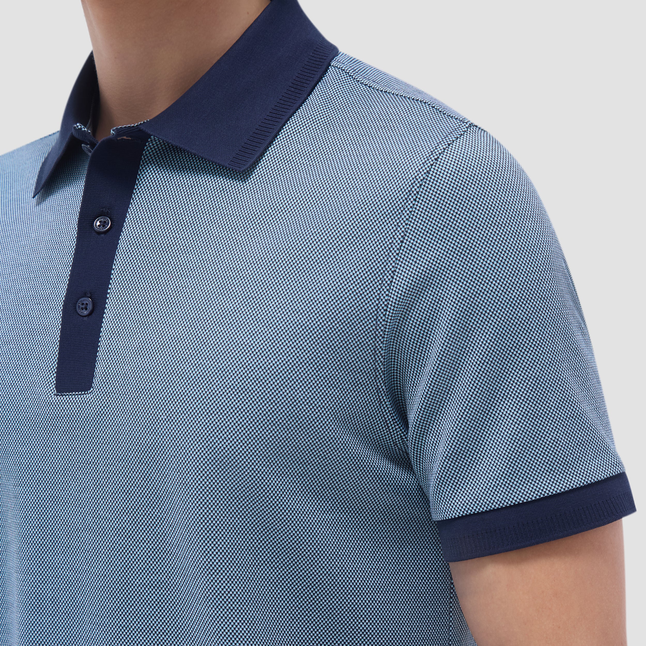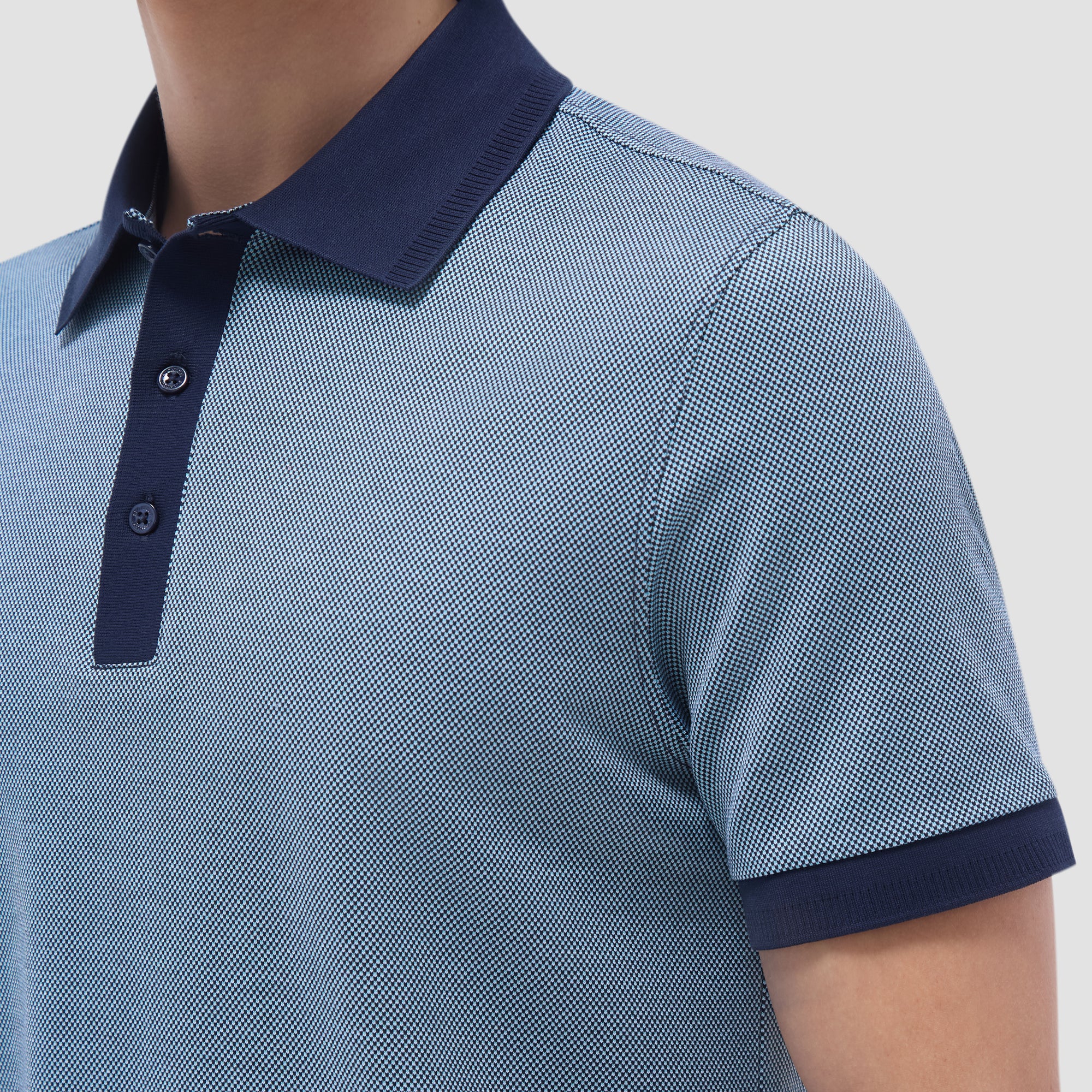 This short-sleeve polo shirt is crafted from 100% mercerized cotton in a two-tone bird's eye pattern, featuring a three button placket, solid ribbed collar, cuffs, and placket for a striking contrast. Mother of pearl buttons add a refined touch, while side vents enhance comfort and breathability. Ideal for both golf and casual wear, this polo seamlessly blends performance with sophisticated style.