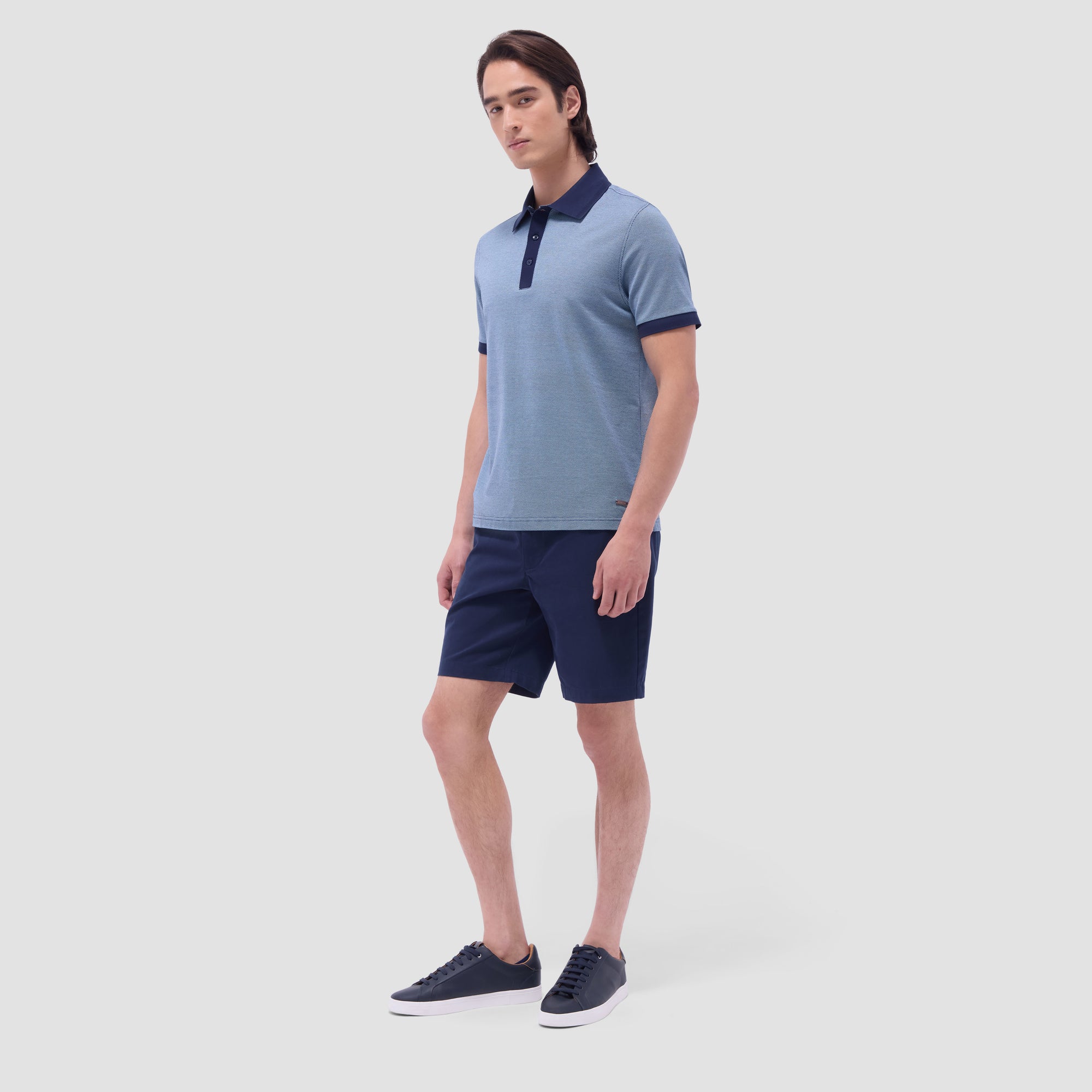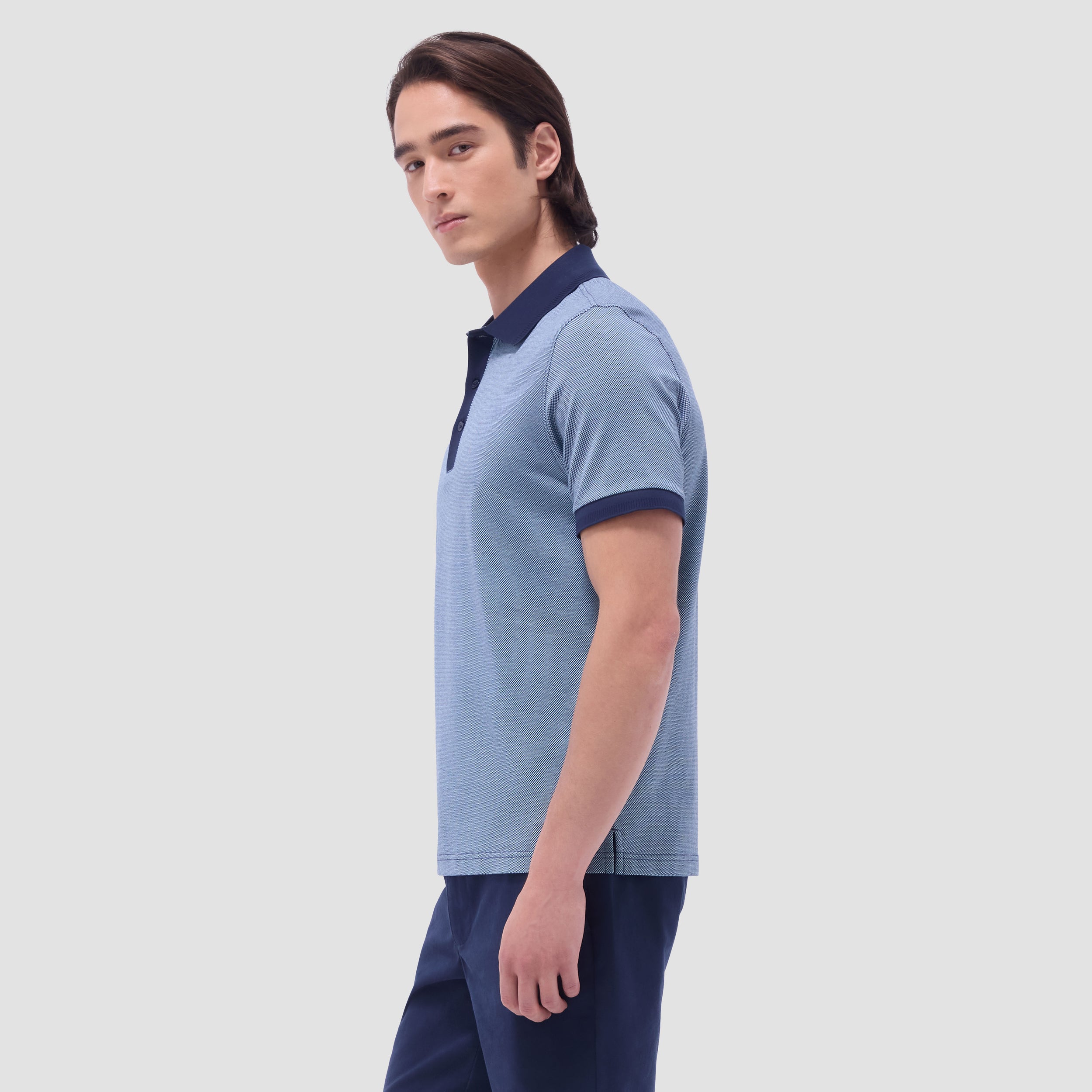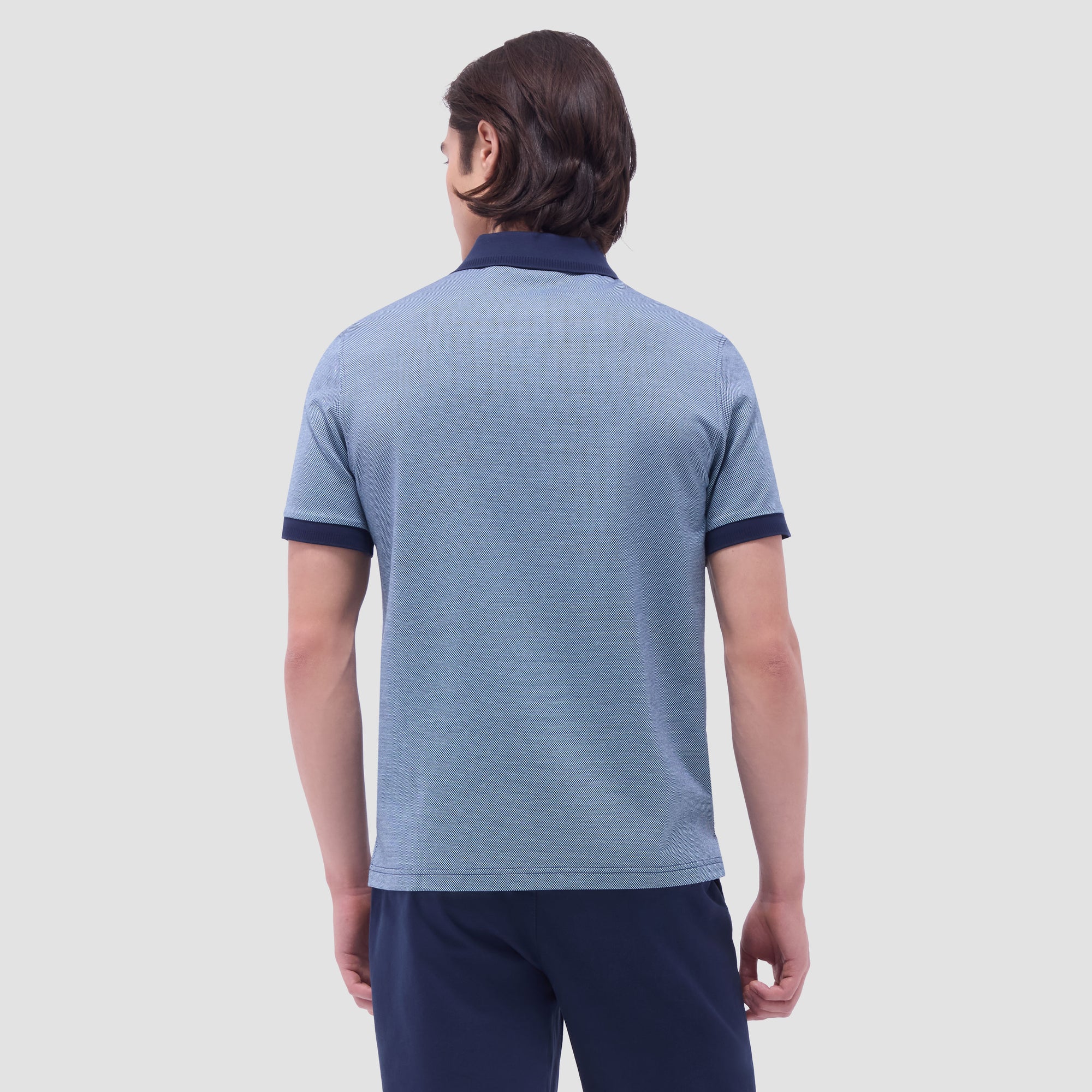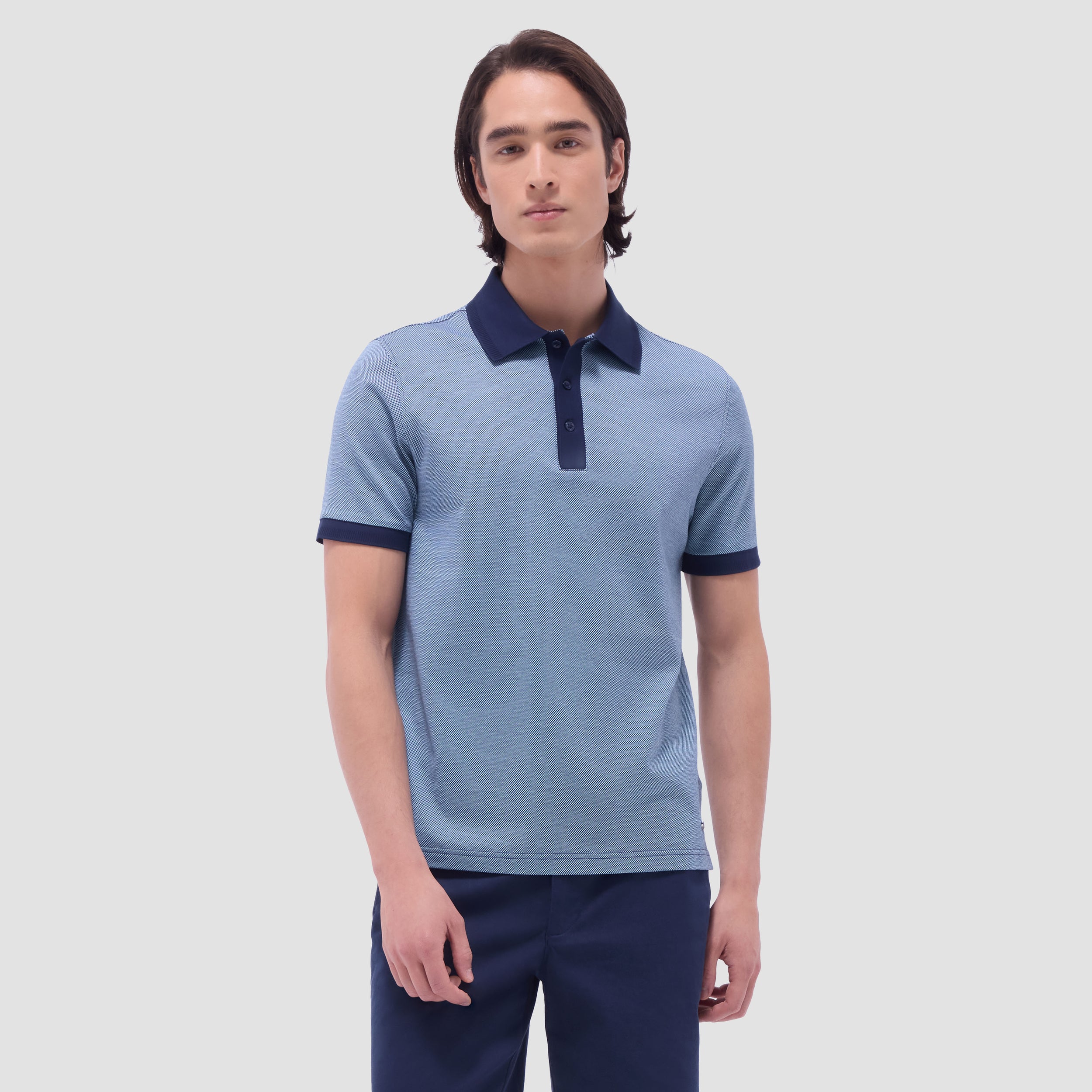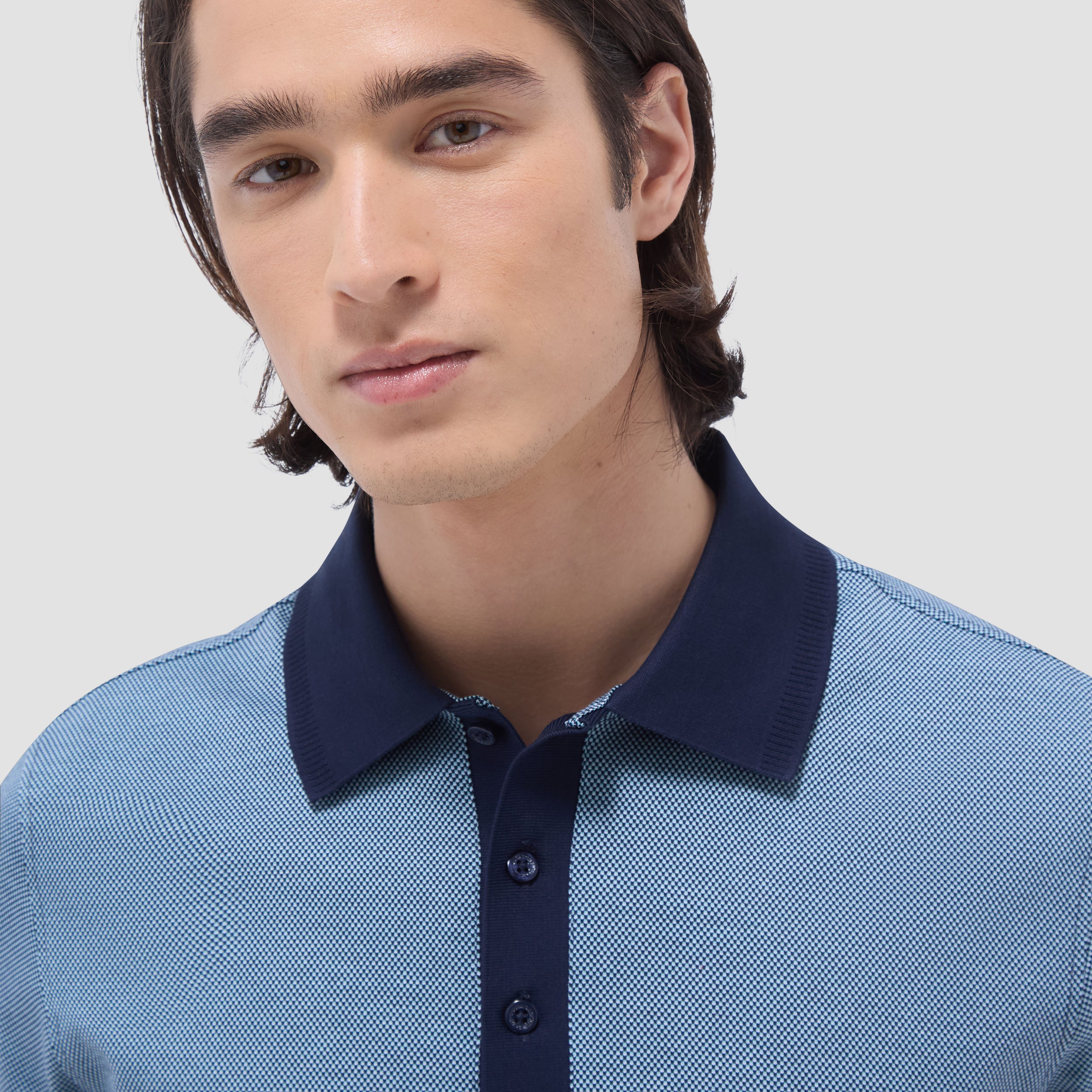 This short-sleeve polo shirt is crafted from 100% mercerized cotton in a two-tone bird's eye pattern, featuring a three button placket, solid ribbed collar, cuffs, and placket for a striking contrast. Mother of pearl buttons add a refined touch, while side vents enhance comfort and breathability. Ideal for both golf and casual wear, this polo seamlessly blends performance with sophisticated style.