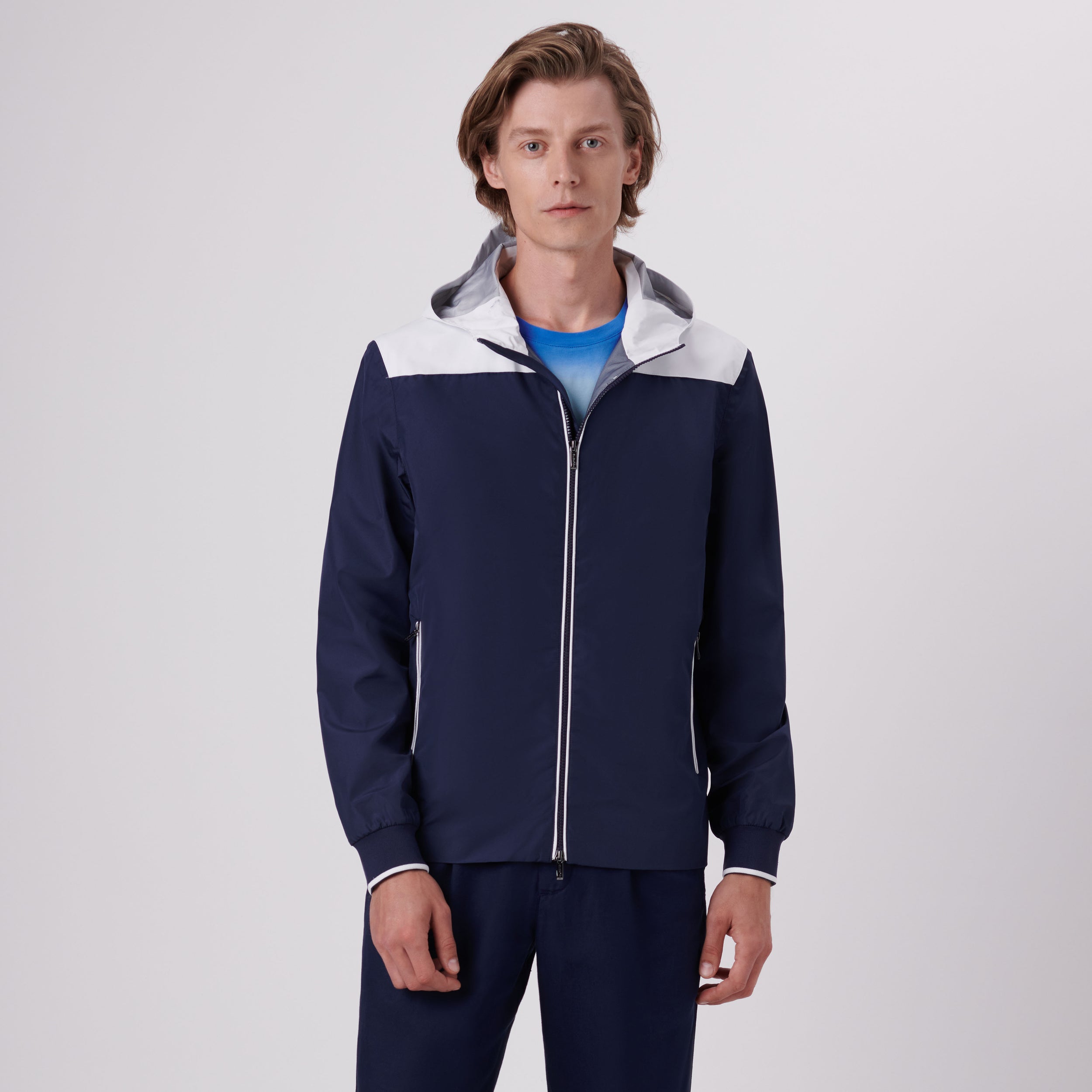 Two-tone bonded nylon windbreaker jacket with zipper side pockets, rib knit cuffs with tipping detail, two-way full zipper closure and hood.